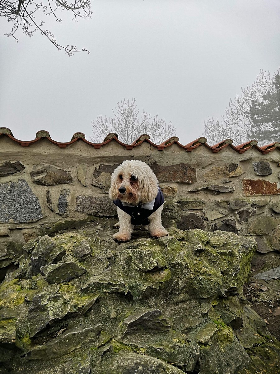 Luky poseděl na lavičce, rázem jsem z něj bezhlavého rytíře udělala. Mezitím Maggie jakoby nám chtěla říci, že pánem hradu je ona, se vyšplhala pod hradby hradu.