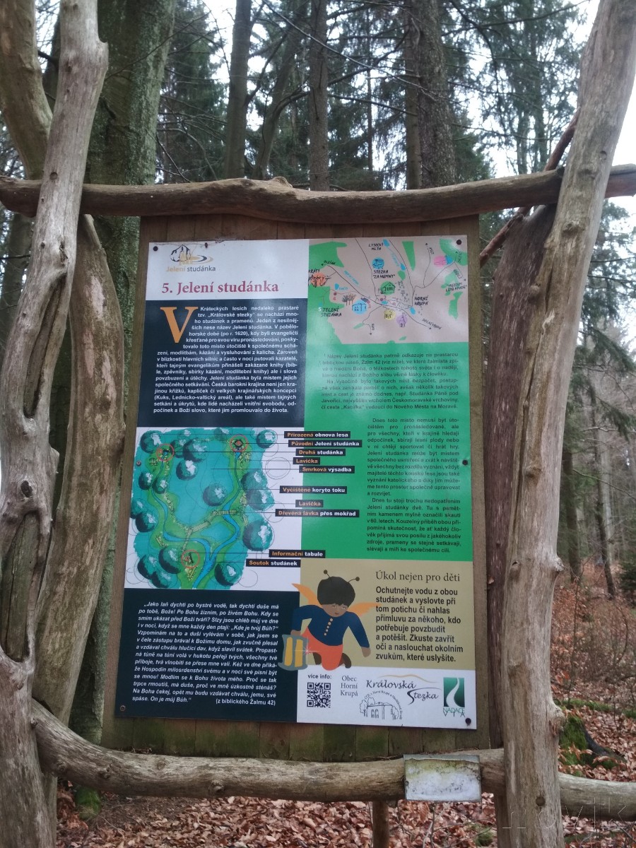 Je nedělní slunné ráno. Už vím, kam se vydám. Hned po obědě odjíždíme kousek autem k rozcestí,,kudy vede naučná stezka. Sluníčko se schovalo, ale to nás neodradilo jít dál. Cestou,,která je rozježděná po těžbě dřeva těžkou technikou .Ani těmto lesům se kůrovec nevyhnul, i když zde lesy ještě nejsou tak úplně suché. Jediné, co vím, že tady někde je krásná Jelení a Svatohubertská studánka. Tak hurá za nimi.
