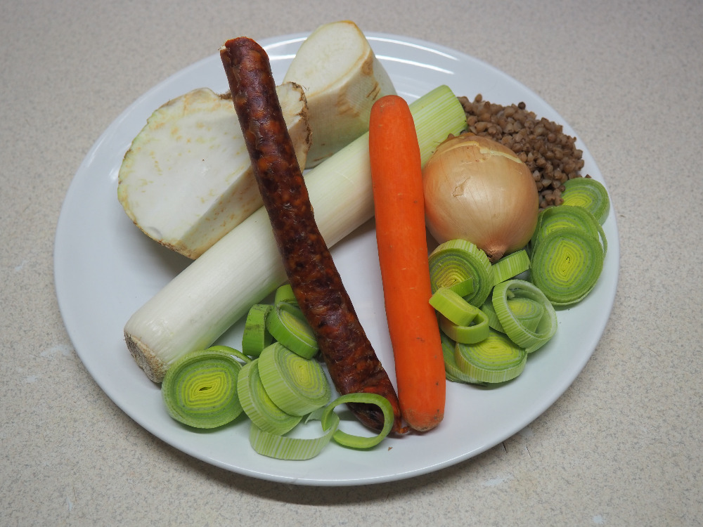 Suroviny: čerstvý pórek, polévková lžíce másla nebo oleje, cibule, mrkev, kousek petržele a celeru, 2 střední brambory, 1 polévková lžíce hladké mouky, dle uvážení pikantní papriková klobáska nebo cigáro (kvalita výrazně ovlivní konečnou chuť polévky), sůl
