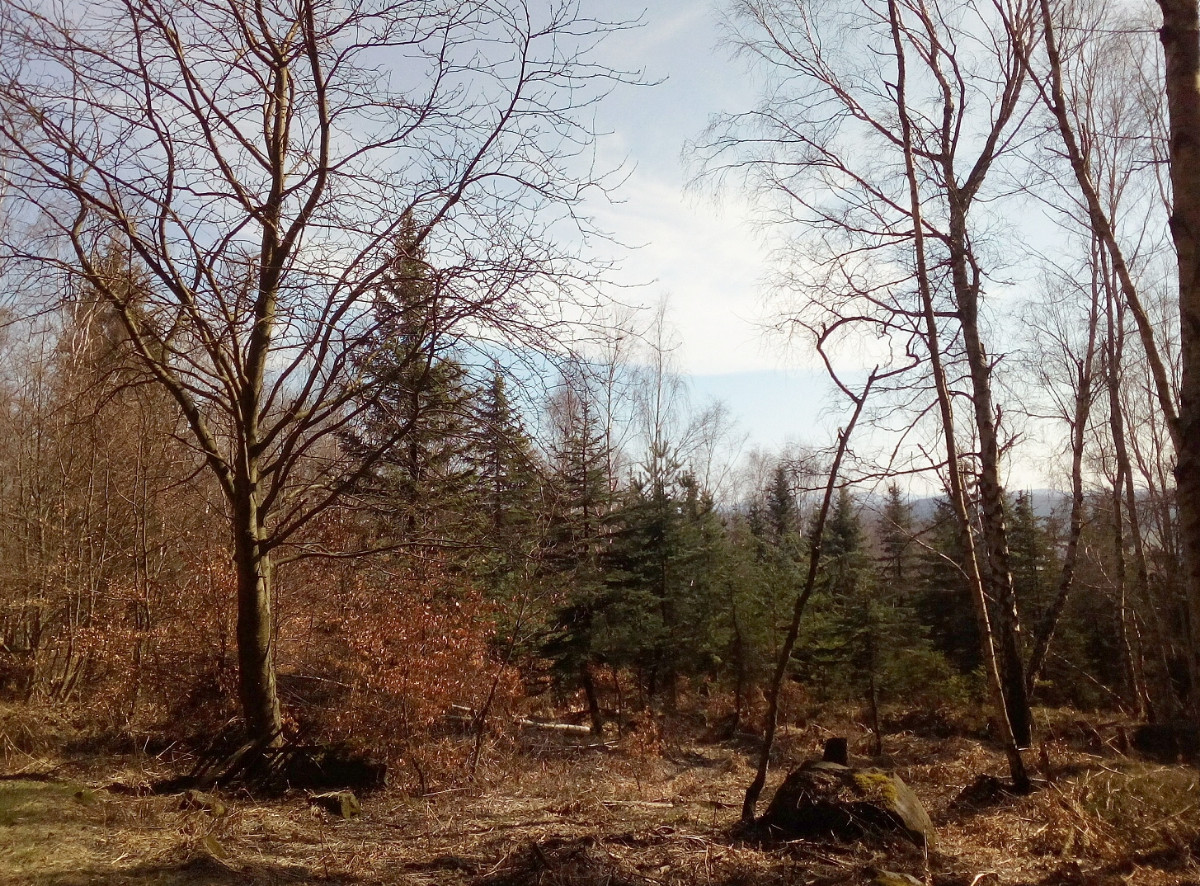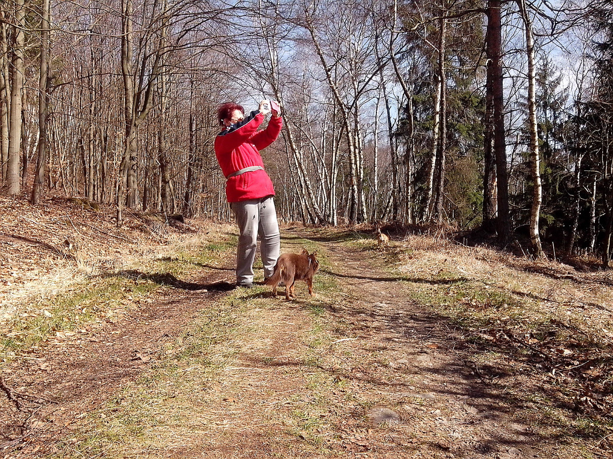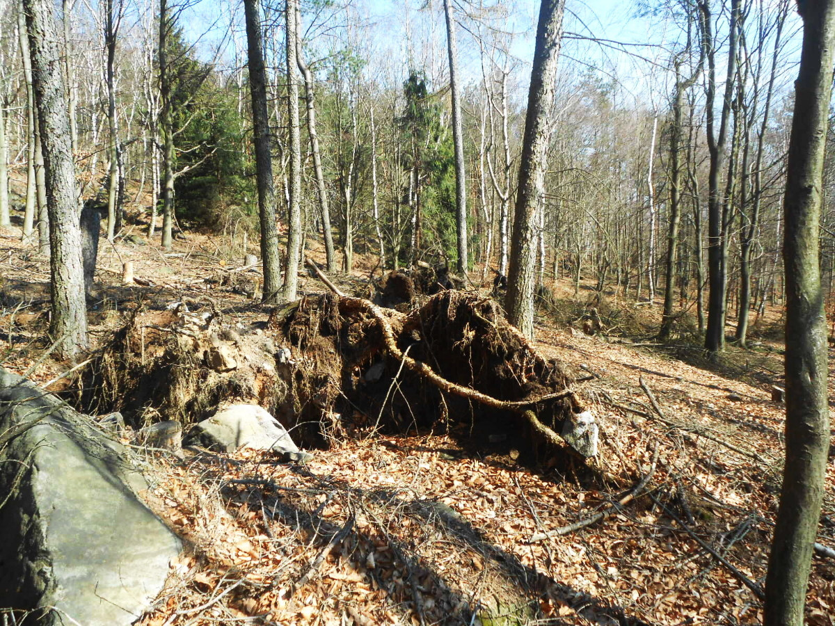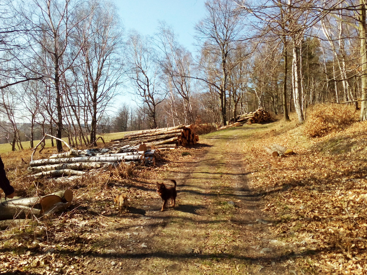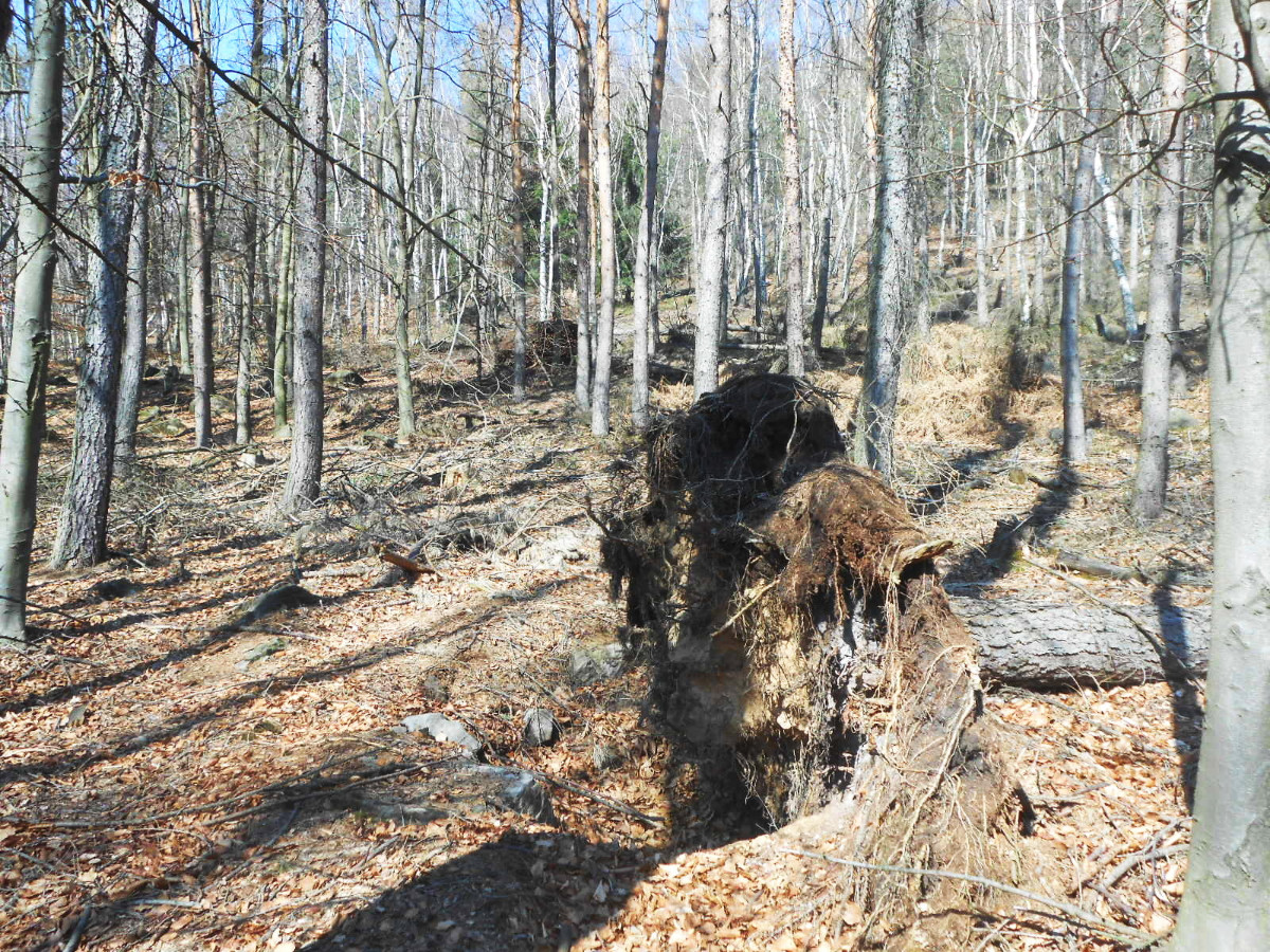 Krásné nedělní dubnové odpoledne nás opět vyhnalo do přírody. Tentokrát jsme zvolili les. Je to les v Tiských skalách, kam chodíváme na podzim na houby. Terén je to spíš pro kamzíky, takže jsme tentokrát šli jen po cestě. Příroda a zima se k lesu nezachovaly moc přívětivě. Vítr způsobil polomy, všude spousta větví a listí. Listí je v pořádku, je to smíšený les, ale s vyvrácenými stromy budou mít lesníci dost práce.