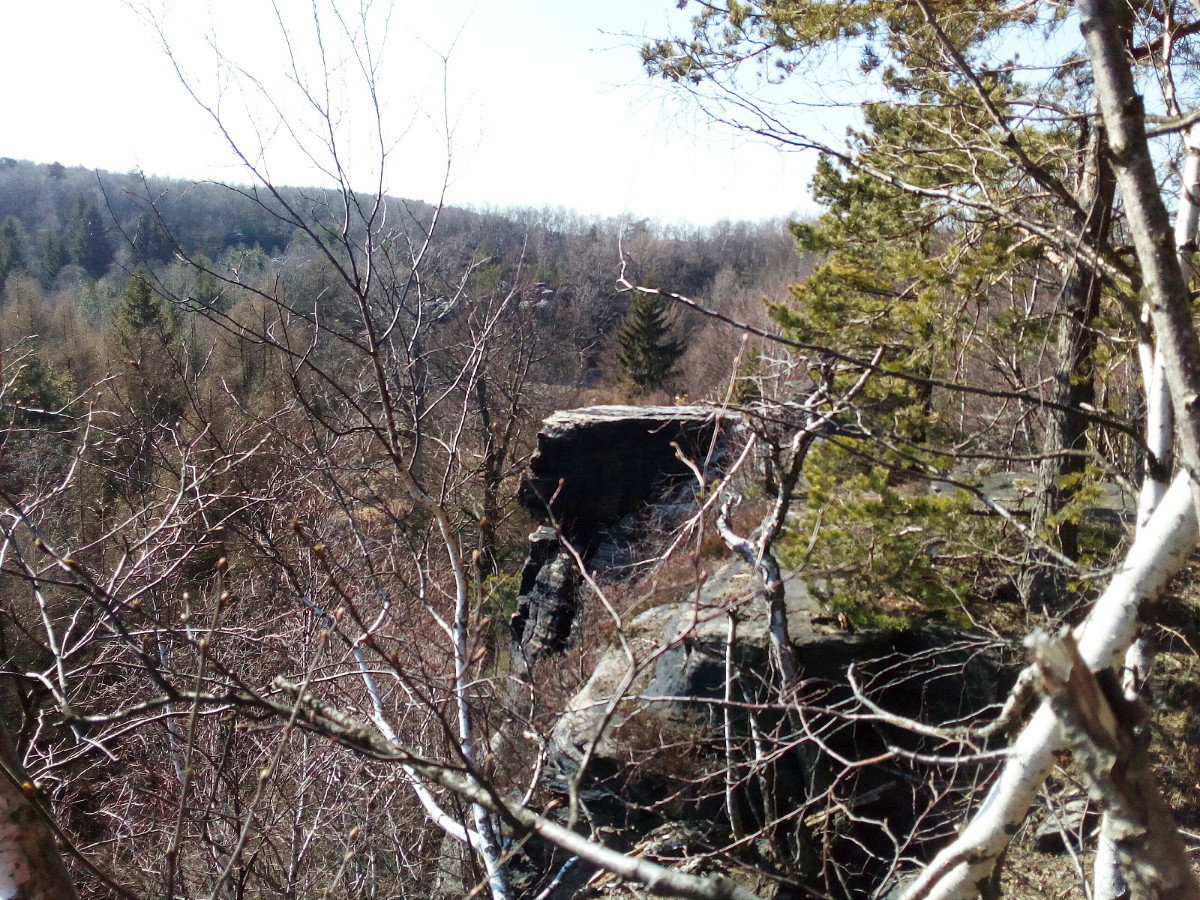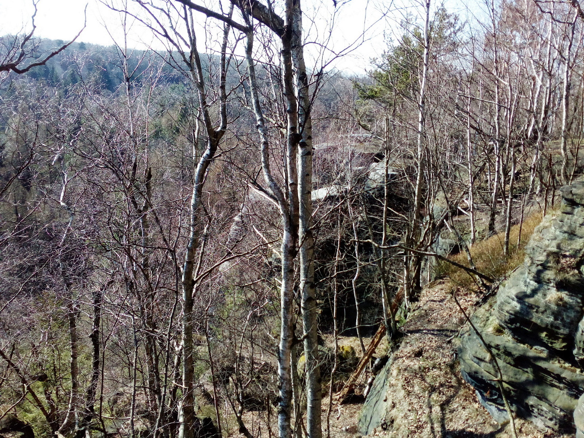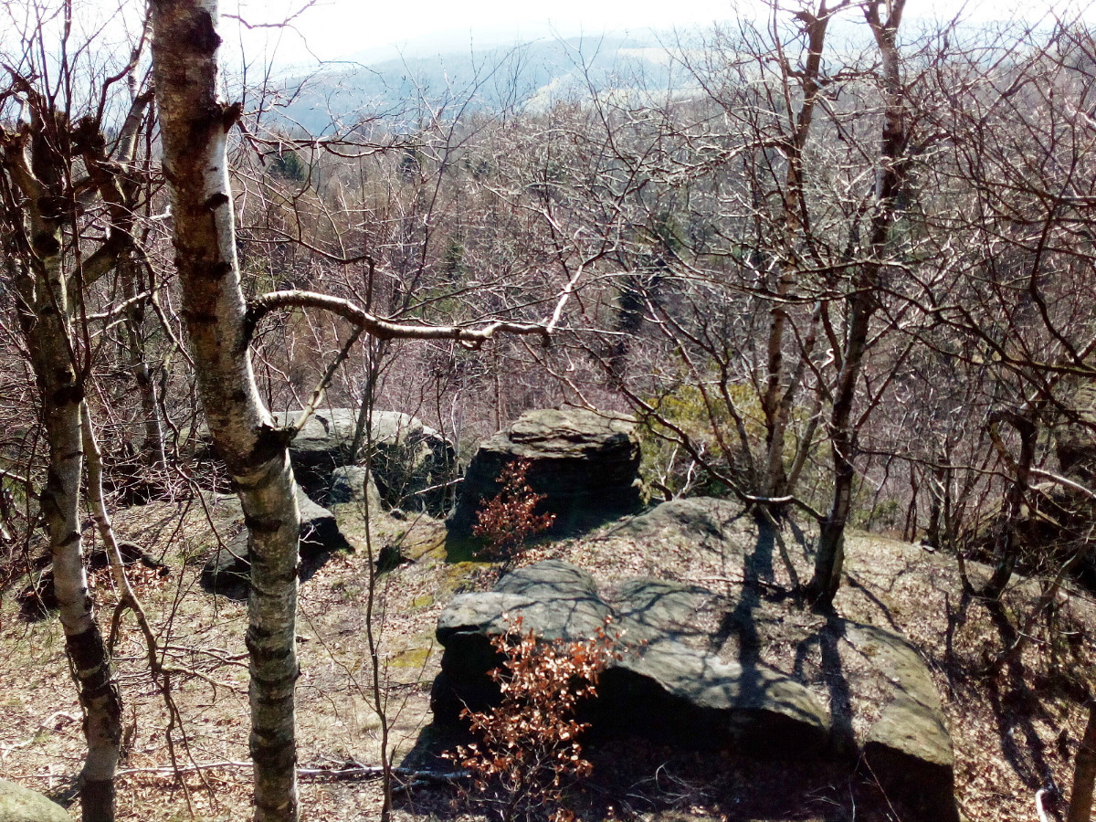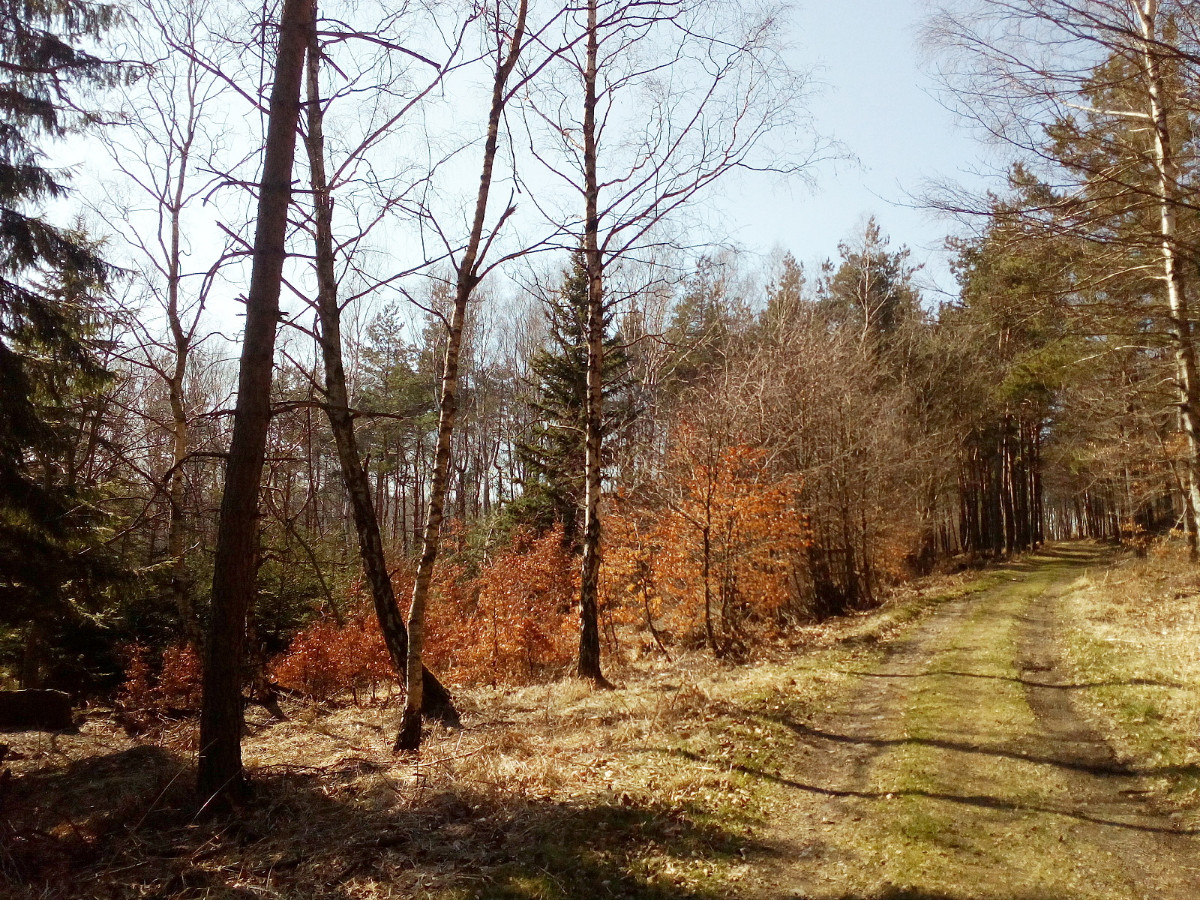Krásné nedělní dubnové odpoledne nás opět vyhnalo do přírody. Tentokrát jsme zvolili les. Je to les v Tiských skalách, kam chodíváme na podzim na houby. Terén je to spíš pro kamzíky, takže jsme tentokrát šli jen po cestě. Příroda a zima se k lesu nezachovaly moc přívětivě. Vítr způsobil polomy, všude spousta větví a listí. Listí je v pořádku, je to smíšený les, ale s vyvrácenými stromy budou mít lesníci dost práce.