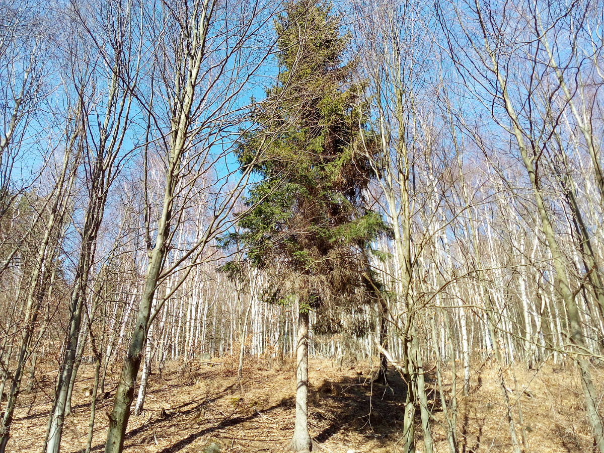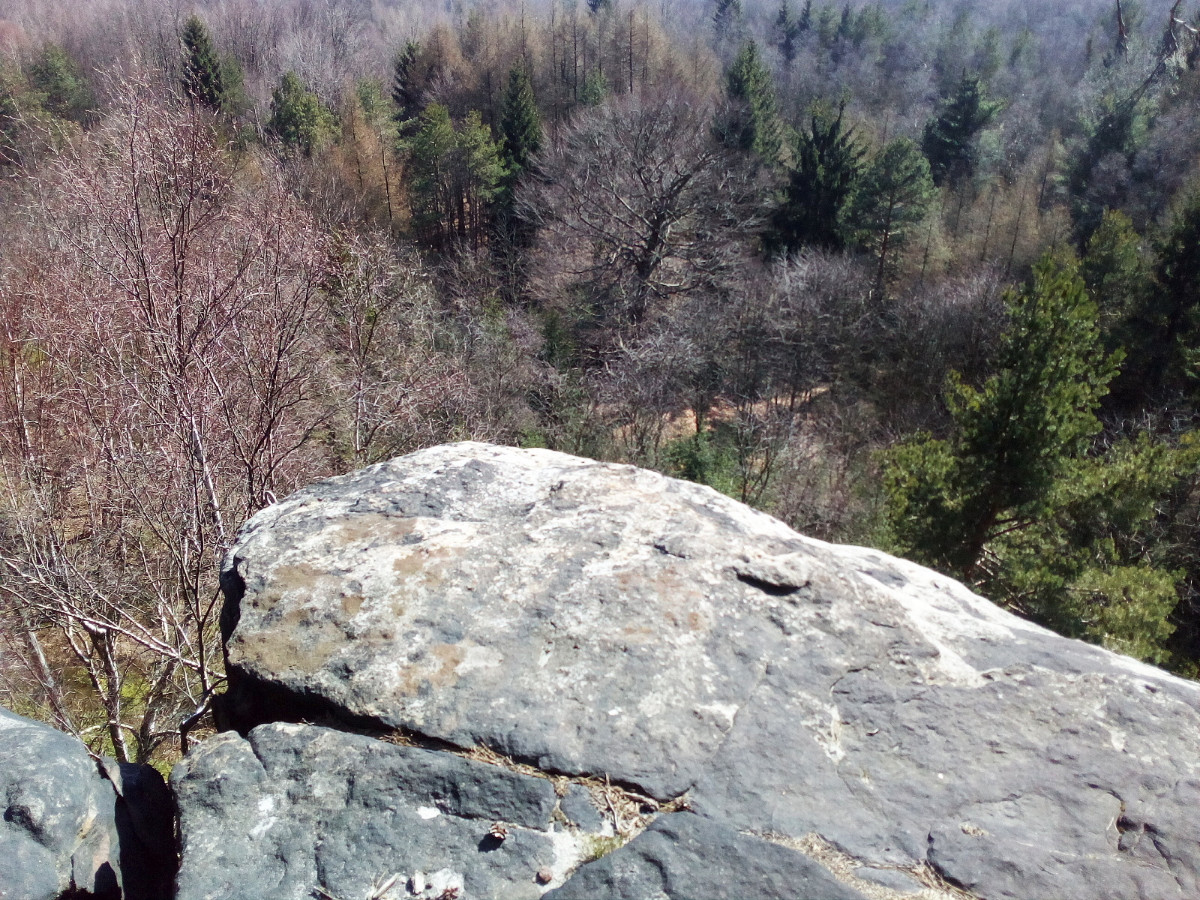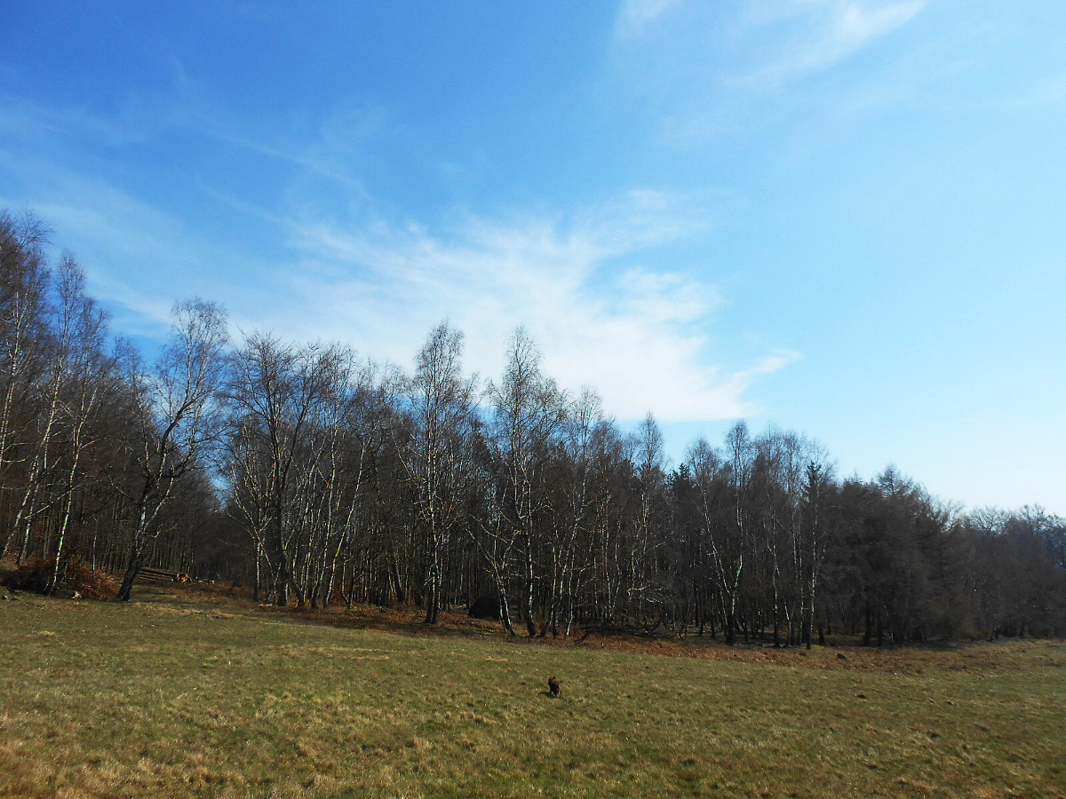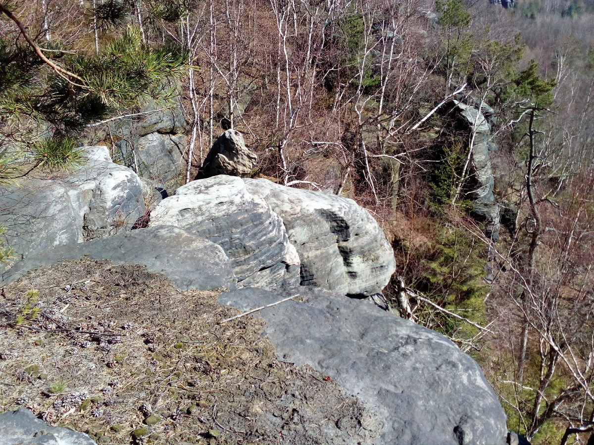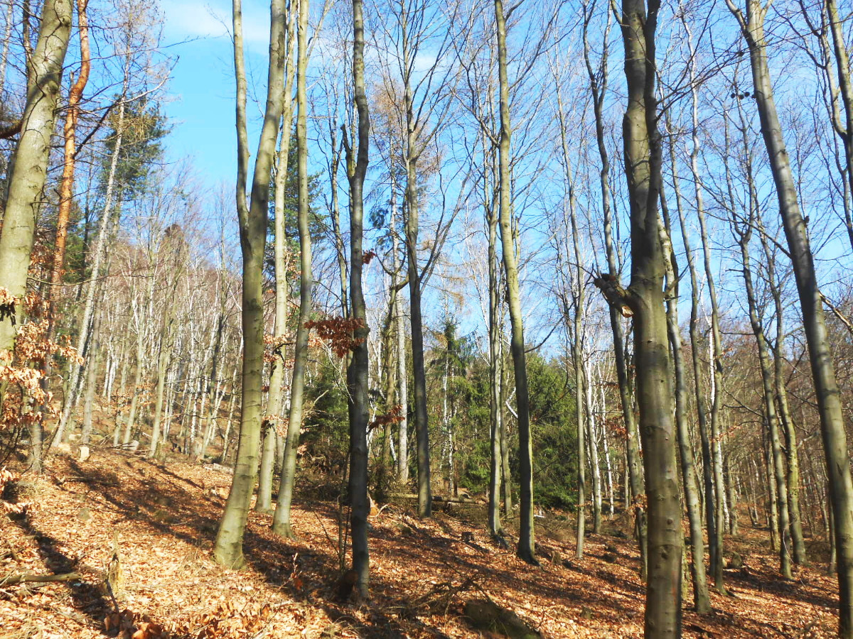 Krásné nedělní dubnové odpoledne nás opět vyhnalo do přírody. Tentokrát jsme zvolili les. Je to les v Tiských skalách, kam chodíváme na podzim na houby. Terén je to spíš pro kamzíky, takže jsme tentokrát šli jen po cestě. Příroda a zima se k lesu nezachovaly moc přívětivě. Vítr způsobil polomy, všude spousta větví a listí. Listí je v pořádku, je to smíšený les, ale s vyvrácenými stromy budou mít lesníci dost práce.
