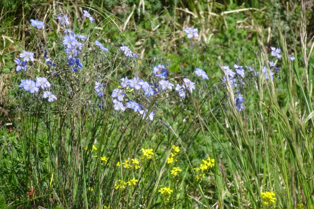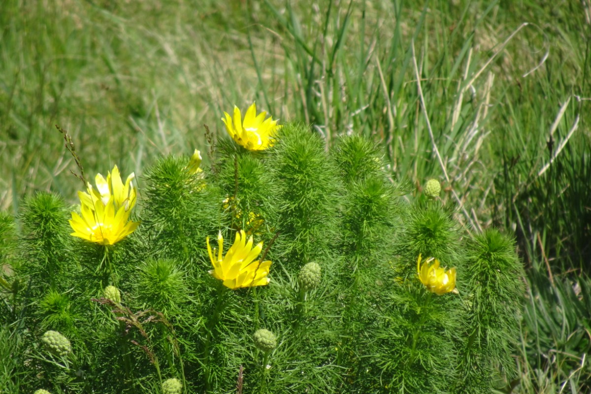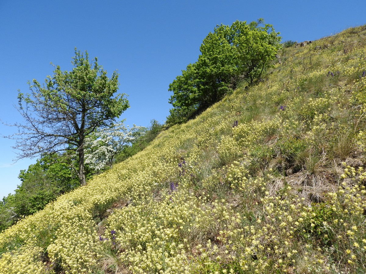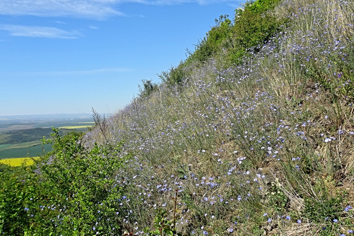 Sestup z Oblíku po druhé straně je pohodlný a za chvíli jste dole. Turistická značka zatáčí doleva do Mnichova, ale neznačená cesta vede dál loukami k Srdovu. Cestou nacházím v porostu několik divizen brunátných. Cesta se pozvolna mění v sotva znatelnou, ale zjevně používanou cestičku. Chvíli přemýšlím, jestli tudy chodí jen zajíci nebo taky lidi a v tom se za Srdovem objeví třetí vrchol v řadě - Brník. Tady zjišťuji, že do sedla mezi Srdovem a Brníkem vede další cesta od Chraberců. Dávám se po ní a v sedle si zavýsknu, protože se mi zdá, že vyběhnout si odtud na Brník je brnkačka. Leč stejně jako u Srdova, výstup na úplný vrchol vzdávám těsně před cílem při vědomí, že mám ráda svoje kosti všechny pěkně pohromadě a nepolámané. Chtělo by to příště vzít na výlet i turistické hůlky. Vůbec mě to nemrzí, protože Brník tone ve žluti, protkané vkusně vlajícími stříbřistými vlasy kavylu.