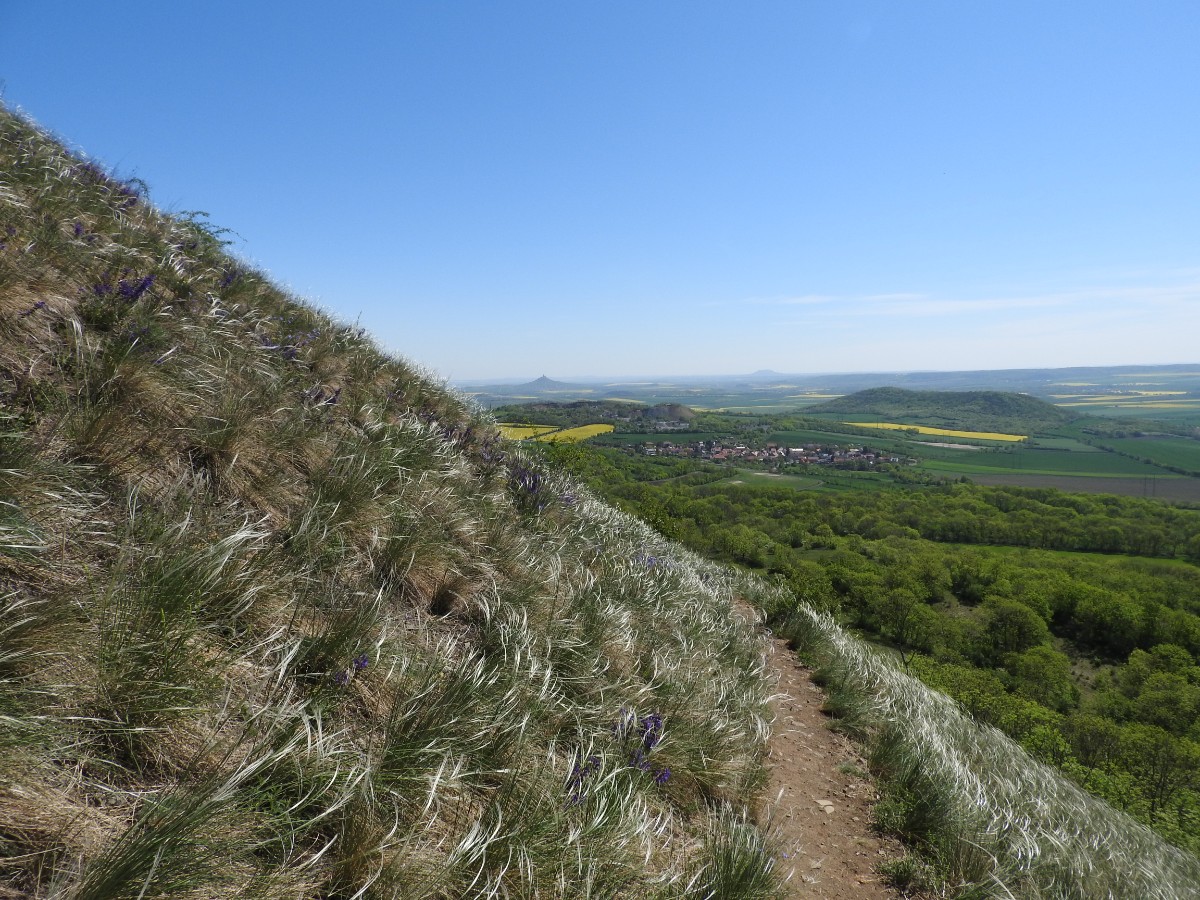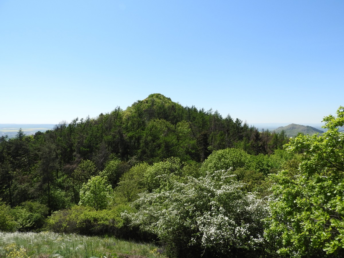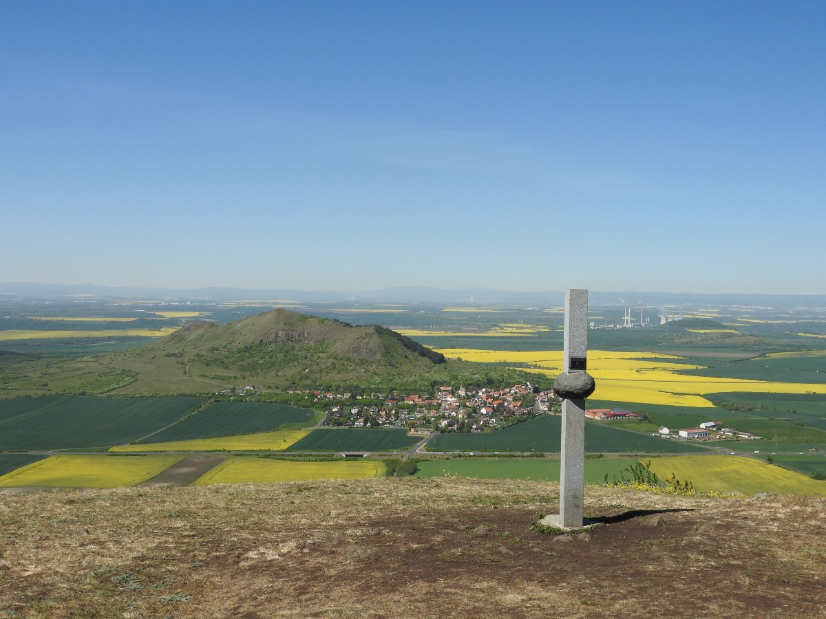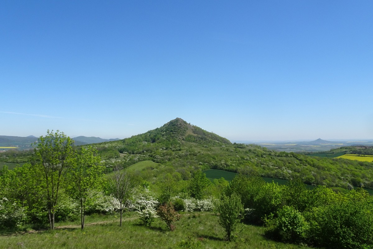 Můj výlet započal u autobusové zastávky v obci Raná, ze které máte Oblík pěkně před sebou a víte, do čeho jdete. Poté, co překonáte živou silnici, pustíte se polní cestou k hoře. Zvolna stoupáte už odkvetlými starými třešňovými sady vzhůru. Cesta se stáčí doprava a brzy narazíte na zelenou turistickou značku od Loun. Kamenitá cestička se zužuje a kroutí jako hádě. A co je hlavní, nutí vás zhluboka dýchat a nabírat do plic rozmanité jarní vůně. Oči nemůžete odtrhnout od neuvěřitelné směsi barev. Nahoře kvete poslední trs hlaváčků. Nezapomeňte se zastavit u energetického bodu a vyzkoušet jeho sílu. Vrchol nabízí překrásné pohledy na České středohoří a jižně na Louny. K západu jako na dlani máte další magické kopce - Ranou a Milou. Východním směrem do střapatého středohorského obzoru míří další dva kopce, s Oblíkem tvořící řadu - Srdov (482 m) a Brník (371 m). Sedím v suché trávě, popíjím kávu z termosky, dělím se s mravenci o svačinu, kolem poletuje otakárek. Nemůžu se vynadívat a rázem se rozhoduji prozkoumat, jestli se dají Srdov s Brníkem obejít. Na Srdov jsem se už jednou pokoušela vylézt, ale přiznám se, že od vrcholových skalisek jsem se vrátila zpátky dolů.