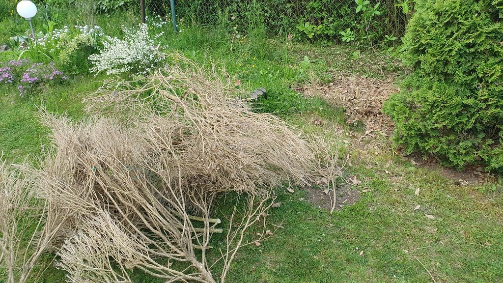Tak jsem se poučila, že se nic nemá přehánět a k přírodě se musí chovat slušně, citlivě a ohleduplně. A tam, kde dříve byla pouze krásná louka na pastvu, necpat přemíru nějakých cizorodých buxusů. Suchý buxus jsme tedy podřízli jak podsvinče a poslouží v ohništi, až budeme opékat buřty (vnoučci se při té zprávě převelice zaradovali a psali mi: Mňam, už se těšíme ! ) A kašlali na mou nostalgii po buxusu, buřty jsou buřty.