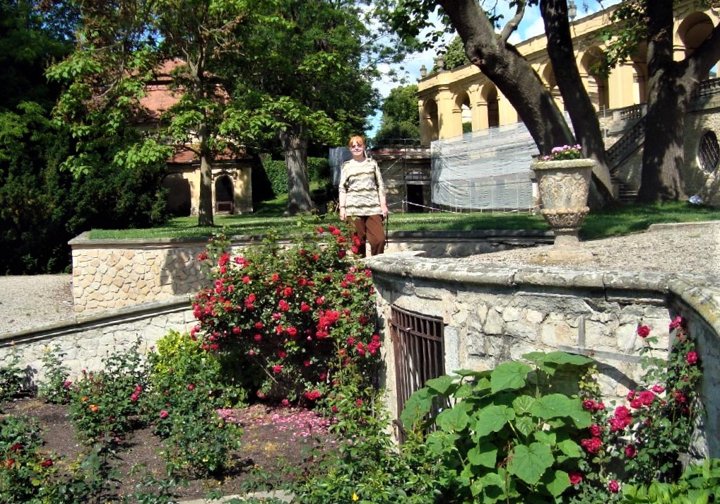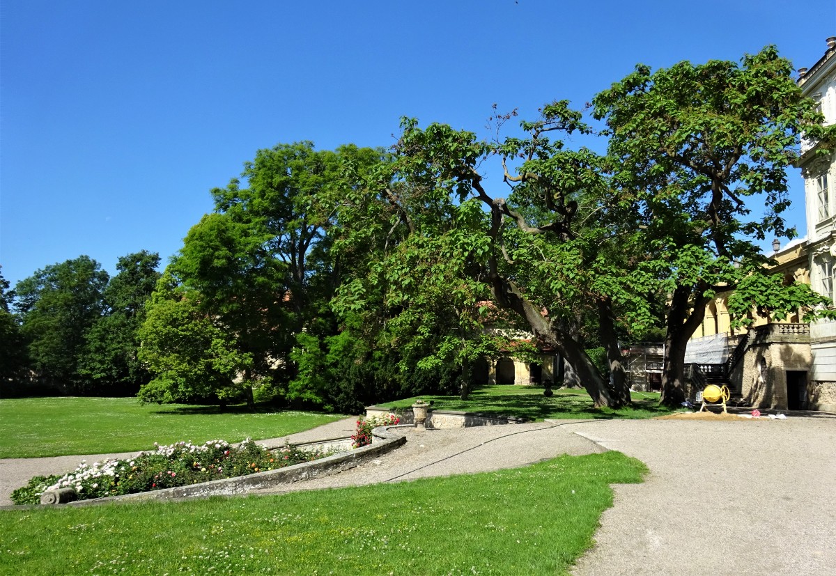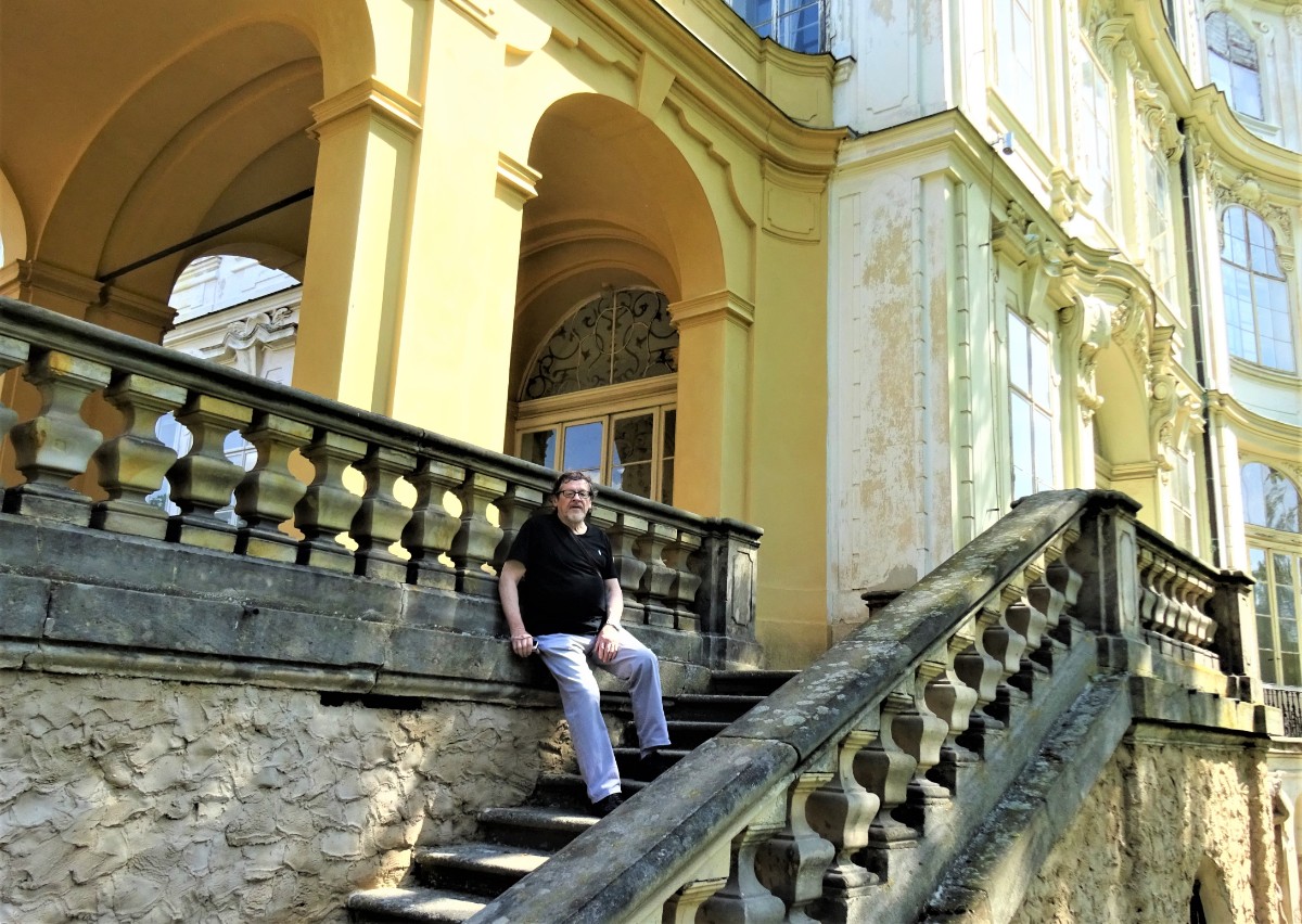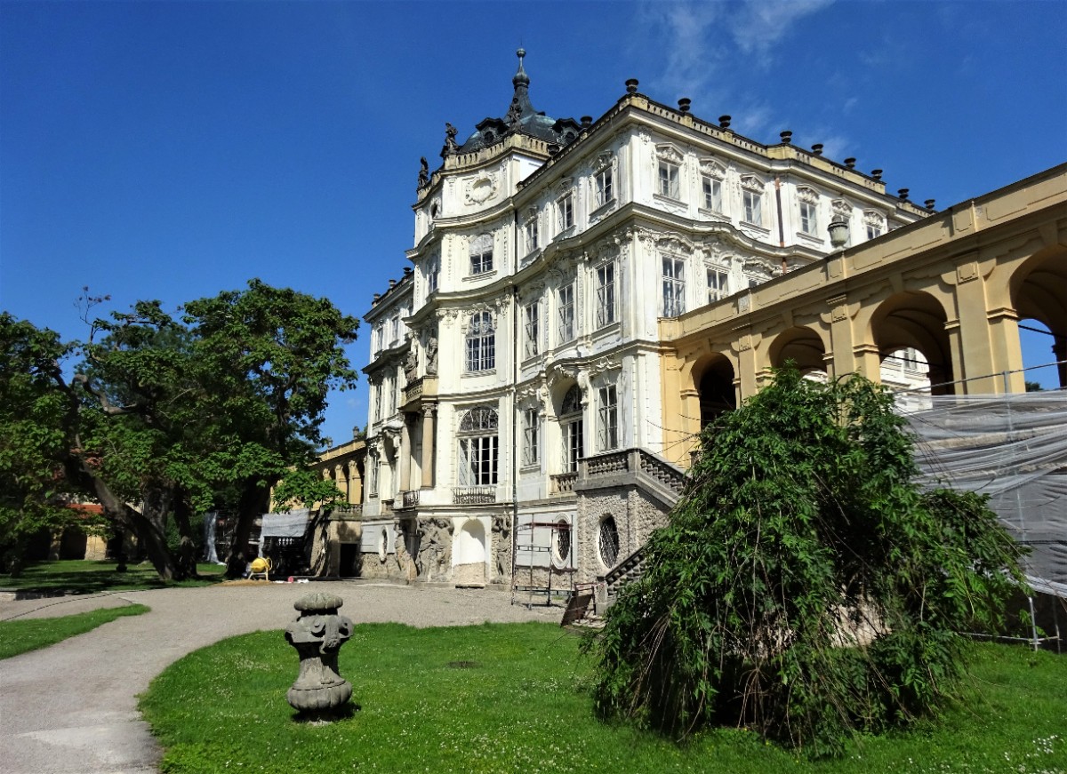 Můj průvodce prožil okamžik hlubokého zklamání při zjištění, že zámek se opravuje, a neuvidím ho tedy v celé jeho nádheře. Uznal ale také, že je to lepší, než kdyby dále chátral. I tak jsem ho viděla velkou část. Moc se mi líbil. Okouzlil mě i členitý park s řadou dekorativních prvků. Pávi nás většinou míjeli bez zájmu; pouze jeden dostál svému poslání a naparoval se jaksepatří. Prohlídku jsme zakončili opět u výborné kávy. Snažili jsme se, aby na fotkách pokud možno nebyly plachty, ohrady, míchačka a další předměty nezbytné při rekonstrukci budovy.