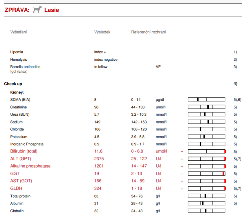Naše Lassie tedy dostala antibiotika s tím, že o dalším postupu se rozhodne z výsledků krve. Ty prokázaly selhání jater, v několika parametrech byly jaterní testy na hranici „únosnosti“. Fenka tak musela zůstat v ordinaci na vyčištění krve – dostala několik infuzí tři dny po sobě. Po čtrnácti dnech na antibiotikách následovaly další testy, které prokázaly jen mírné zlepšení jaterních testů, a tak následovaly další infuze a další léky.