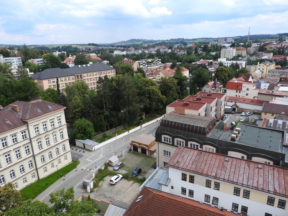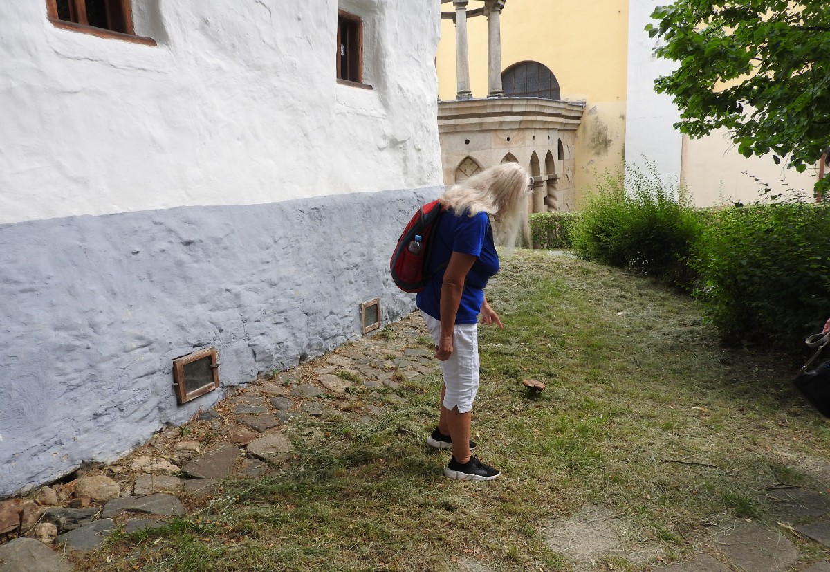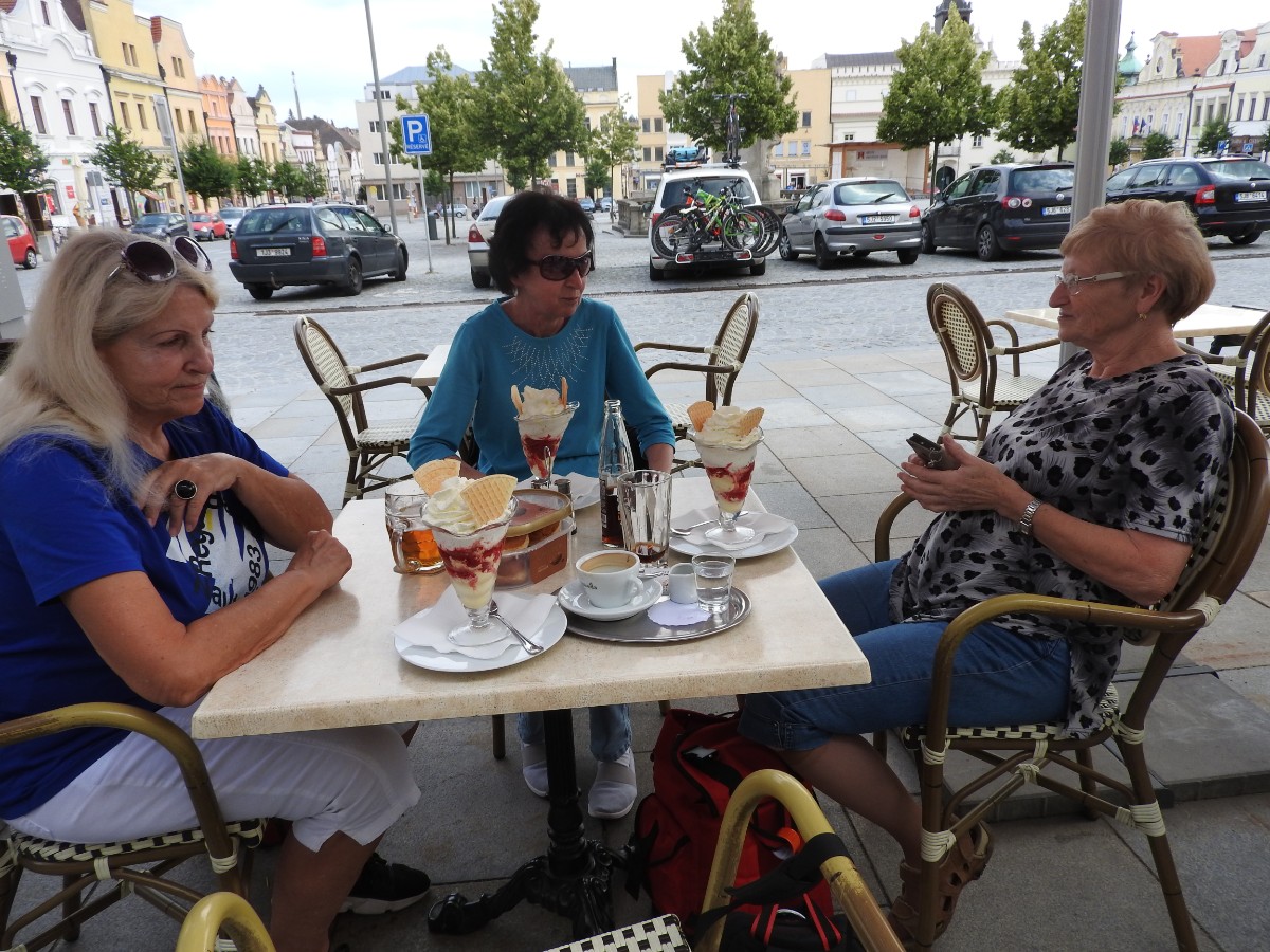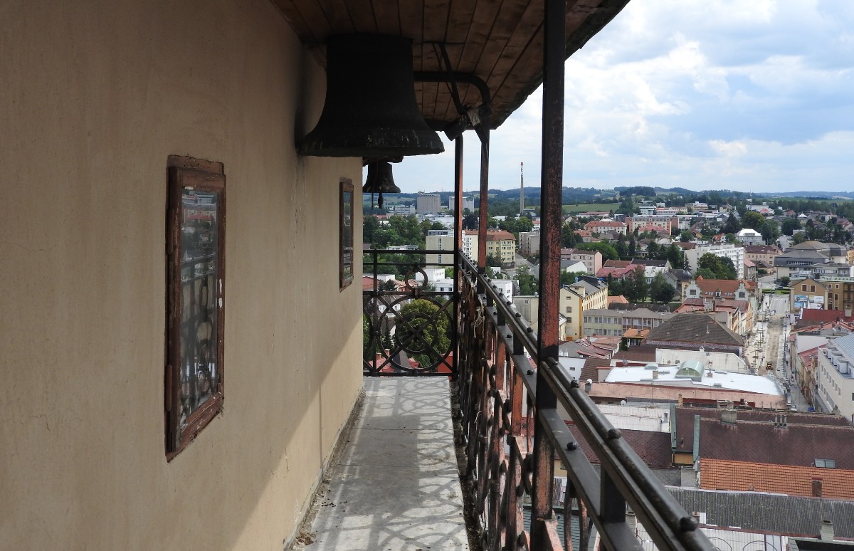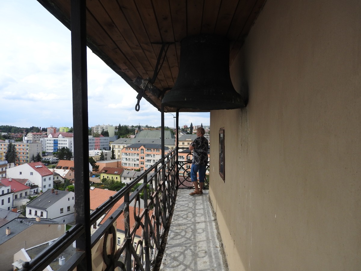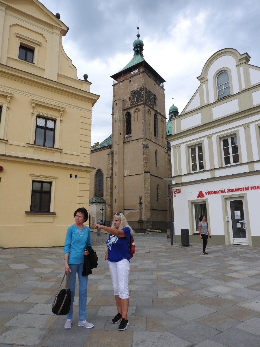 Na nádraží nás čekalo nejen sluníčko, ale také dvě usměvavé a dobře naladěné domorodkyně a procházka Havlíčkovým Brodem mohla začít. Podle Sázavy jsme se dostaly k fiktivnímu středu Evropy dle Járy Cimrmana ve tvaru trychtýře, umístěného v malém bludišti. Tady jsme vybalily malé dárečky a prostřely jimi celý stoleček v parčíku pod nádherně rozkvetlou a voňavou pavlonií plstnatou. Trochu nám kručelo v žaludcích a jejich hlasové projevy jsme umlčely v Kozlovně. Pokračovaly jsme procházkou po městě a už nás čekal domluvený výstup na věž kostela Nanebevzetí Panny Marie. Nahoru vede úzké točité schodiště a výstup s doprovodem a výkladem místostarosty města byl docela dobrodružný. Zastavili jsme se u tří zvonů, z nichž nejstarší Vilém je jedním z nejstarších zvonů u nás. Ulit byl začátkem 14. století, přesný rok se nepodařilo vyluštit. Výhledy z věže nám ukázaly celé město i okolí, na obzoru se rýsuje hrad Lipnice. Zajímavostí je, že v místnůstkách nahoře ve věži byl byt, kde se bydlelo až do roku 1973. Dost dobře si neumím denní provoz představit. Odměnou za namáhavý výstup po 144 schodech byl pohár "horká láska" s malinami. Pak jsme ještě obešly kus Havlíčkova Brodu kolem zdejších památek - Havlíčkova domu, kde je muzeum, Klášterního kostela sv. rodiny s božím hrobem, Štáflovy chalupy a Štáflovy bašty a vydaly se Parkem budoucnosti pomalu zpět na nádraží. Mezitím se palčivé sluníčko schovalo a na nádraží jsme docházely s prvními padajícími kapkami.