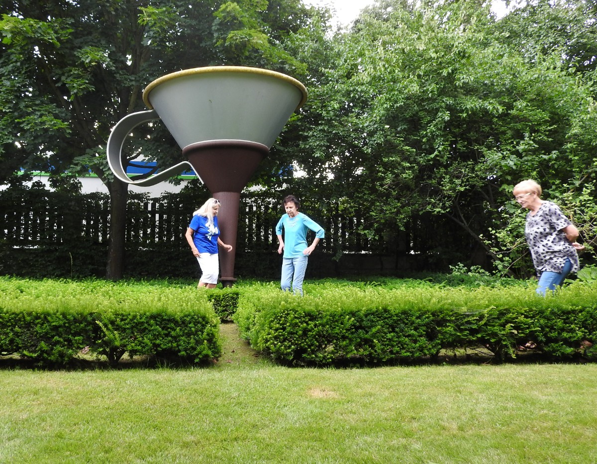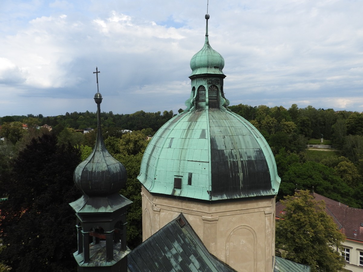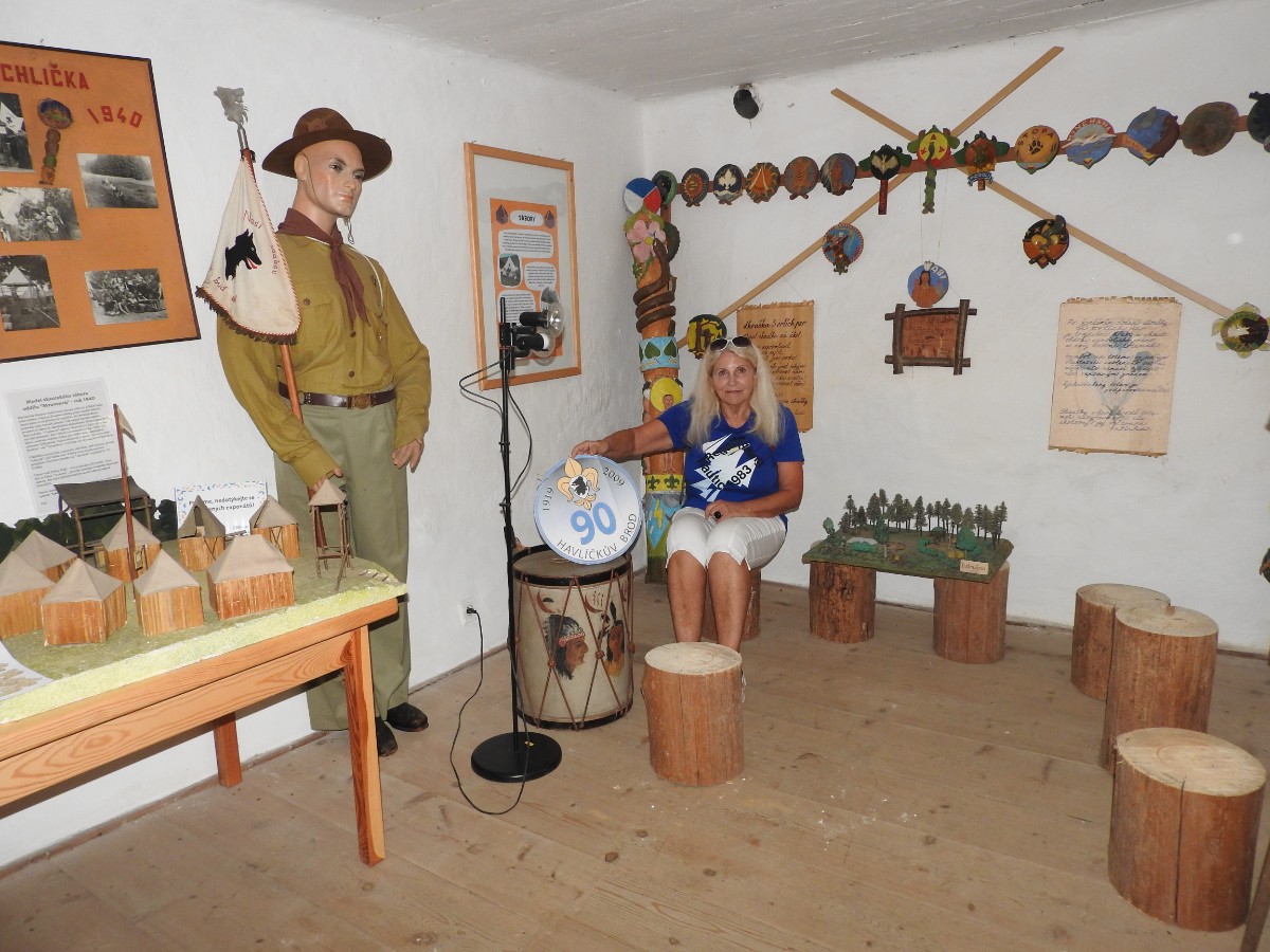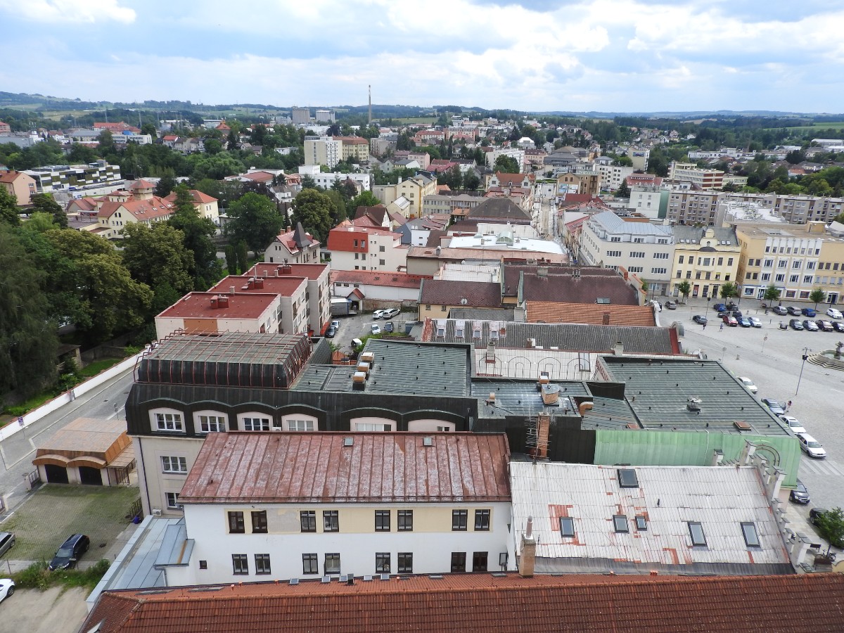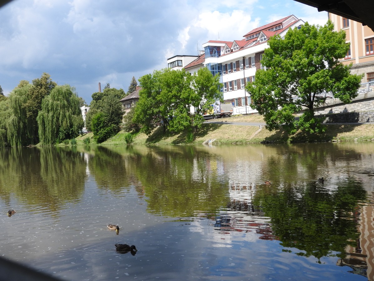 Na nádraží nás čekalo nejen sluníčko, ale také dvě usměvavé a dobře naladěné domorodkyně a procházka Havlíčkovým Brodem mohla začít. Podle Sázavy jsme se dostaly k fiktivnímu středu Evropy dle Járy Cimrmana ve tvaru trychtýře, umístěného v malém bludišti. Tady jsme vybalily malé dárečky a prostřely jimi celý stoleček v parčíku pod nádherně rozkvetlou a voňavou pavlonií plstnatou. Trochu nám kručelo v žaludcích a jejich hlasové projevy jsme umlčely v Kozlovně. Pokračovaly jsme procházkou po městě a už nás čekal domluvený výstup na věž kostela Nanebevzetí Panny Marie. Nahoru vede úzké točité schodiště a výstup s doprovodem a výkladem místostarosty města byl docela dobrodružný. Zastavili jsme se u tří zvonů, z nichž nejstarší Vilém je jedním z nejstarších zvonů u nás. Ulit byl začátkem 14. století, přesný rok se nepodařilo vyluštit. Výhledy z věže nám ukázaly celé město i okolí, na obzoru se rýsuje hrad Lipnice. Zajímavostí je, že v místnůstkách nahoře ve věži byl byt, kde se bydlelo až do roku 1973. Dost dobře si neumím denní provoz představit. Odměnou za namáhavý výstup po 144 schodech byl pohár "horká láska" s malinami. Pak jsme ještě obešly kus Havlíčkova Brodu kolem zdejších památek - Havlíčkova domu, kde je muzeum, Klášterního kostela sv. rodiny s božím hrobem, Štáflovy chalupy a Štáflovy bašty a vydaly se Parkem budoucnosti pomalu zpět na nádraží. Mezitím se palčivé sluníčko schovalo a na nádraží jsme docházely s prvními padajícími kapkami.