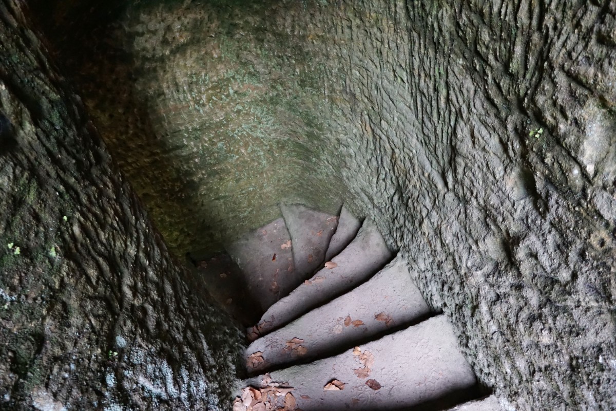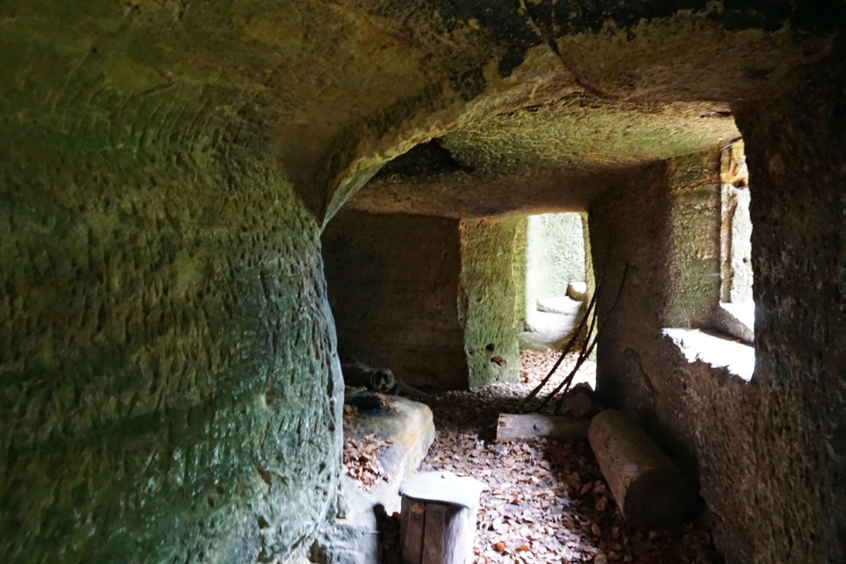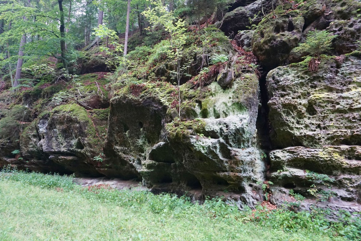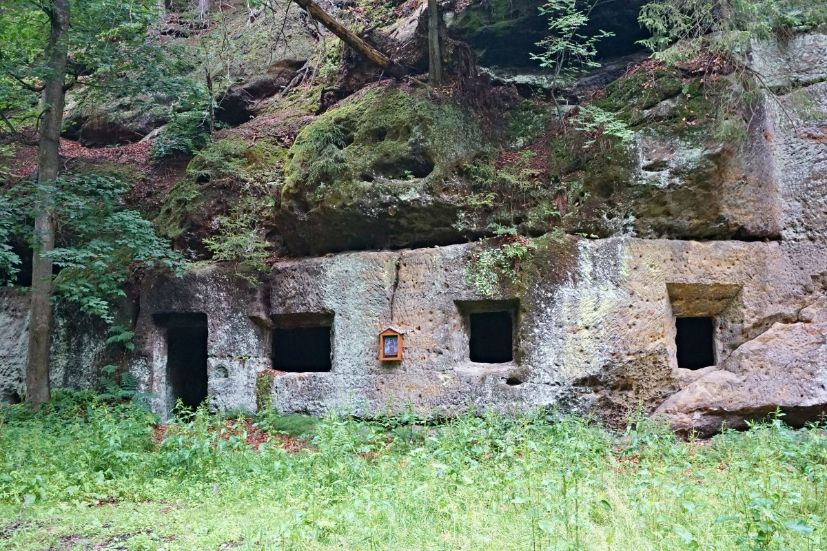 Cesta nás vedla převážně borovým lesem místy s příměsí bříz a dalších listnáčů až ke skalám, na jejichž vrcholu se kdysi nacházel hrad Zbyny. Zanikl však již ve středověku stejně jako stejnojmenná ves pod ním. Připomínají ho jen téměř neznatelné stopy na půdním reliéfu. Divokým údolím jsme pak došli až k nedaleké poustevně. Tvoří ji čtyři světničky vytesané do pískovcové skalní stěny. Místnůstky mají malá okénka. Obyvatelé si tu mohli dokonce zatopit v krbu, ze kterého kouř odcházel průduchem vytesaným ve skále. Zachovalo se i kamenné schodiště do komůrky v patře. Poustevnu založil ke konci 18. století hrabě Adam Hartig. Zachovalo se i jméno jednoho z poustevníků. Bývalý myslivec Jodocus tu žil zřejmě v letech 1760 až 1777. V roce 1781 byly poustevny rušeny a zanikla i tato.