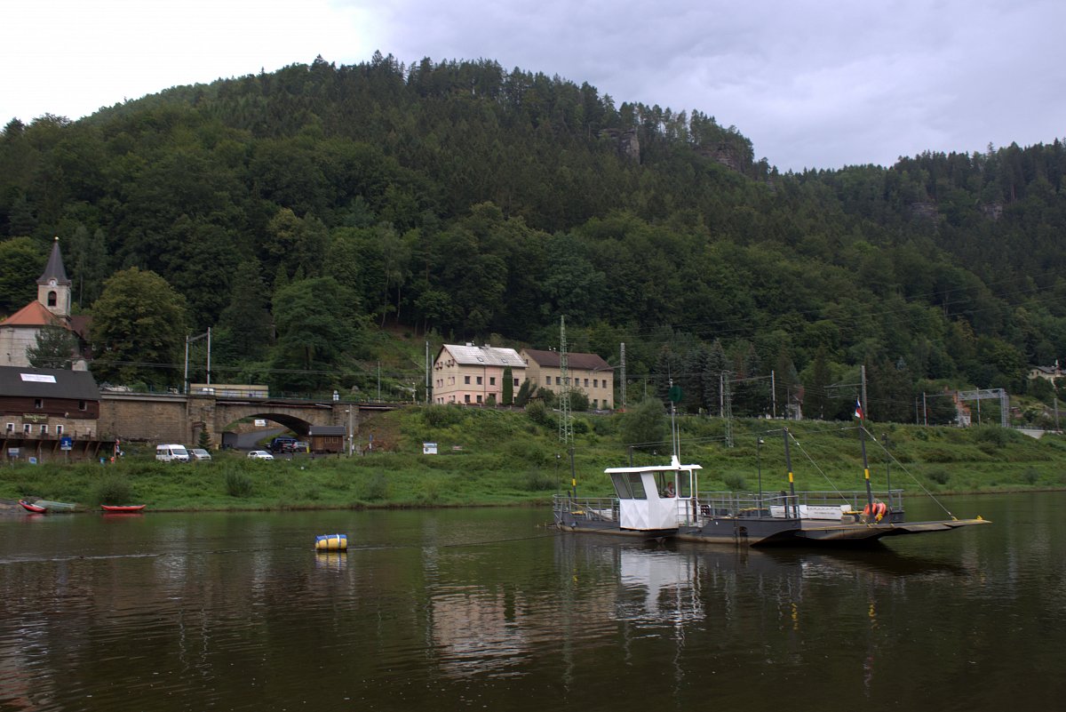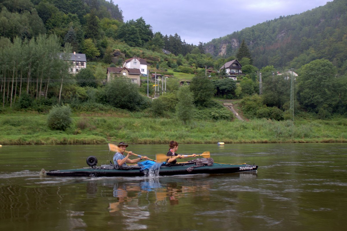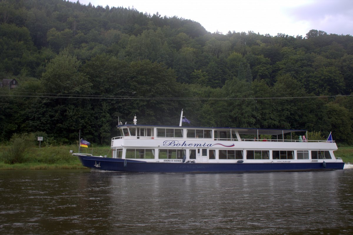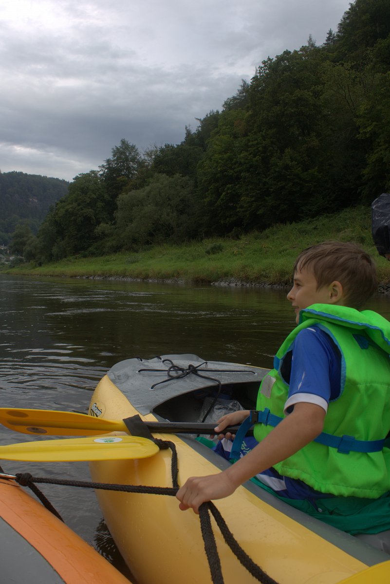 Začátek plavby  nebyl vůbec jednoduchý. Na první lodi jeli skoro samí zkušení vodáci, u nás to jistil jen Venda. Navíc pokaždé, když jsem položila pádlo, že udělám snímek, tak se loď otočila o 360 stupňů. Mareček prohlásil, že v takovém blbém týmu, kde je babička, on jet nechce. Tak došlo k výměně posádky. Získali jsme Míšu, který už se od profesionálů něčemu přiučil, proto byl pro nás velkým přínosem. Pak zase otravoval Andrej, že on chce jet s dědou, tak se k nám zase vrátil ubrblaný Mareček. Mezitím se mraky zlověstně stahovaly nad děčínským zámkem a Nebíčkem na skále.  Propluli jsme okolo proslavené, více jak šedesát let staré lodi Beskydy, zakotvené v přístavišti okolo starých polorozbořených přístavních budov, kde se natáčely TV seriály Cirkus Bukowski a Rapl. O kus dál jsme se ocitli pod železničním mostem, na kterém nad námi zrovna přejel nákladní vlak do Německa. Na řece bylo poměrně rušno, někteří vodáci se družili a připíjeli si na zdraví (nám nikdo nenalil, příště se musíme líp zásobit). Okolo nás proplula výletni loď Bohemia bez výletníků, která plula z Hřenska, jeden motorový člun a předjeli nás dva cizinci na parádní lodi s kolečkama.
