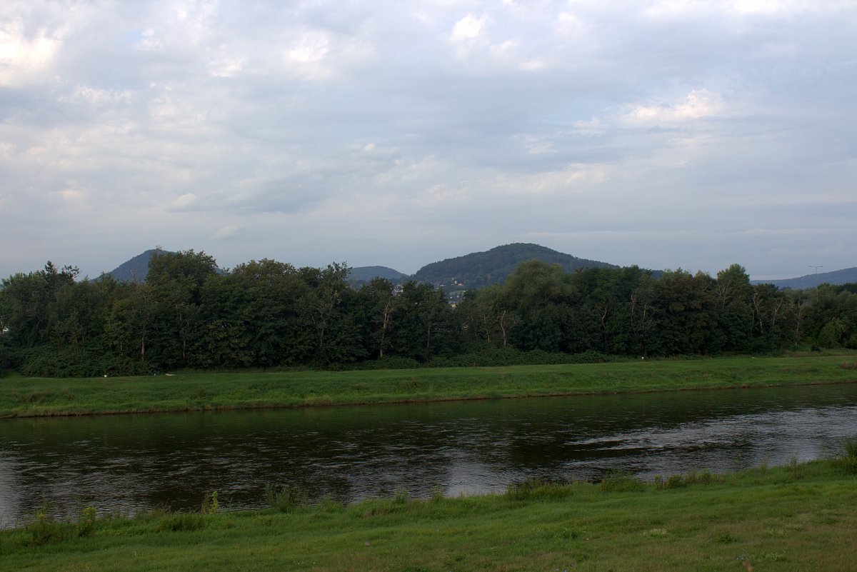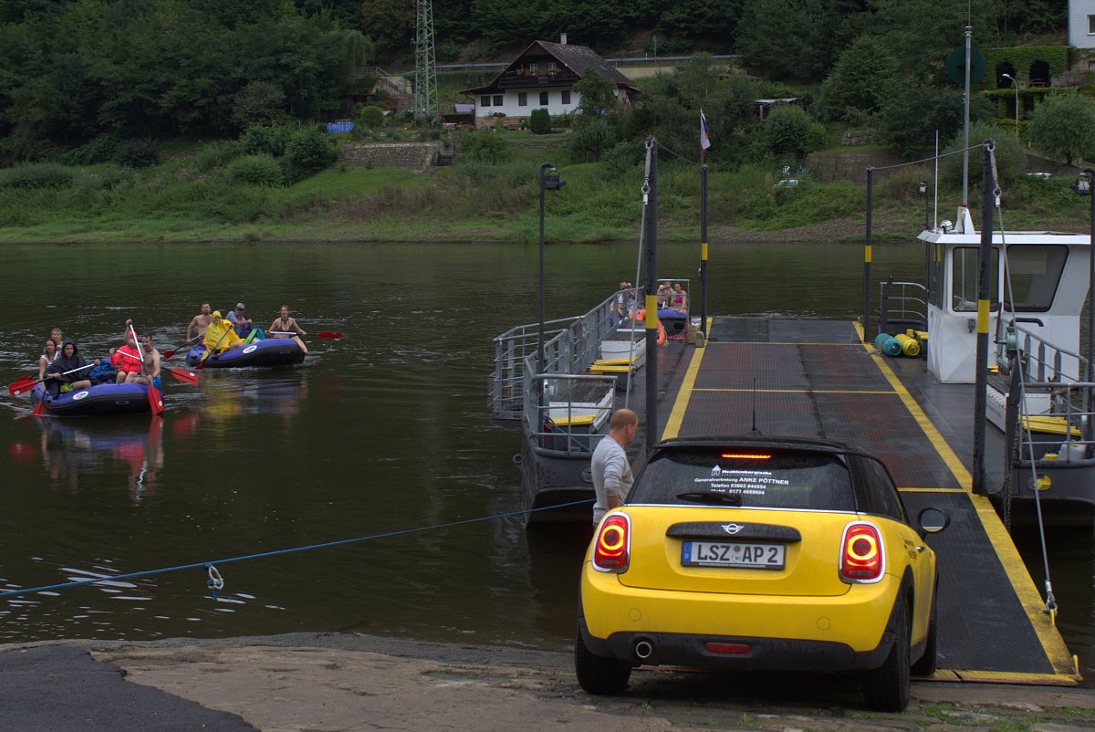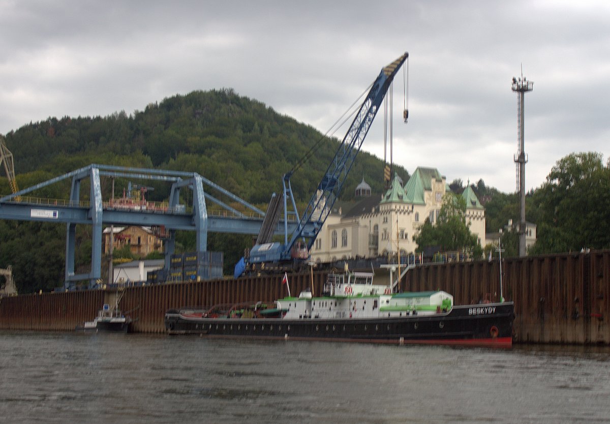 Začátek plavby  nebyl vůbec jednoduchý. Na první lodi jeli skoro samí zkušení vodáci, u nás to jistil jen Venda. Navíc pokaždé, když jsem položila pádlo, že udělám snímek, tak se loď otočila o 360 stupňů. Mareček prohlásil, že v takovém blbém týmu, kde je babička, on jet nechce. Tak došlo k výměně posádky. Získali jsme Míšu, který už se od profesionálů něčemu přiučil, proto byl pro nás velkým přínosem. Pak zase otravoval Andrej, že on chce jet s dědou, tak se k nám zase vrátil ubrblaný Mareček. Mezitím se mraky zlověstně stahovaly nad děčínským zámkem a Nebíčkem na skále.  Propluli jsme okolo proslavené, více jak šedesát let staré lodi Beskydy, zakotvené v přístavišti okolo starých polorozbořených přístavních budov, kde se natáčely TV seriály Cirkus Bukowski a Rapl. O kus dál jsme se ocitli pod železničním mostem, na kterém nad námi zrovna přejel nákladní vlak do Německa. Na řece bylo poměrně rušno, někteří vodáci se družili a připíjeli si na zdraví (nám nikdo nenalil, příště se musíme líp zásobit). Okolo nás proplula výletni loď Bohemia bez výletníků, která plula z Hřenska, jeden motorový člun a předjeli nás dva cizinci na parádní lodi s kolečkama.