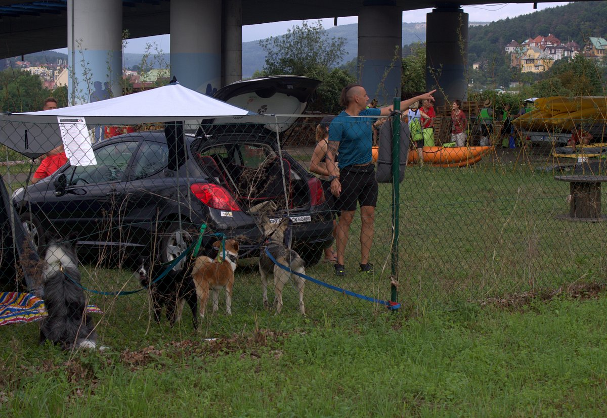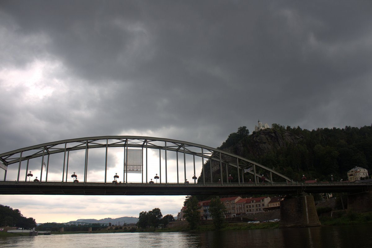 V sobotu ráno okolo deváté nastal ten den D. Podle předpovědi už mělo v Děčíně pršet, ale když jsme si ve vodáckém kempu pod velkým betonovým děčínským mostem vyzvedávali lodě, vesty a pádla, tak se zatím jen honily černé mraky. Byly nám předány instrukce k plavbě, museli jsme absolvovat bezpečnostní školení a kluci vyfasovali píšťalky (pískali před každou bójkou).