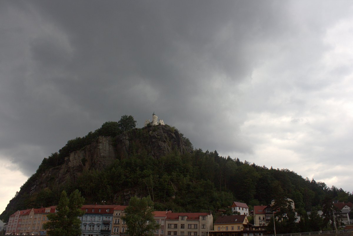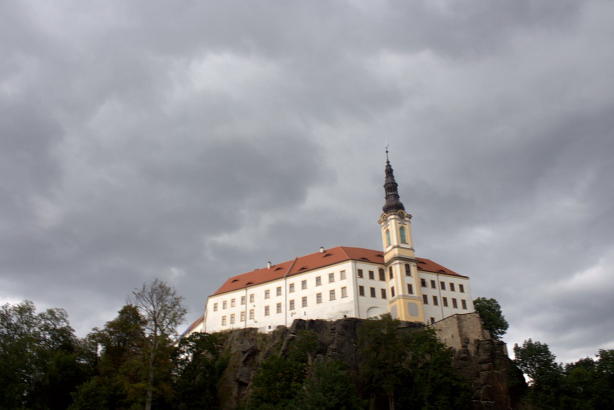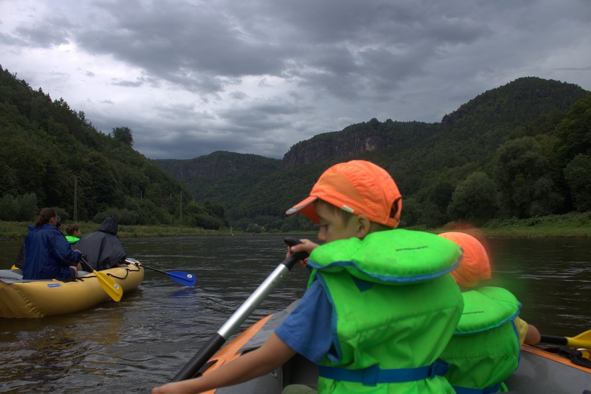 Plavba dlouhá deset km měla trvat hodinu a půl a vylodit jsme se měli v Dolním Žlebu, kde si pro půjčené lodě měl přijel pronajímatel autem. Kousek za Děčínem se přihnal docela silný vítr a nebe se roztrhlo. Pršelo docela hustě, na řece se dělaly pořádné bubliny. Nás to ale nazaskočilo, měli jsem s sebou pláštěnky, a nejsme přece žádné máčky. Potom si to déšt rozmyslel a na půl hodinky ustal. Kousek s námi plaval u břehu i velký bobr a nad námi neustále kroužilo sedm velkých ptáků, asi šedé volavky. Klukům jsem řekla, že je to sedm krkavců, a když budou zase vymýšlet, tak si je odnesou pryč.