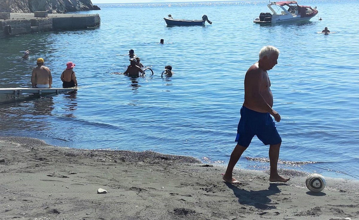 Jsme v městečku Perissa na ostrově Santorini. Pláž s černým pískem je téměř vylidněná, turistů je tu letos málo. Přesto je tady rušno. Probíhá dopolední setkání místních seniorů. Dámy a pánové se přišli vykoupat a pobavit se. To znamená, strávit pár hodin v moři.