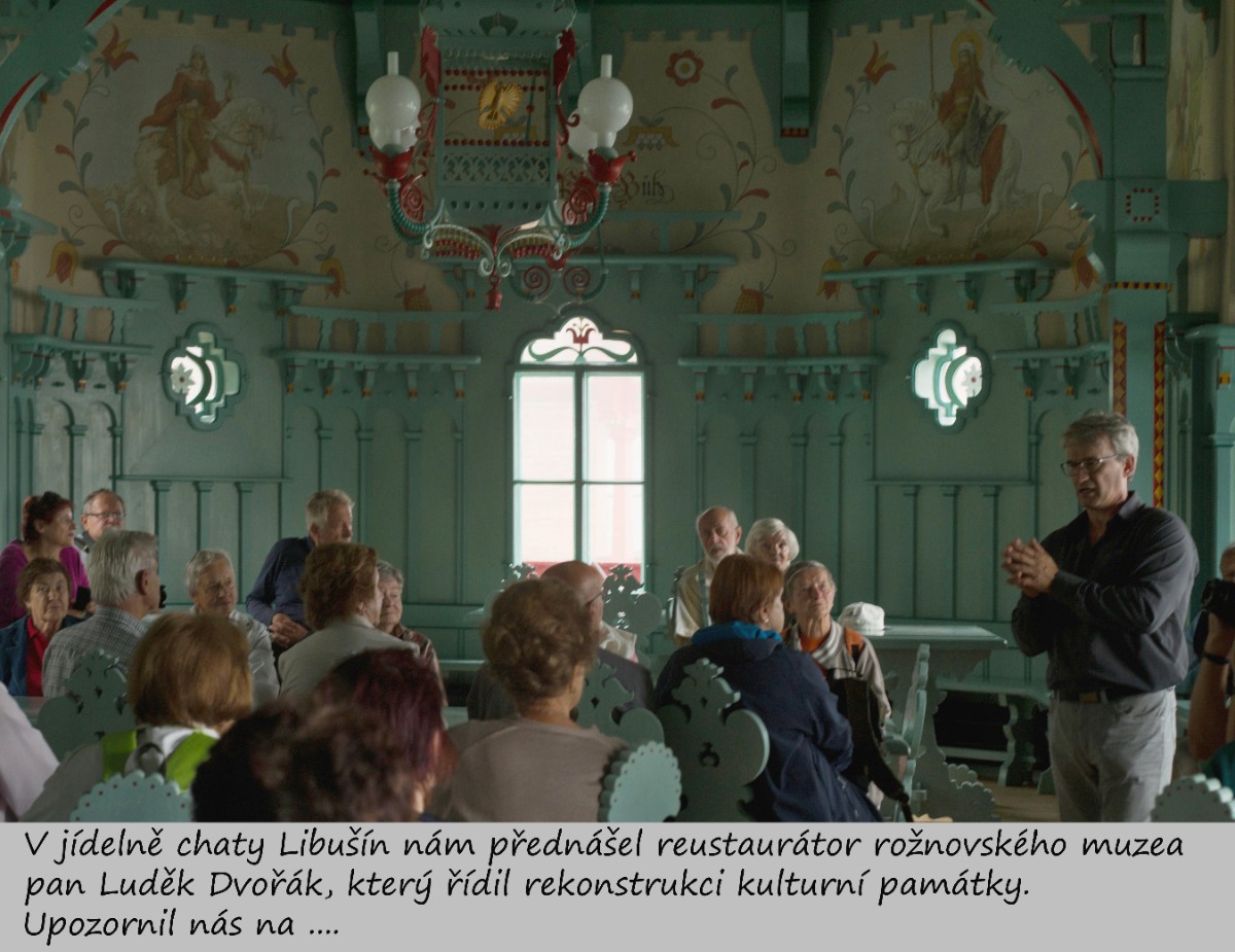 Prohlídka znovuzrozeného Libušína na Pustevnách spojená s přednáškou. Libušín byl vystavěn v letech 1898-9 ve stylu lidové secese podle návrhu slovenského architekta Dušana Jurkoviče. V roce 2014 vyhořel a na jeho obnově se podílelo přes 220 řemeslníků, kteří pracovali podle postupů z dob Dušana Jurkoviče. Vše je rukodělná práce. Neumím posoudit historickou a uměleckou hodnotu díla, ale v době, kdy je nouze o šikovné řemeslníky, to považuji téměř za zázrak.