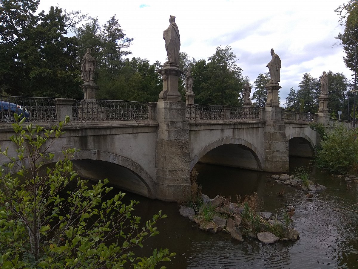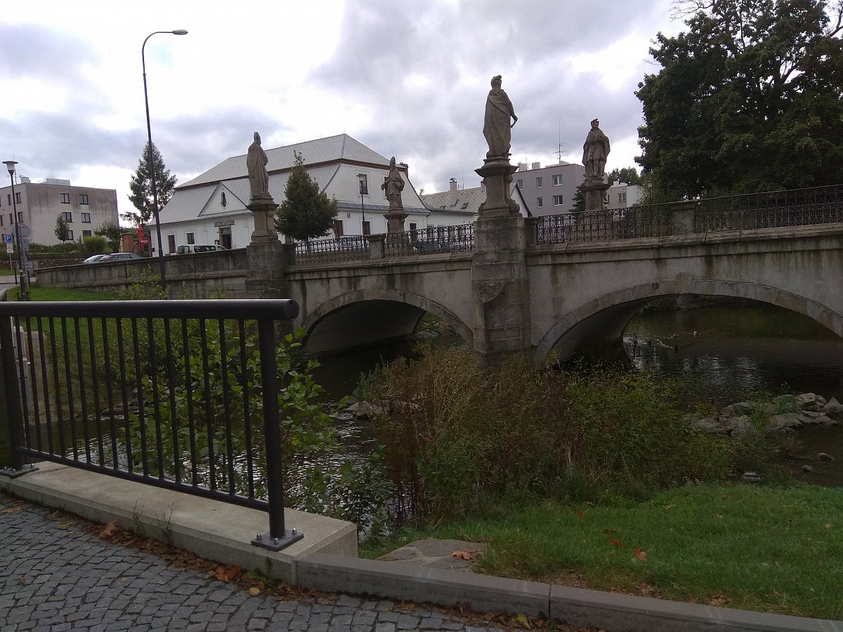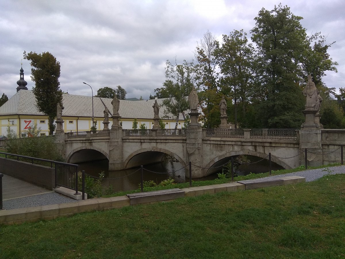 Od Táferny jsem pak šla doleva na lávku přes Stržský potok podél kamenného barokního mostu, který pochází z 1. poloviny 18. století. Sochy osmi světců nechal v roce 1761 na most umístit opat místního kláštera Bernard Hennet, nástupce opata Václava Vejmluvy. Inspiroval se výzdobou Karlova mostu. Most leží na velmi vytížené silnici. (Pozn. autorky: Bohužel!) V roce 2008 byl rekonstruován a při té příležitosti byly originály soch sejmuty a nahrazeny kopiemi. Originály soch byly zrestaurovány a jsou trvale vystaveny v nedalekém Dolním hřbitově. Zdroj: https://zdarns.estranky.cz/clanky/barokni-kamenny-most.html