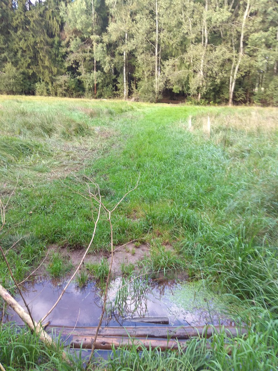 Pak už jen poměrně nudná cesta po asfaltu směrem ke Lhotce. Až jsem zalitovala, že jsem raději měla vyrazit na kole. Zvlášť když je tak krásně. Naštěstí pak žlutá odbočila doprava na polní cestu podél lesa. Tu jsem ale po chvíli opustila a odbočila doprava přes louku k lesu a dál pokračovala po modré.  Cesta vede příjemně buď lesem, či po okraji lesa. Jelikož je ale po vydatném dešti, tak mě občas překvapilo blátíčko nebo vyloženě mokrá louka. Občas nezbylo než to přehopsat a doufat, že nezapadnu až po kolena. Celkem to vyšlo, až na jedno místo, kde jsem chtěla přejít potok po takových kulánech, které tam někdo právě za tím účelem naskládal. Jsem si myslela. Tak jsem na ně stoupla a aha, co to je? Všechno je jinak. Ta polena si tam jen tak plavou. A ta voda je dooost hluboká. Ještěže mám vysoké boty. Ale ještě tak 2 cm a teklo by mi do nich vrchem. A to by mi byl slavný goratex na co? No? No úplně na nic. :-)