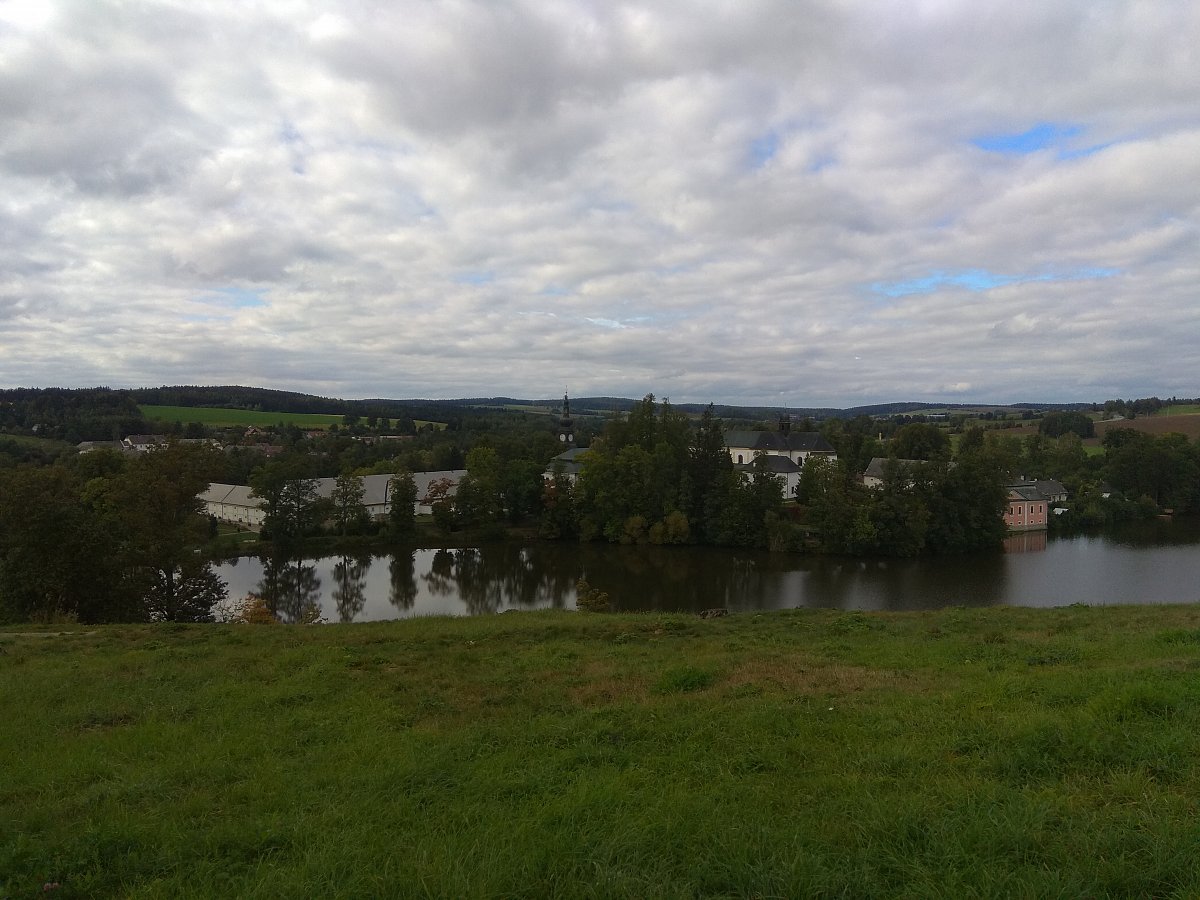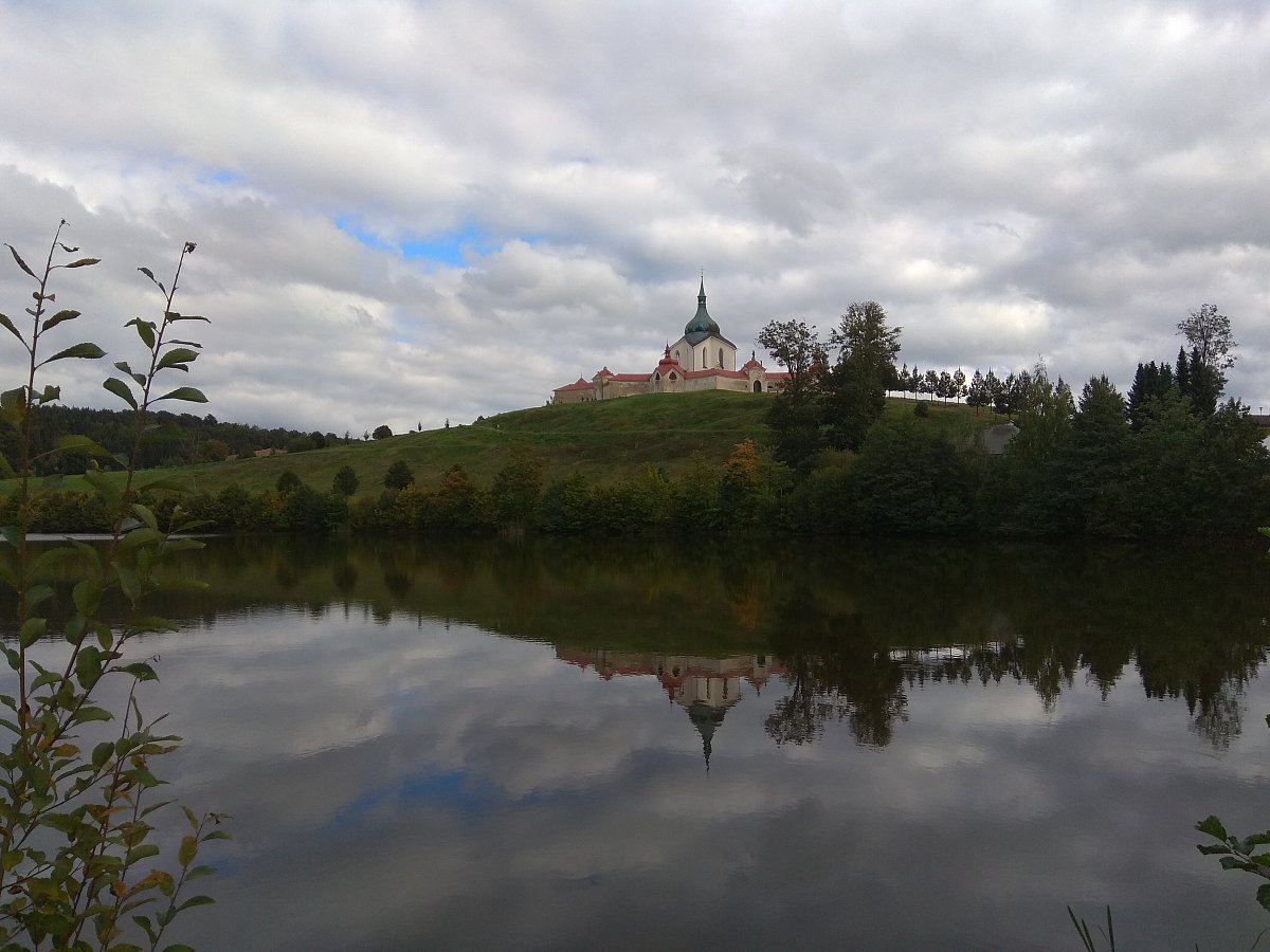 Ale tady jsem se dnes nezdržovala a pokračovala nahoru ke Konventskému rybníku, odkud je krásně vidět naši unikátní nádheru na Zelené Hoře. Ještě si dovolím dát poslední odkaz https://www.zelena-hora.cz/cz.  A už mažu přes most a silnici nahoru na Horu (Zelenou). Dnes se udělalo hezky, tak je tady spousta lidí, takže s focením je trošku problém – když tam nechci mít ty lidi. A pak už jsem pokračovala po žluté přes obec Vysoké směrem na Lhotku. Na kraji vesnice se u prvního domu objevili 2 psi, asi border kolie, tipuji. Zaujali mě, že byli jako negativ a pozitiv. Oba černobíle strakatí, ale tam, kde měl jeden bílou srst, tam byl ten druhý černý a naopak. Oni si mě taky všimli a všichni dohromady jsme se pozorovali. Já tedy trošku s obavami, přiznám se. Tak jsem se na ně usmála (tím snad nic nezkazím) a začala jsem na ně mluvit, jako že jsou krásní a tak. Dobrý, zabralo to. Začali vrtět ohony a lísat se ke mně. Hned přiběhla majitelka s omluvou. Mě ale vůbec neobtěžovali. Akorát to holt nejsou psi hlídací, ale vítací. I když kdoví, jak by to bylo třeba v noci a bez paničky …