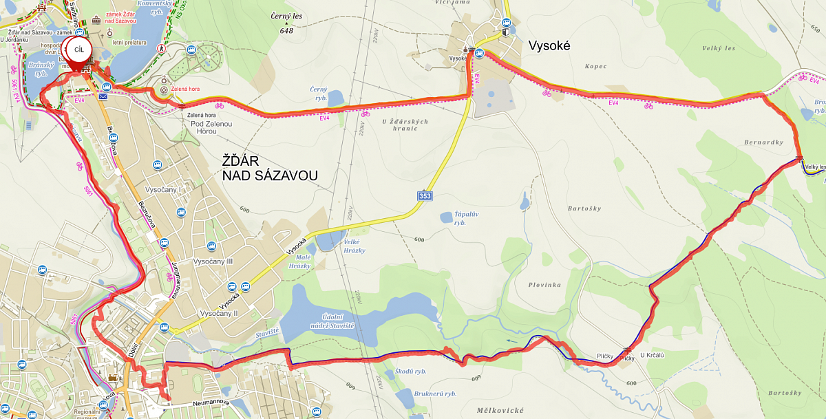 Je pravda, že v tom lese člověk musí být furt ve střehu a sledovat značky, protože je tam spousta cestiček (asi od pejskařů), které by člověka, co to tam nezná, dovedly bůhvíkam. Je to už ale blízko města, takže by se vlastně až tolik nestalo.  Takže pořád po modré až na Studentskou. Tady jsem si uvědomila, že je zítra svátek, a tudíž zavřeno a u nás v lednici prakticky jen světlo a zima, ale k jídlu takřka nic. Takže jsem to vzala přes Lidl. To není zase taková zacházka, ale zkazilo mi to trochu průměr. Něco ubral vlastní nákup a s nanukem (co jsem si koupila za odměnu :-)) se taky moc finišovat nedá. A pak už jsem prokličkovala na přechod přes hlavní silnici a po cyklostezce zase pěkně v poklidu došla k Táferně. A to je konec mého dnešního putování. :-)