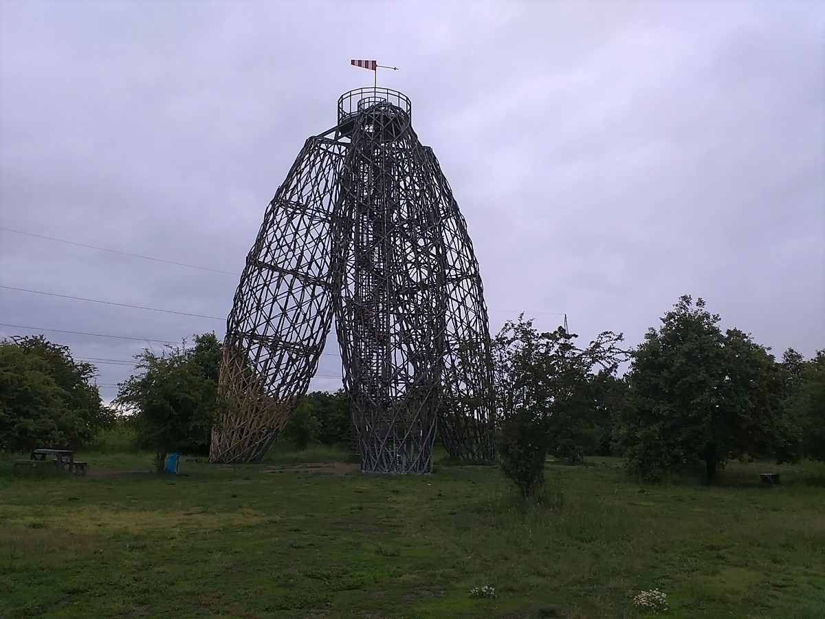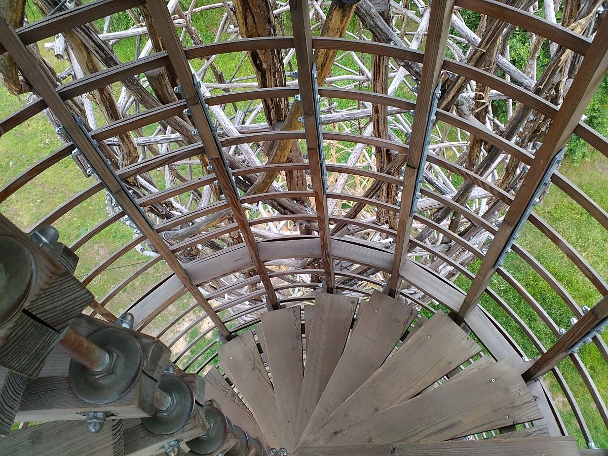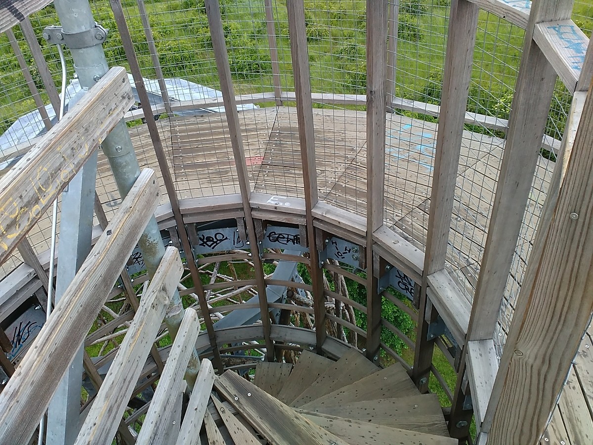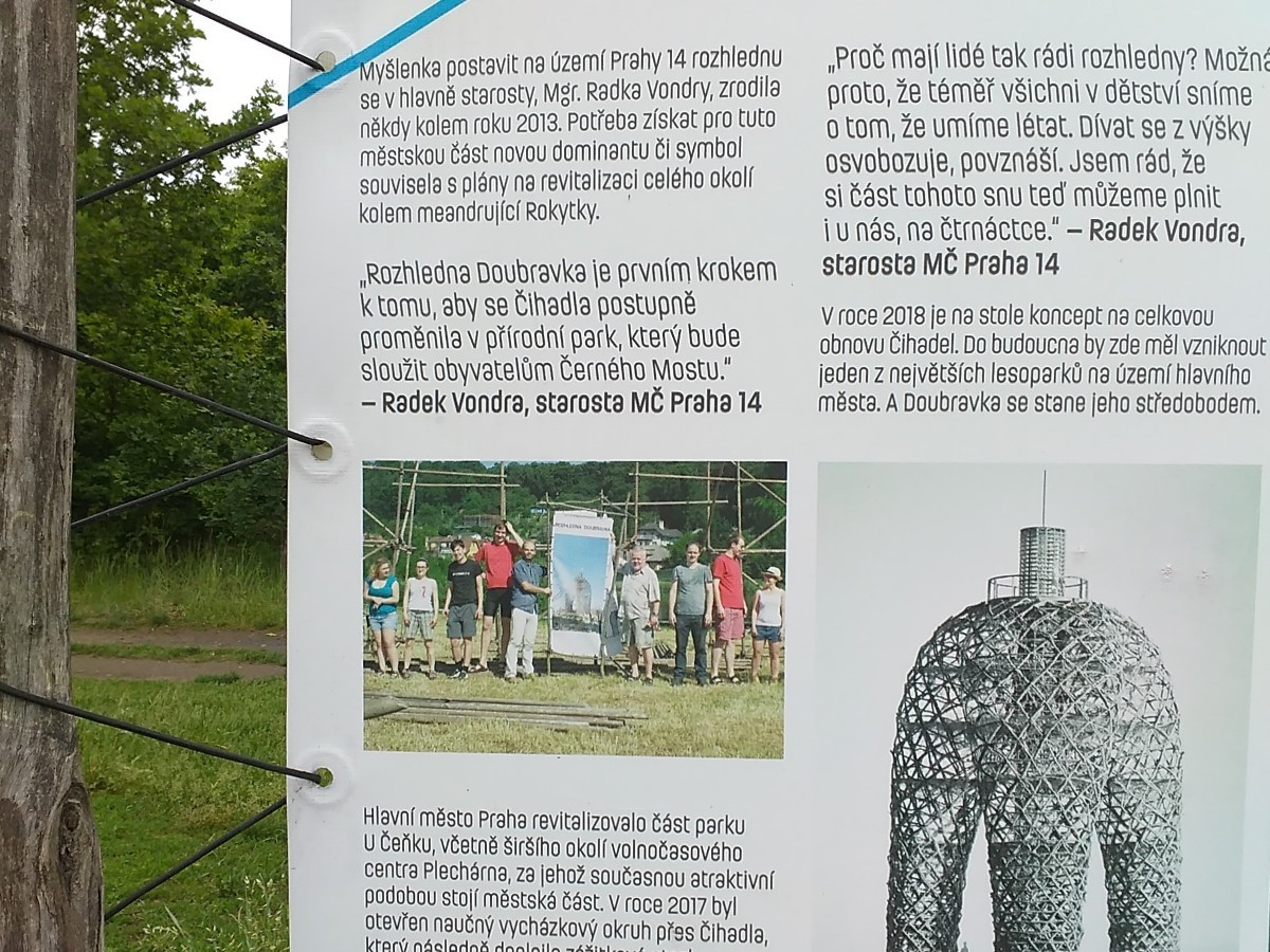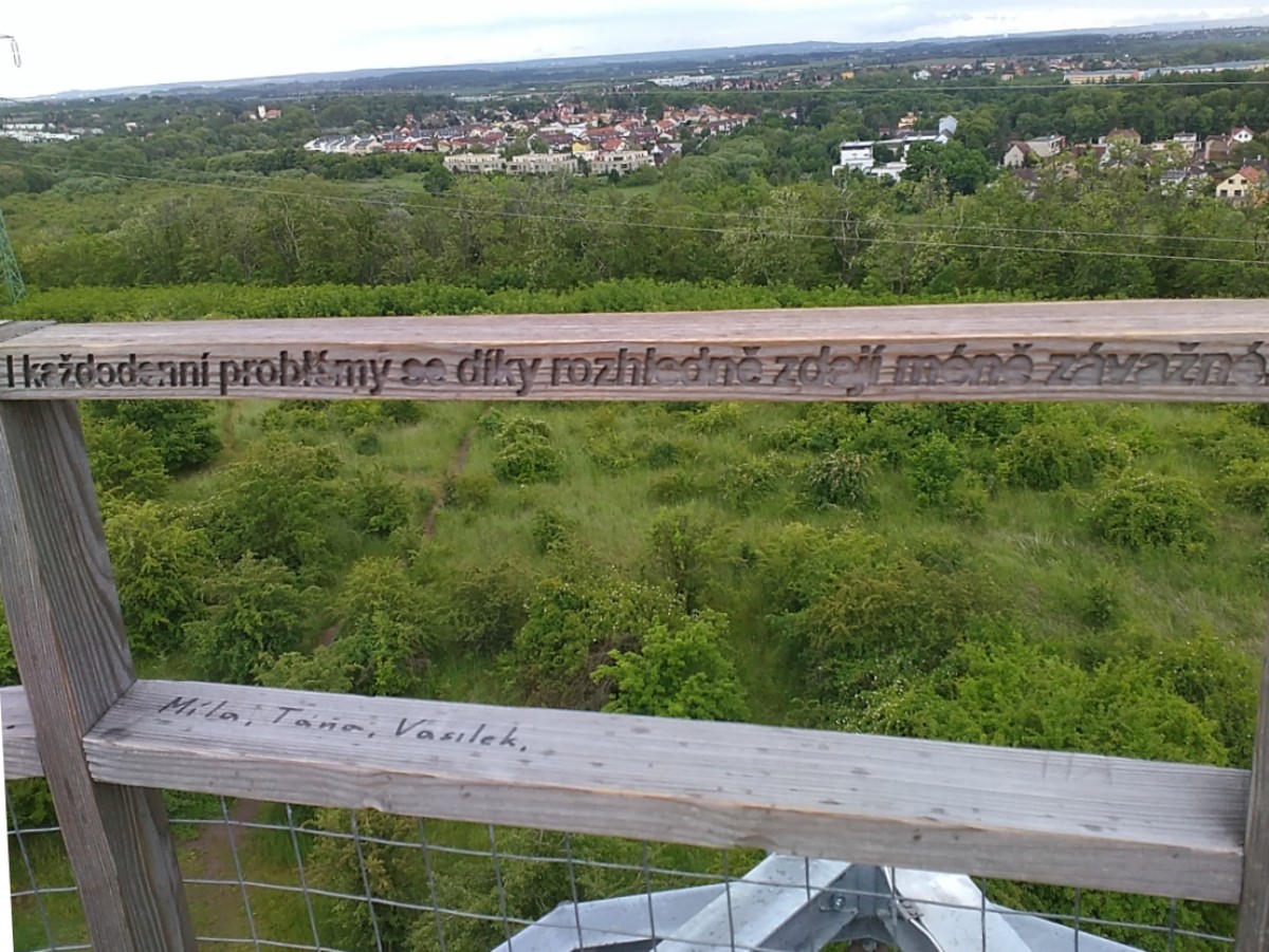 Byla však vybudována z neobvyklého mateiálu - akátového proutí. Rozkročené tři nohy se směrem vzhůru sbíhají a jsou zakončeny vyhlídkovým ochozem ve výšce pouhých 20 metrů. Ale jen v jedné noze vede točité schodiště s pevnými dřevěnými schody, kterých je 98. S velkým očekáváním jsme stoupaly vzhůru a na stupních četly jména jednotlivců i organizací, které finančně podpořili tuto stavbu. Ta vyčnívá nad lesoparkem jako maják, obklopený mořem vzrostlé zeleně. Z něho se naskýtá panoramatický výhled nejen na nejbližší okolí. K jihu je vidět místní část Kyje s velkým areálem Mlékárny, západně sídliště Lehovec a odsud více k severovýchodu sídliště Černý most. Na ochozu jsou vypáleny nápisy, které jsem vyfotila, zdály se mi velmi nápadité a dobře sem padnoucí.