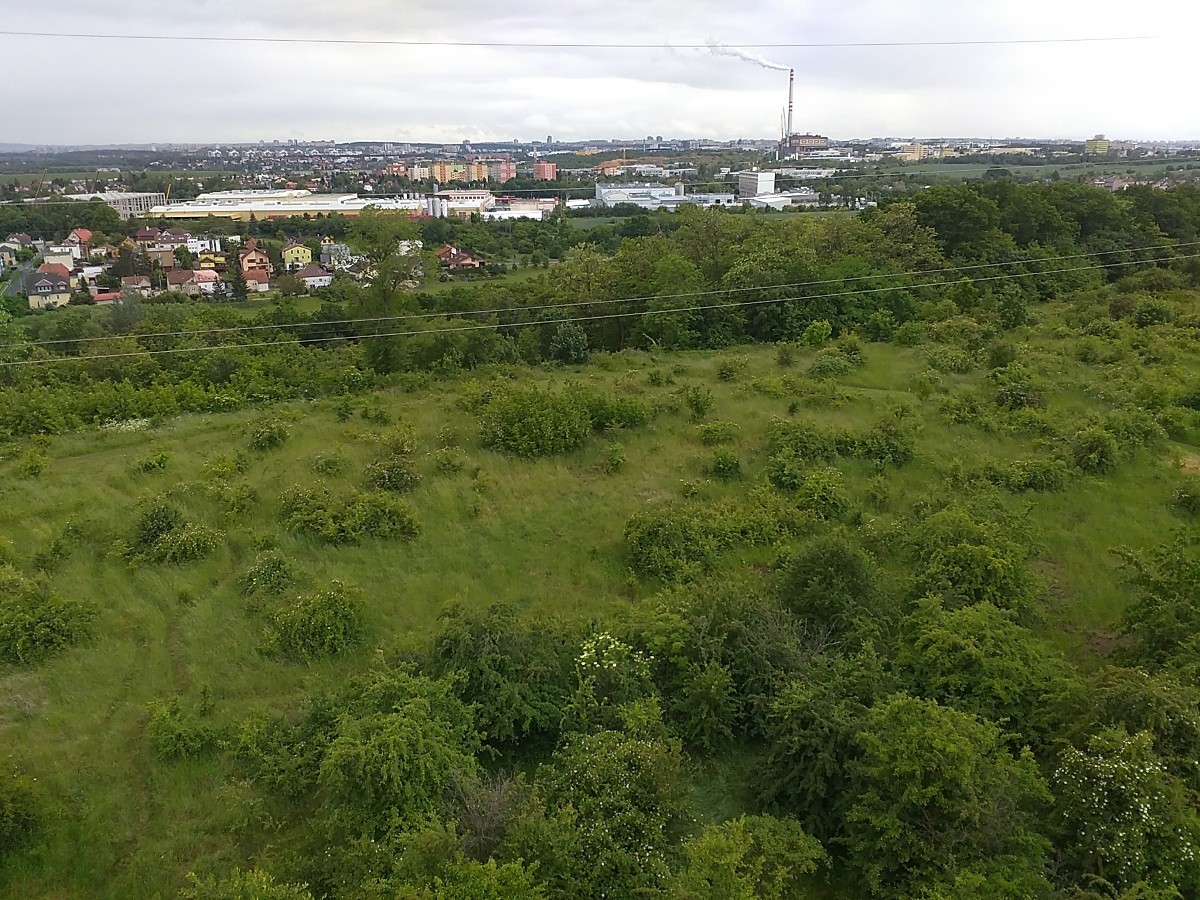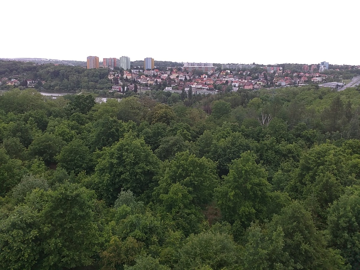 Nám však i přesto vyvstal problém. Nejen, že nahoře se během chvilinky rozfoukal silný vítr a mírně rozhlednou pohupoval. Ustát se to nechalo, to nebylo tak zlé, ale horší bylo, že ten vichr najednou přihnal mraky a spustil se dost rychle déšť. Nebylo kde se schovat. Ačkoliv jsme původně měly v plánu, že si tyto končiny dokonale užijeme a pochodíme po cestičkách v téměř liduprázdné přírodě, tak jsme rychle tento prostor vyklidily a za vytrvalého deště došly k nejbližší zastávce MHD „Doležalova".