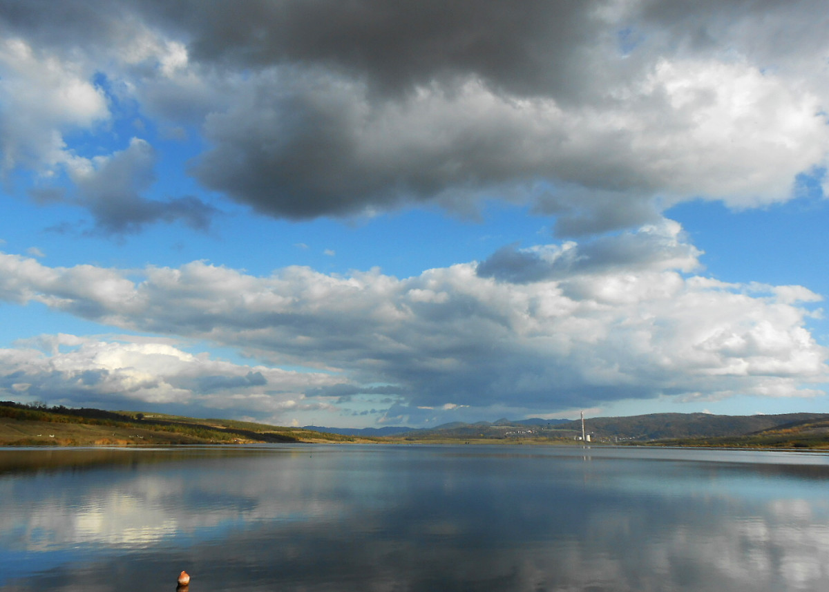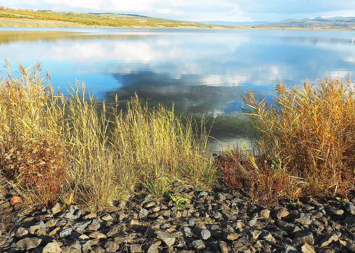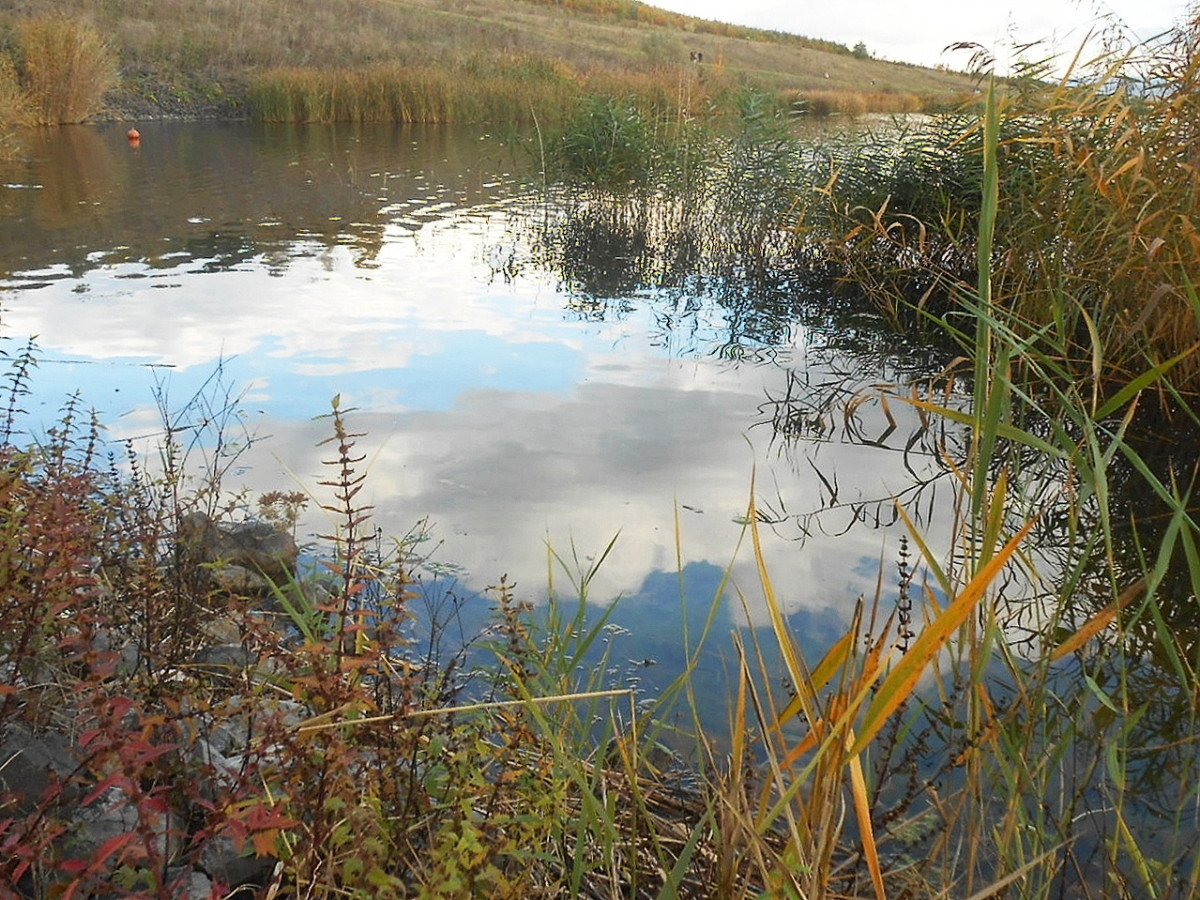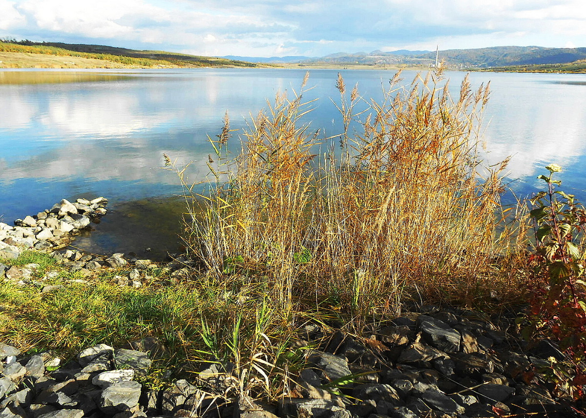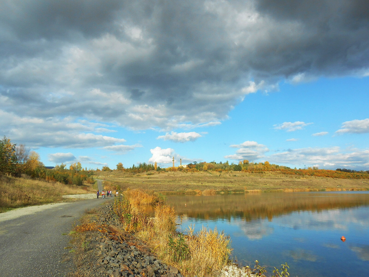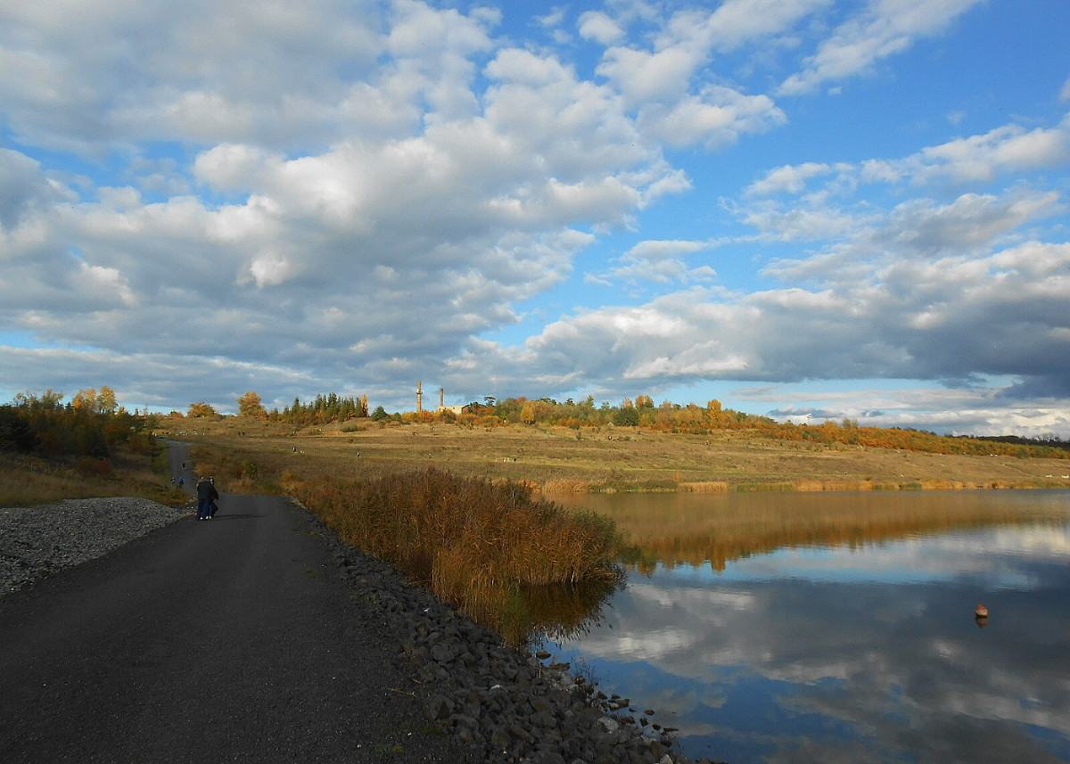 Tak jako každý rok se i letos podzim předvádí ve své plné kráse. Kontrast mezi vodní hladinou a nebem byl úžasný, protože nebylo úplně modro, takže odlesk mraků ve vodě neměl chybu. Potkávali jsme spoustu pejskařů s miláčky od čivavy, až po dogu. Několik se mi jich povedlo s dovolením majitele vyfotit, na dogu jsem se radši neptala. Mezi úlovky počítám i letadlo a letku ptáků, pravděpodobně to byly volavky.