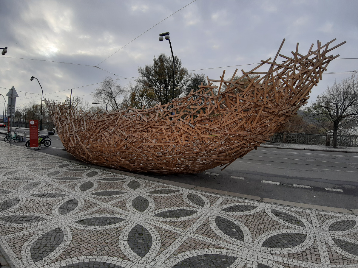 A jdeme dál. Vlastně jedeme. Popojedeme tramvají č. 9 a vystoupíme u Národního divadla. Dál jdeme po Smetanově nábřeží. Přes Vltavu nahlížíme na Střelecký ostrov (foto č. 6). Proč střelecký? Už za Karla IV. se zde konaly střelecké soutěže z luků a kuší. Ostrov pak po další roky sloužil různým akcím, např. v roce 1882 Sokolskému sletu, v roce 1890 zde byly oslavy 1. máje a v průběhu dějin další a další politické akce, oslavy, festivaly a koncerty. A co to tu vyrostlo na pěším korzu? Zakotvila tu loď. Socha dřevěné lodi (foto č. 7) německého sochaře Martina Steinerta – dílo Wooden cloud (Dřevěný oblak) vznikla v rámci sochařského festivalu Sculpture line ve spolupráci s Goethe-Institutem v Praze. Odtud už je to jen kousek na Karlův most, zamáváme vodníkovi Kabourkovi u Velkopřevorského mlýna (foto č. 8), a protože se začíná šeřit a Čertovka je plná vodníků a čertů pospícháme domů. Co kdyby náhodou…..