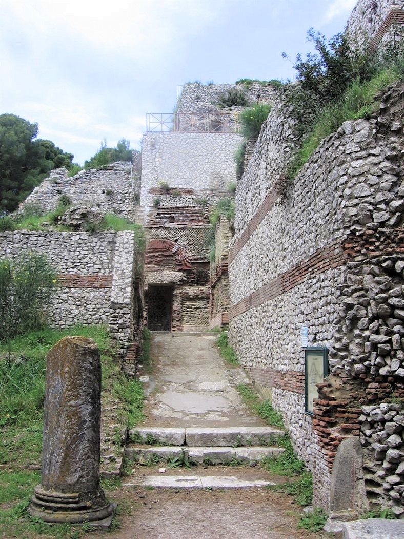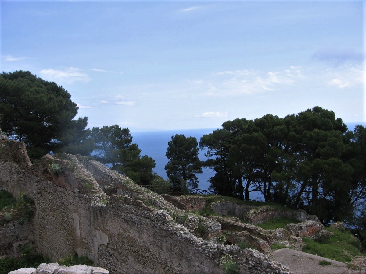 Všude vládlo ticho a klid, jen občas se ozývaly cikády a vlnil se zahřívající se vzduch…když jsme se konečně dostali nahoru k Tiberiově vile, mohli jsme se v mírném větříku zchladit pod vonícími piniemi a v úžasu zůstat stát na nejvyšším vrcholu, odkud byl překrásný rozhled na moře, celý Neapolský záliv a protější pevninu.
