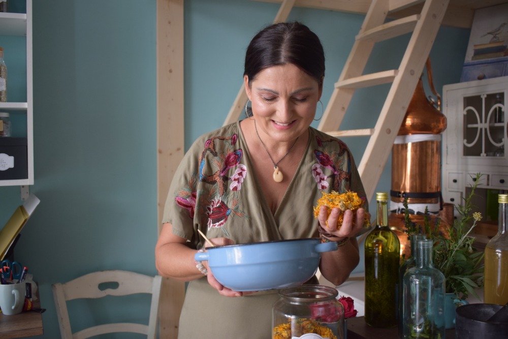 V každém ročním období obdivuji bylinky, které mi buď vyrostou ze semínek na zahradě, nebo je najdu v divoké přírodě. Ta proměna mně baví, časné jaro začíná pupeny, ty jsou také velmi léčivé a když umíte rozeznat stromy či keře bez listů, víte, na co se zaměřit. Například topol černý, jeho pupeny vám pomohou k doléčení boreliózy, nebo pupeny lípy vám mohou být nápomocny při stavech úzkosti či nespavosti. Pak následují brzké jarní plevele např. ptačinec a bršlice, mladé kopřivy, nebo medvědí česnek, úžasně nastartují a vyčistí organismus po zimně. Z letních bylinek se vždy těším a dodržuji tradici chodit v den letního slunovratu sbírat hlavně třezalku, neboť ji nakládám na tzv. Janův olej a nezapomínám na oplodí ořechu královského. Toto oplodí maceruji v pálence spolu s kořením a pak otevřu svou slunovratovou ořechovici na Vánoce. S podzimem pak přichází sběr plodů a kořenů. Ty jsou důležité, obsahují zcela jiné léčebné látky nežli tělo rostliny. Tvořím z nich většinou masti, nebo nakládám do olejů. Např. kořen kostivalu pomůže při problémech s pohybovým aparátem a kořen lopuchu je skvělý na problémovou pleť, nebo když vypadávají vlasy.