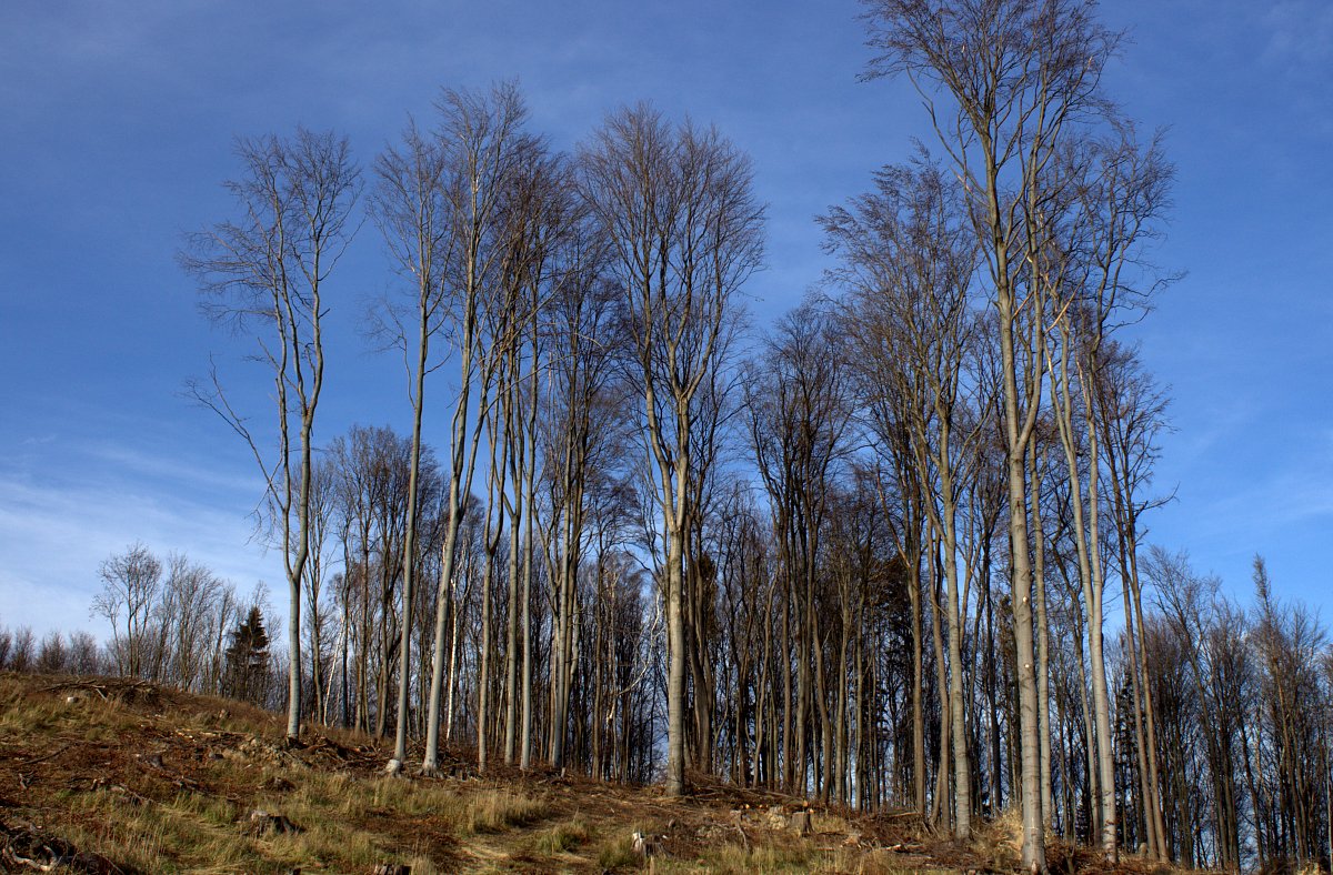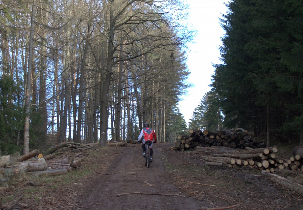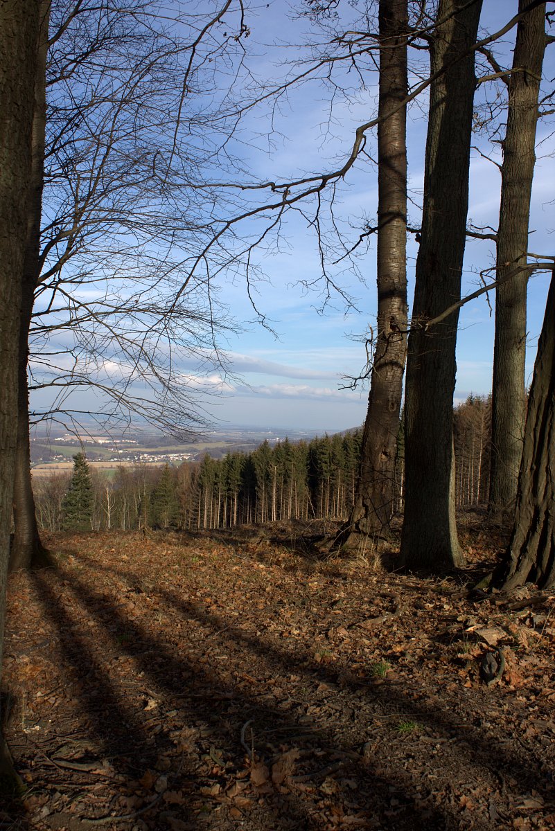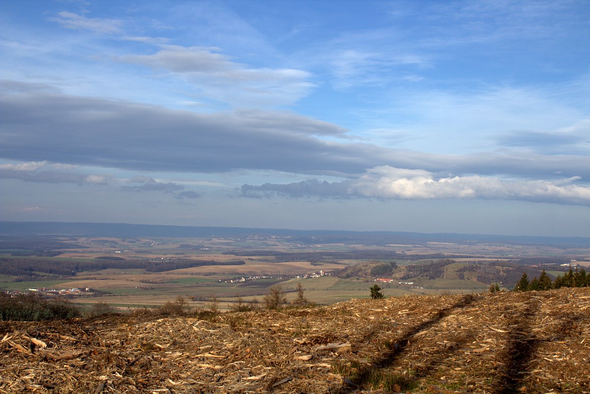 Na zpáteční cestu jsme se vydali přes nejvyšší kopec Lysinu. Na jejím vrcholu se nám otevřely pohledy do okolní krajiny. Dokonce jsem viděli i na Sv. Hostýn. Když tam ještě stály husté smrkové porosty, tak to bylo nemyslitelné. Místo nich jsme procházeli velkými vytěženými plochami, na kterých se tyčily jen skupiny listnáčů - buků a dubů. Trochu níže čekalo ještě na pokácení a zpracování hodně uschlých smrků.