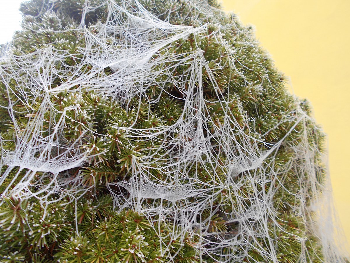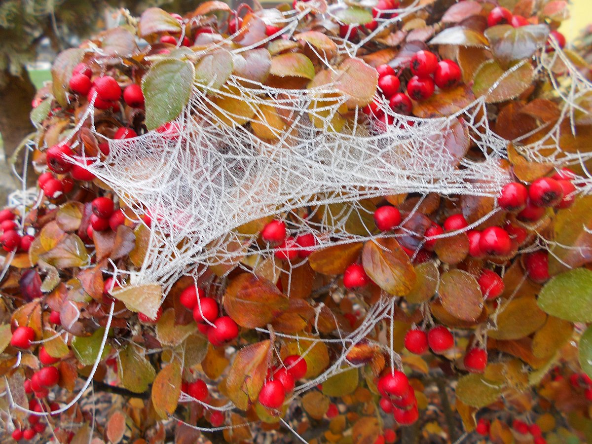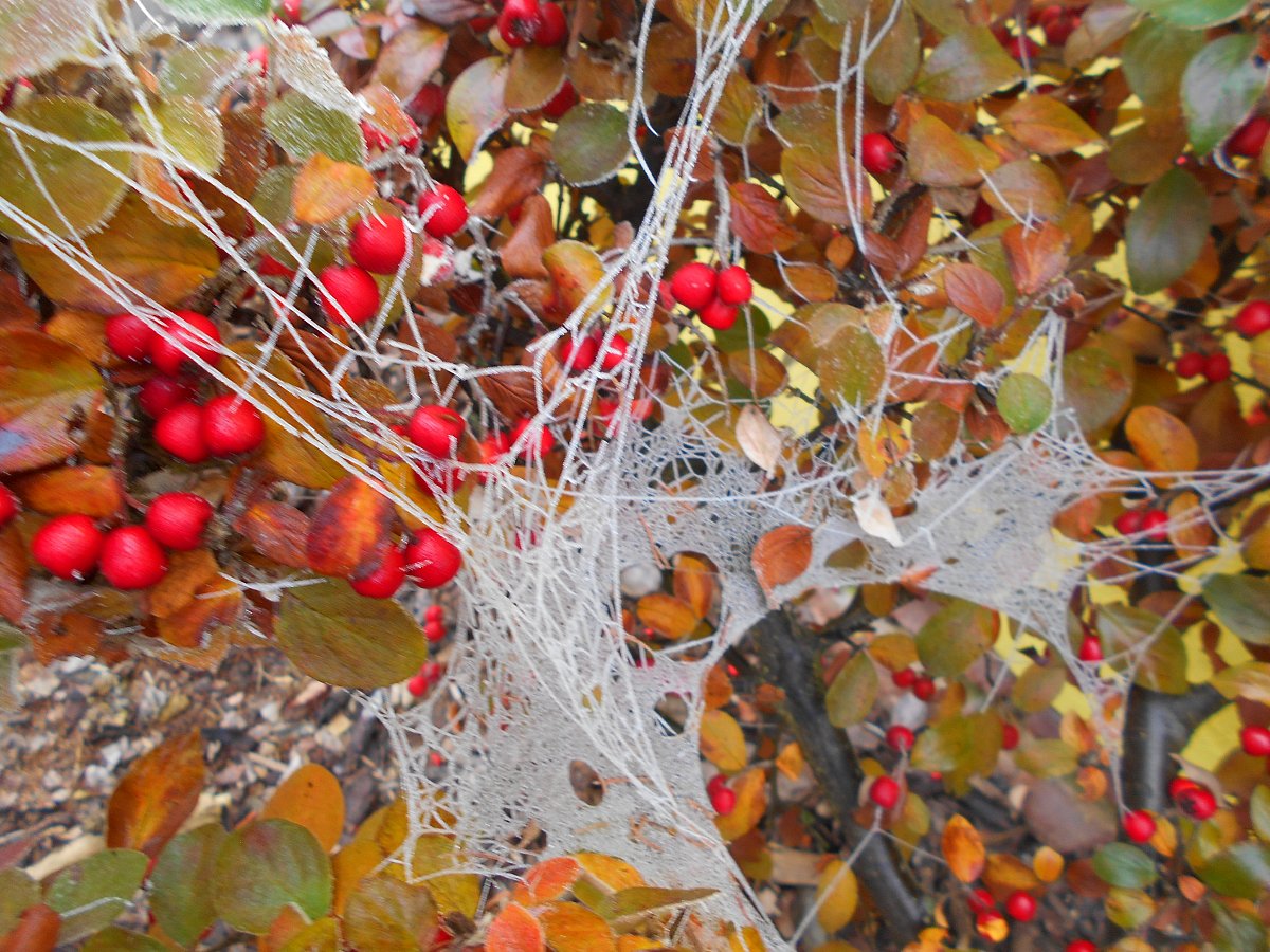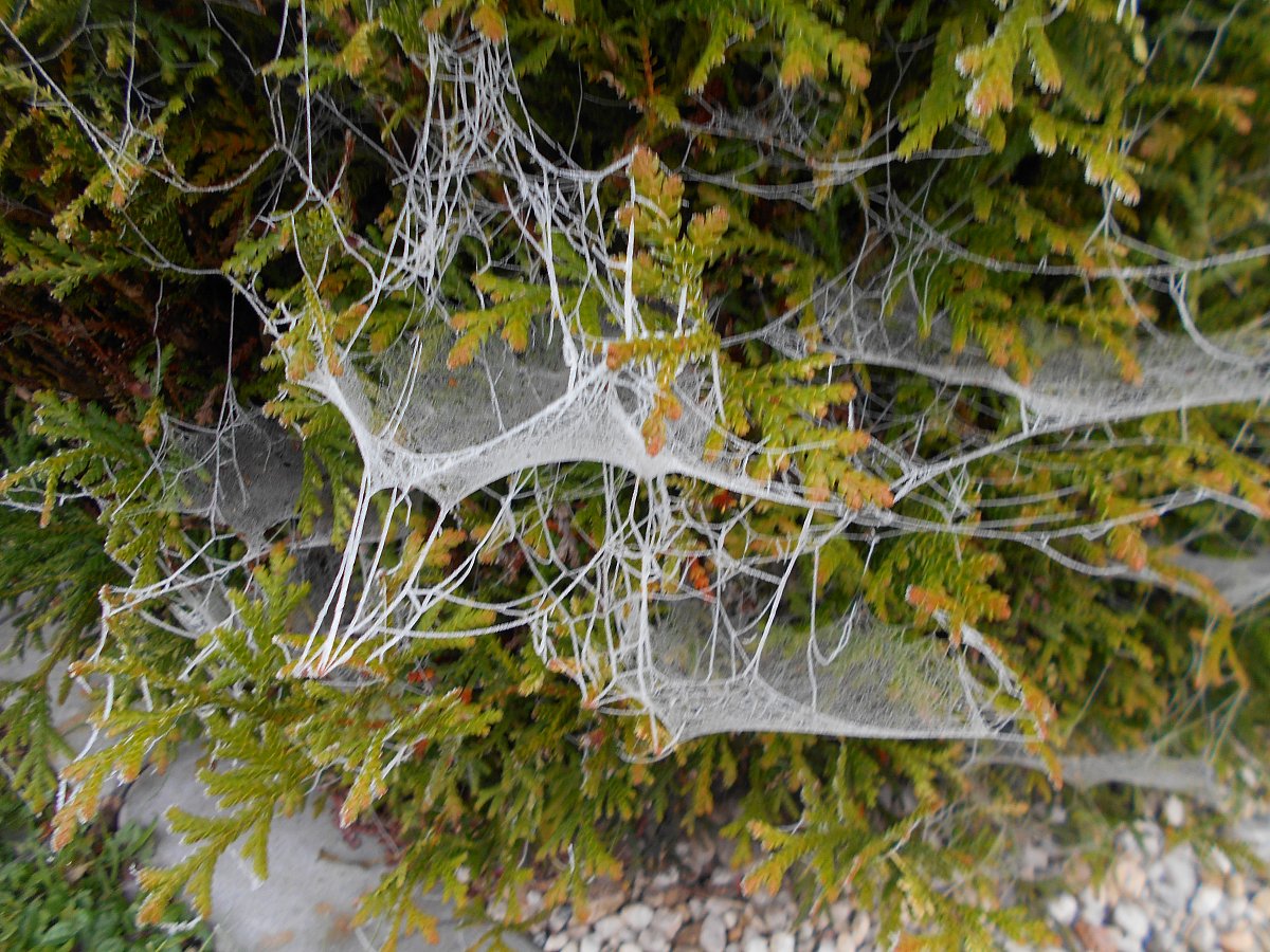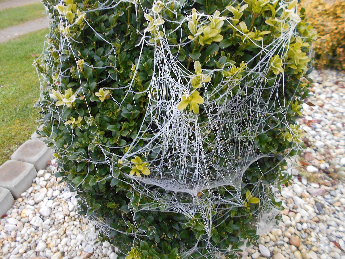 Tyto pavučiny mne zaujaly nejvíce, bylo asi 10 -11 hodin dopoledne. Nikdy jsem se tím nezabývala a nyní jsem zjistila, co v zahradě žije pavouků, aniž bych je pouhým okem viděla.