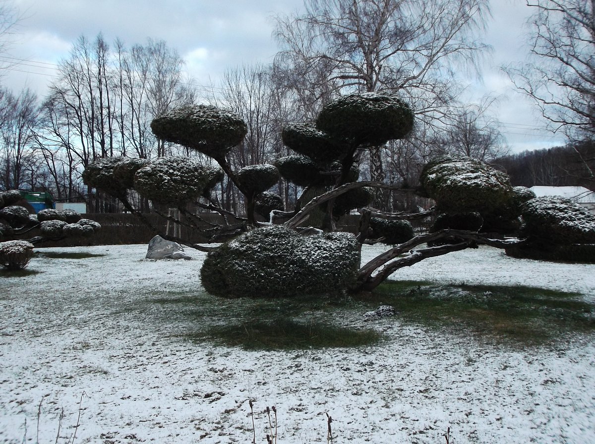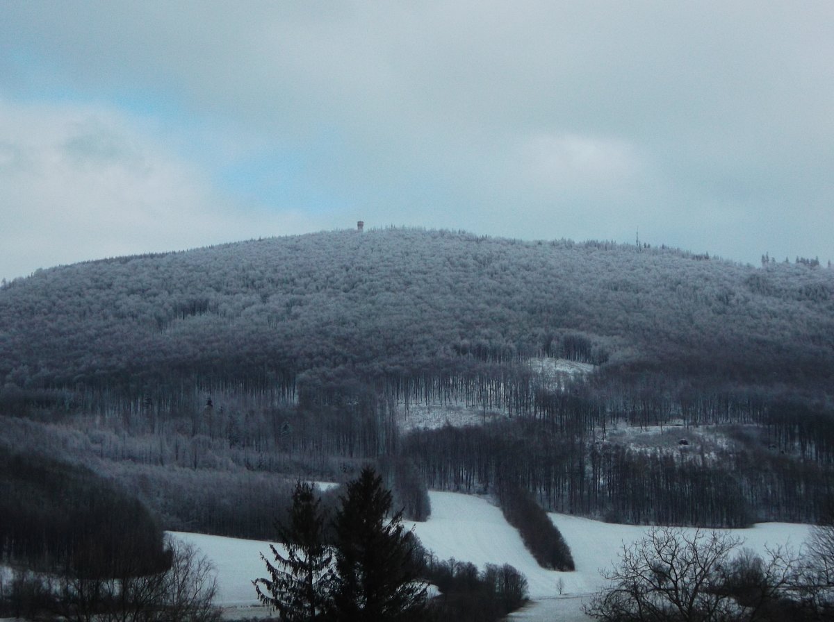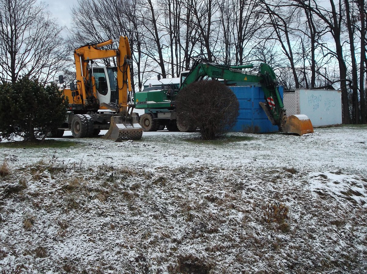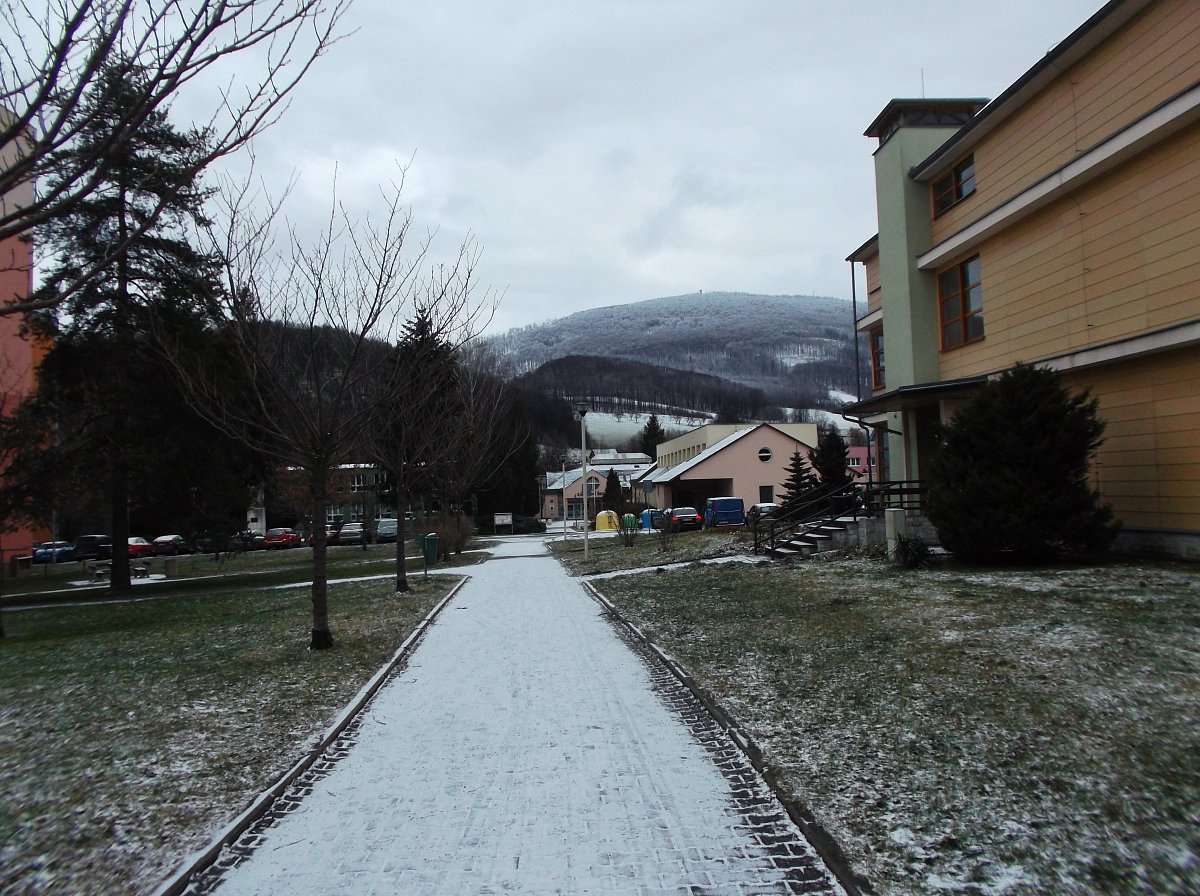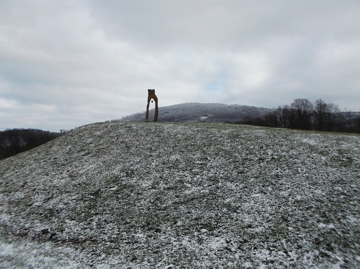 Tentokrát se parkem neprojdeme, ale obejdeme budovu nejkratší cestou. Mineme při tom uměle vytvořený kopeček, na kterém stojí zvonička jako připomínka jiného plenéru. Děti rády vyzvánějí, a rády tu jezdí v zimě na bobech. Vyfotím bochánky keřů a stavební stroje na parkovišti. Kolem potoka jdeme dál a kocháme se pohledem na Biskupskou kupu s rozhlednou. Ten obrázek se mi nikdy neokouká. Dnes je bohužel zcela nefotogenické počasí, mraky zahalují většinu nebe a je docela nevlídno.