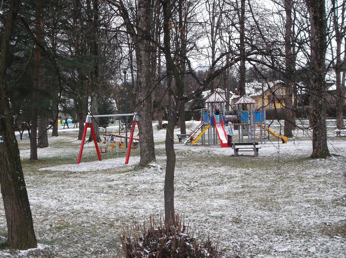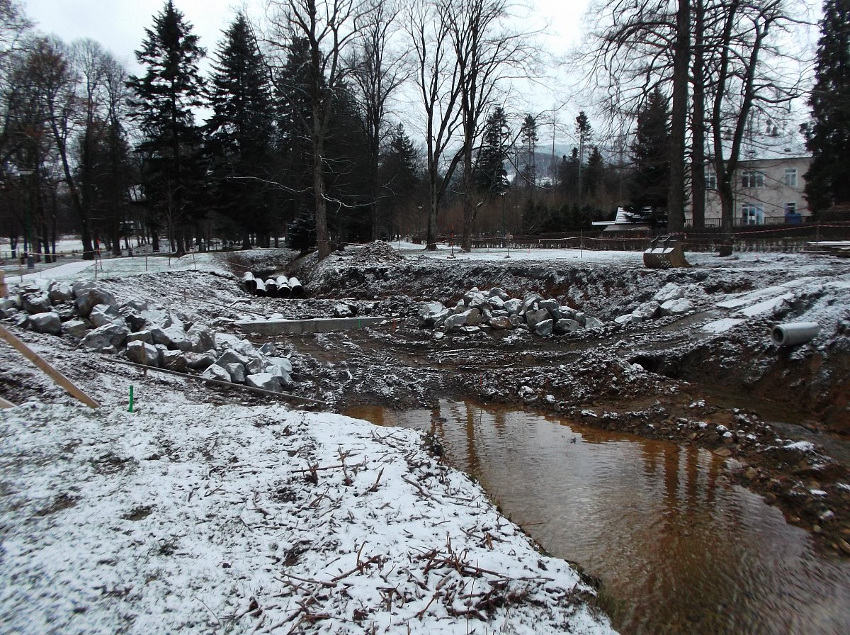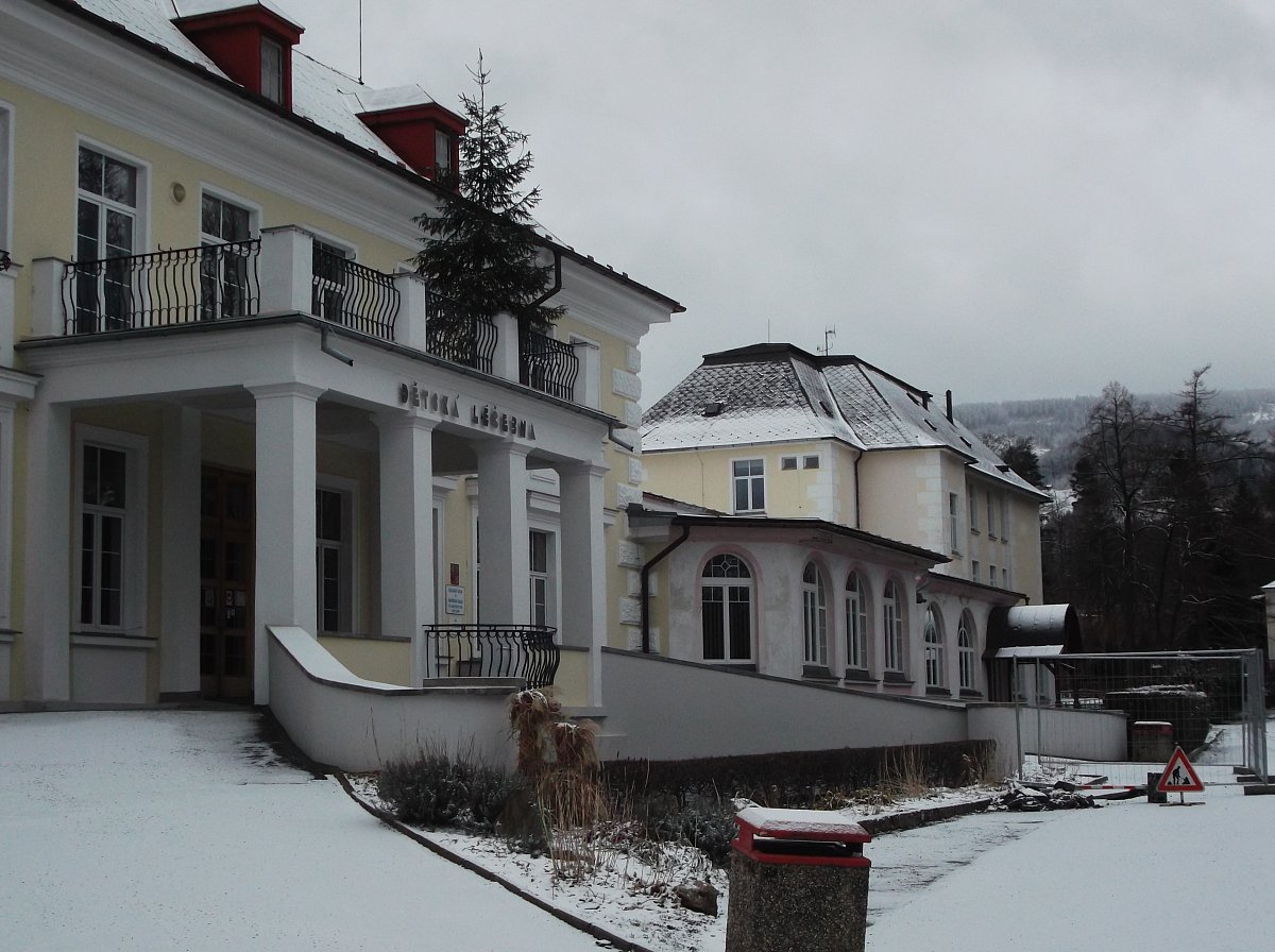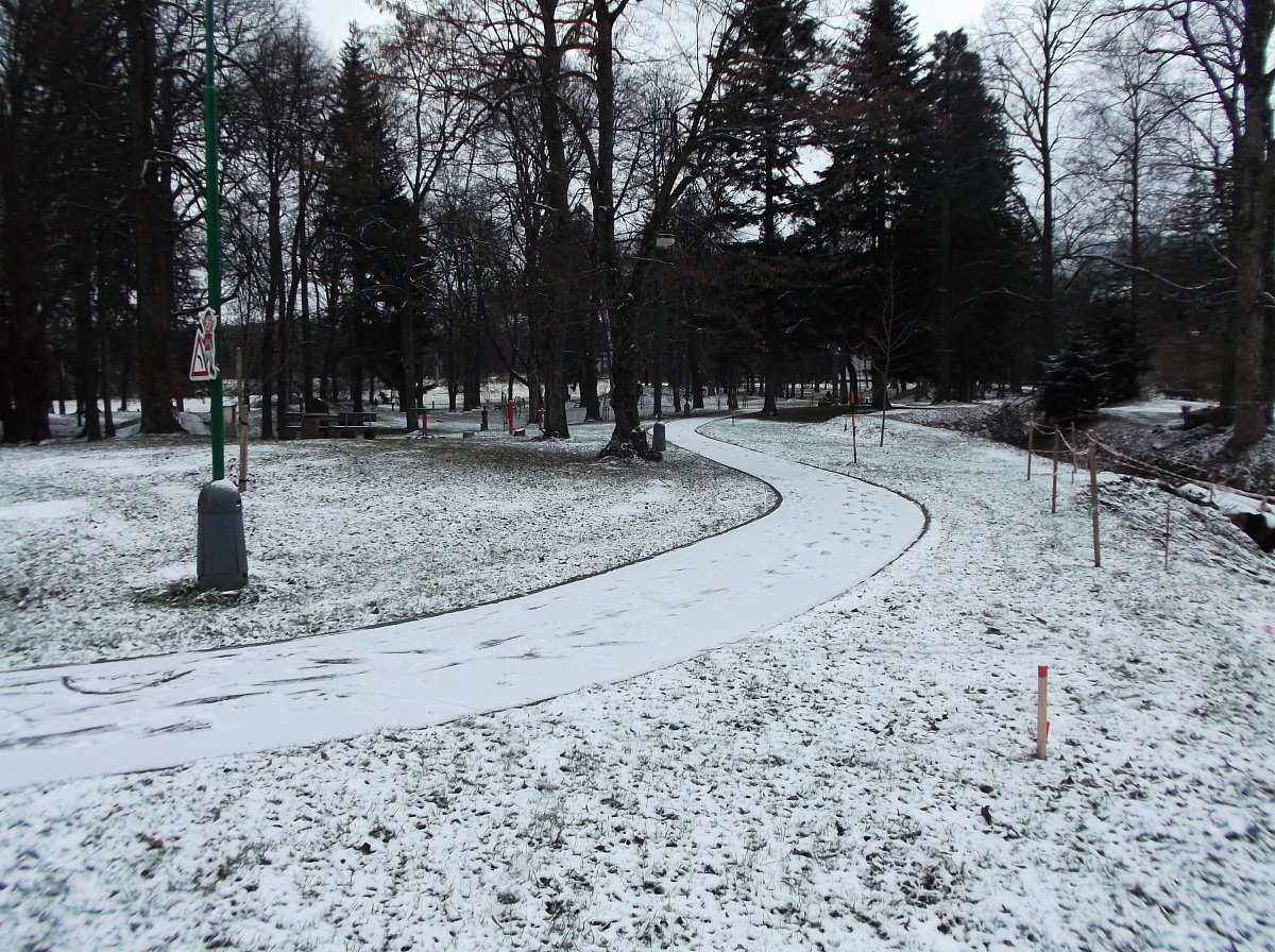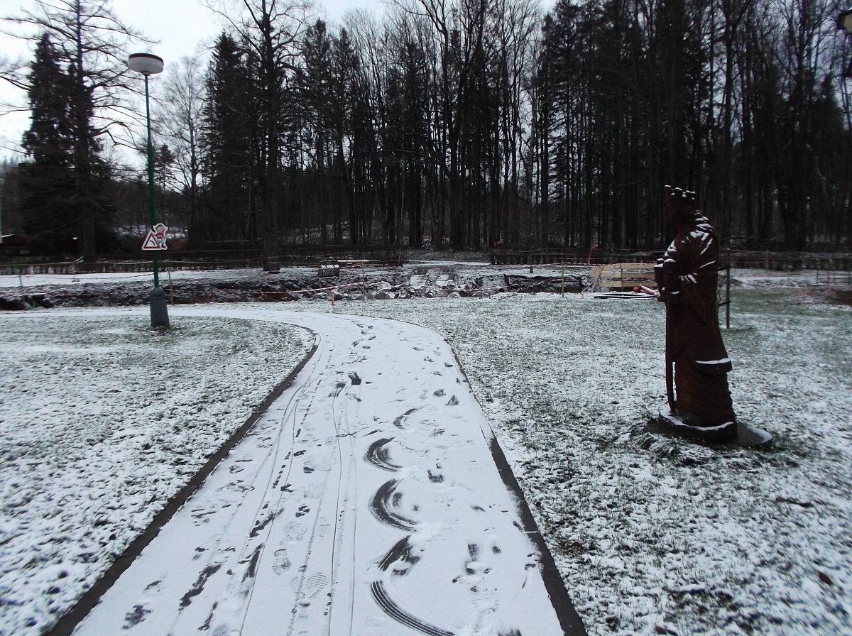 Netrvá to dlouho a dojdeme k dětské léčebně Edel, kde se zotavují děti s různými respiračními problémy. Teď je v ní ovšem prázdno a pusto, když jsou všichni o Vánocích raději doma. Jen na terase slabounce blikají světýlka na vánočním stromku. Kolem je rozkopáno, dělají se nějaké úpravy. Dokonce i na potoce, který teče kolem. Jsem zvědavá, co tam bude, ale zatím se mi to vůbec nelíbí. Na podivnou stavbu dohlíží zleva Eda a zprava svatá Barbora. Eda je ušatý skřítek, který usměrňuje dopravní ruch na okružní cestičce, a Barboru vytvořil ze dřeva některý ze sochařů na jednom z řezbářských plenérů, které se v parku občas konají.