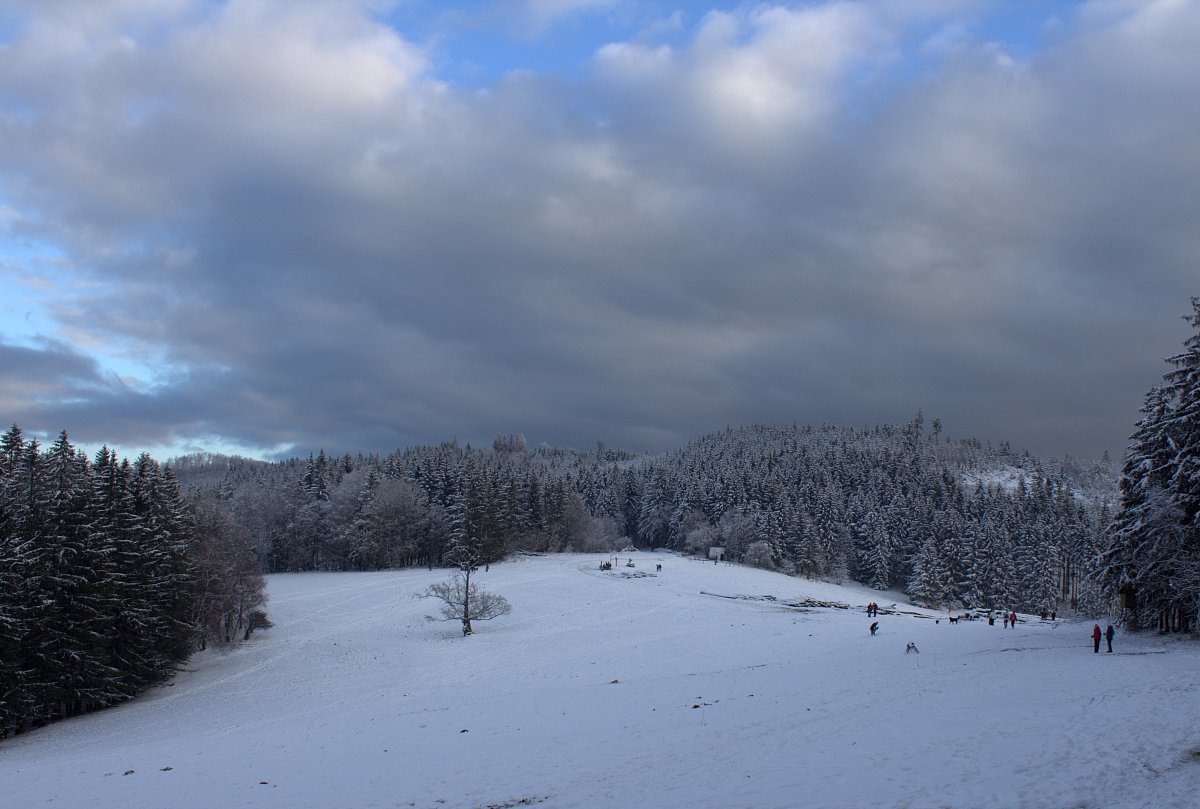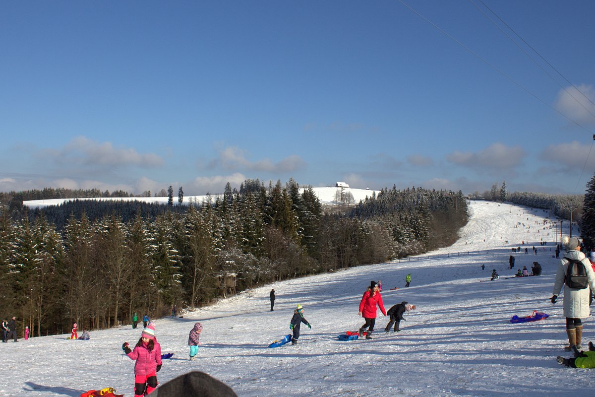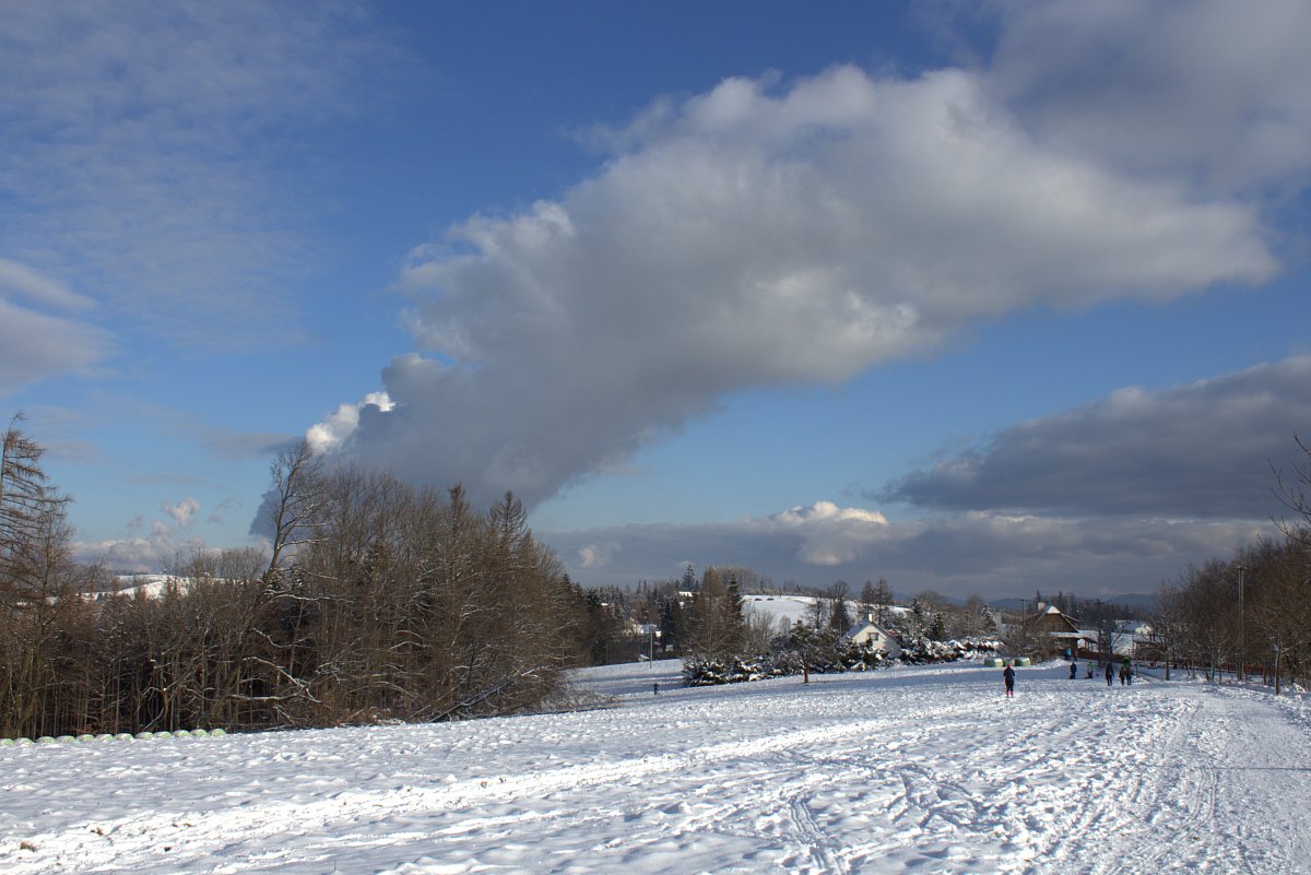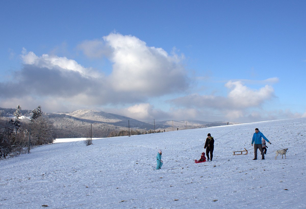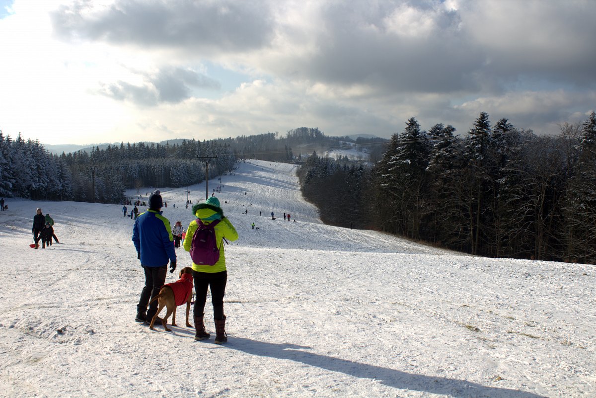 Den byl jako vymalovaný, modré nebe, námraza na stromech a asi deset cm sněhu - taková správná Ladovská zima. Bílé svahy se hemžily barevným rodinkami s malými dětmi, sáňkami a různými plemeny pejsků od malých až po ty velké.