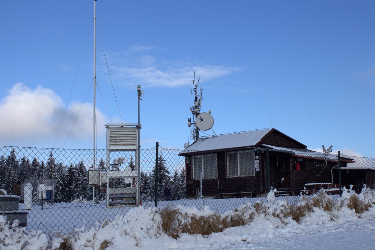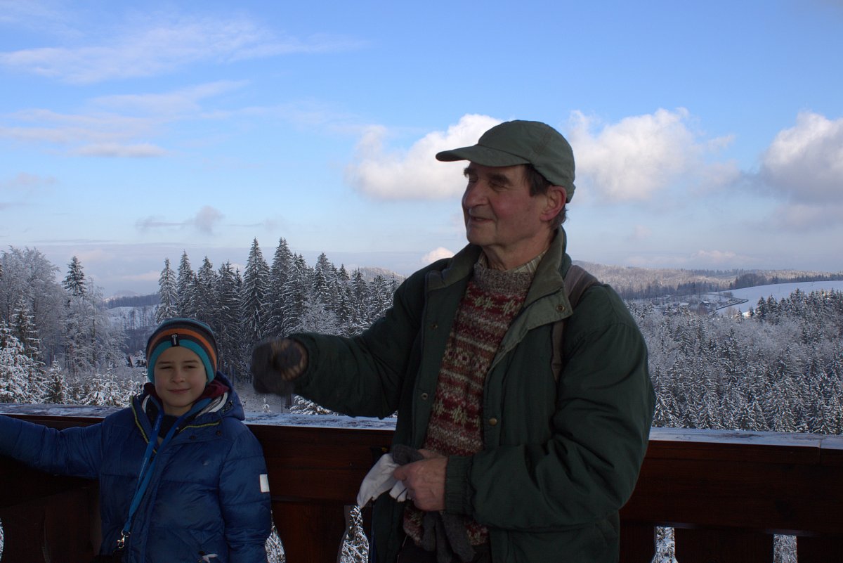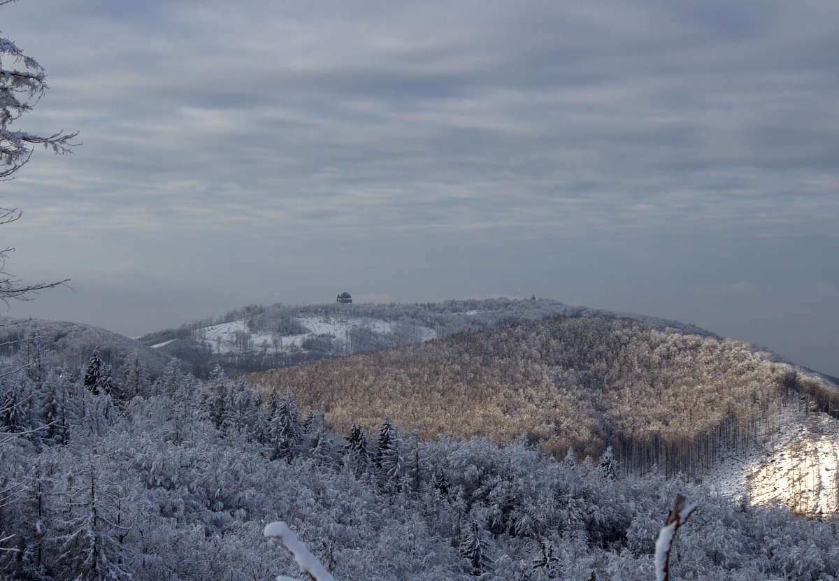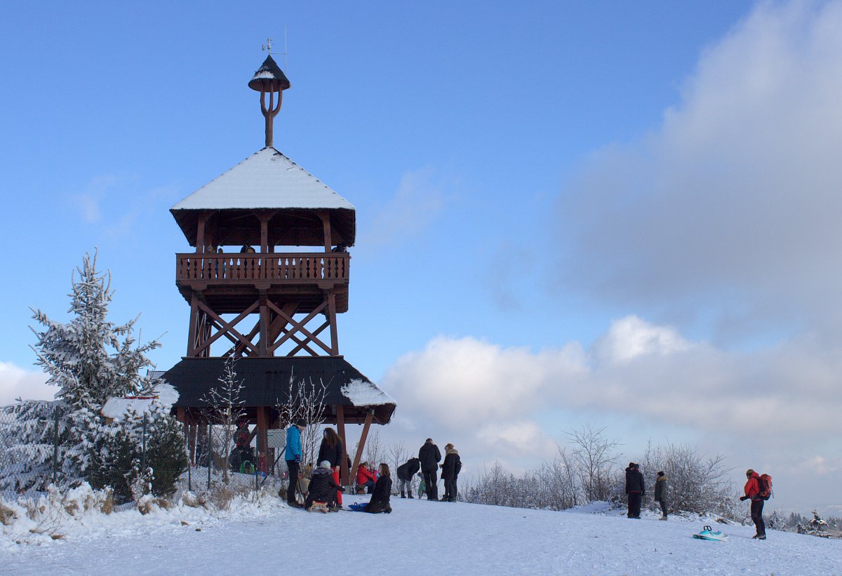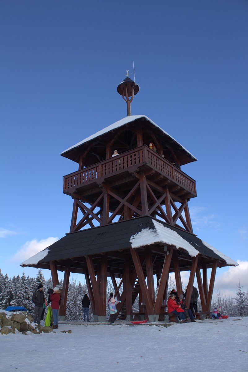 Vydali jsme se po zasněženém svahu směrem k prvnímu cíli naší cesty, k rozhledně Marušce. Výhledy na Hostýnské hory, na Čerňavu, na Kelčský Javorník byly okouzlující. Stejně tak i na druhou stranu, na Valašsko a na větší hory - Beskydy. Staré dřevěné chaloupky se krčily mezi zasněženými stromy. Rozhledna nás překvapila svou výškou, byla na rozhlednu hodně malá. Hned vedle stála meteorologická stanice se všemi stožáry a měřícími přístroji, co zaznamenávají teplotu, tlak vzduchu, rosný bod.... Dřevěné schody nahoru na rozhlednu byly hodně úzké a namrzlé, takže, hlavně cesta dolů, byla cesta tzv. o život. Výhledy do kraje však stály za to riskování.