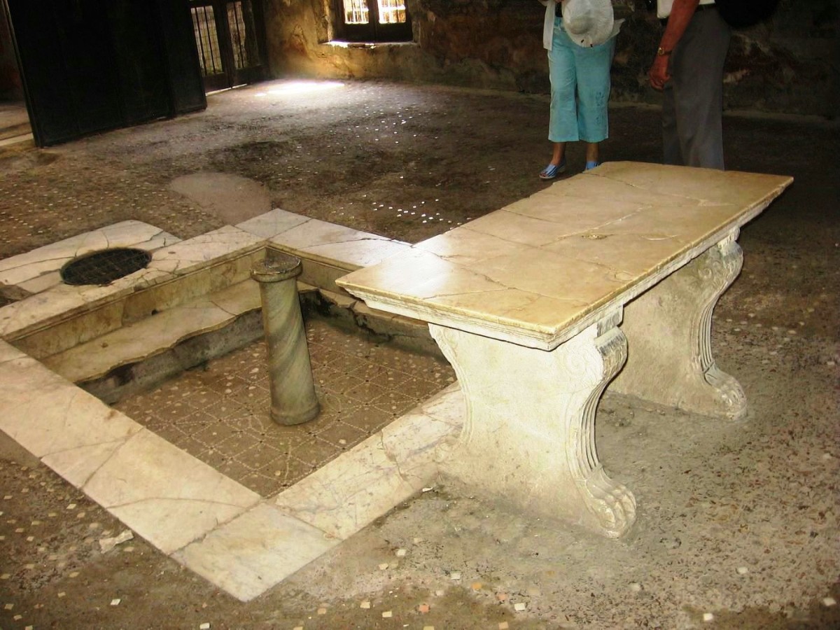 Nejvíc mne pobavil starověký „Mekáč“ – pouliční vývařovna, která bývala prý skoro v každé ulici, neboť staří Římané se tam rádi a často stravovali. Jejich oblíbenou pochoutkou bývala rybí omáčka – garum. Někteří ji ovšem nemohli vystát, pomlouval ji i Plinius a Seneca. Byla jantarově zbarvená a měla samozřejmě specifický zápach, protože se vyráběla fermentací z kvašených ryb se solí. Existovaly ovšem ale i jiné varianty smíchané s vínem nebo medem či octem. Lili si ji prý v hojném množství skoro na všechno, asi tak jako spousta z nás dnes kečup či  sojovou omáčku nebo maggi. Manufaktury na tuto omáčku byly nalezeny i v Pompejích a v Herkulaneu při těchto vývařovnách dokonce pak i zbytky různých jídel, podle kterých archeologové mohli zjistit, co se tehdy jedlo. Výroba zanikla, když se rozpadlo Římské impérium a byla uvalena daň na sůl. Jinak tato omáčka byla zřejmě velice drahá, kolem dnešních 500 dolarů, levná se vyráběla pro otroky. Podobná se dnes ještě vyrábí i v malé oblasti u Neapole. No – mohla být třeba i zdravá (nebýt té spousty soli), ale mně vstaly málem všechny vlasy na hlavě i při jejím pouhém popisu…