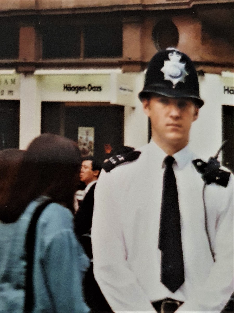 -SOHO, čínská čtvrť a fešný anglický bobby jak vyšitý z magazínu. Samozřejmě objeven mou tehdy náctiletou dcerou. A tak jsem je oba vyfotila, bobbík se vůbec nebránil, zrovna tak jako „Pán krkavců“ v Toweru“, který byl starší a se kterým jsem se vyfotila pro změnu i s deštníkem já.