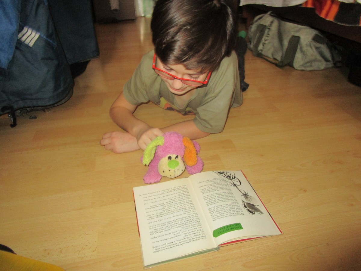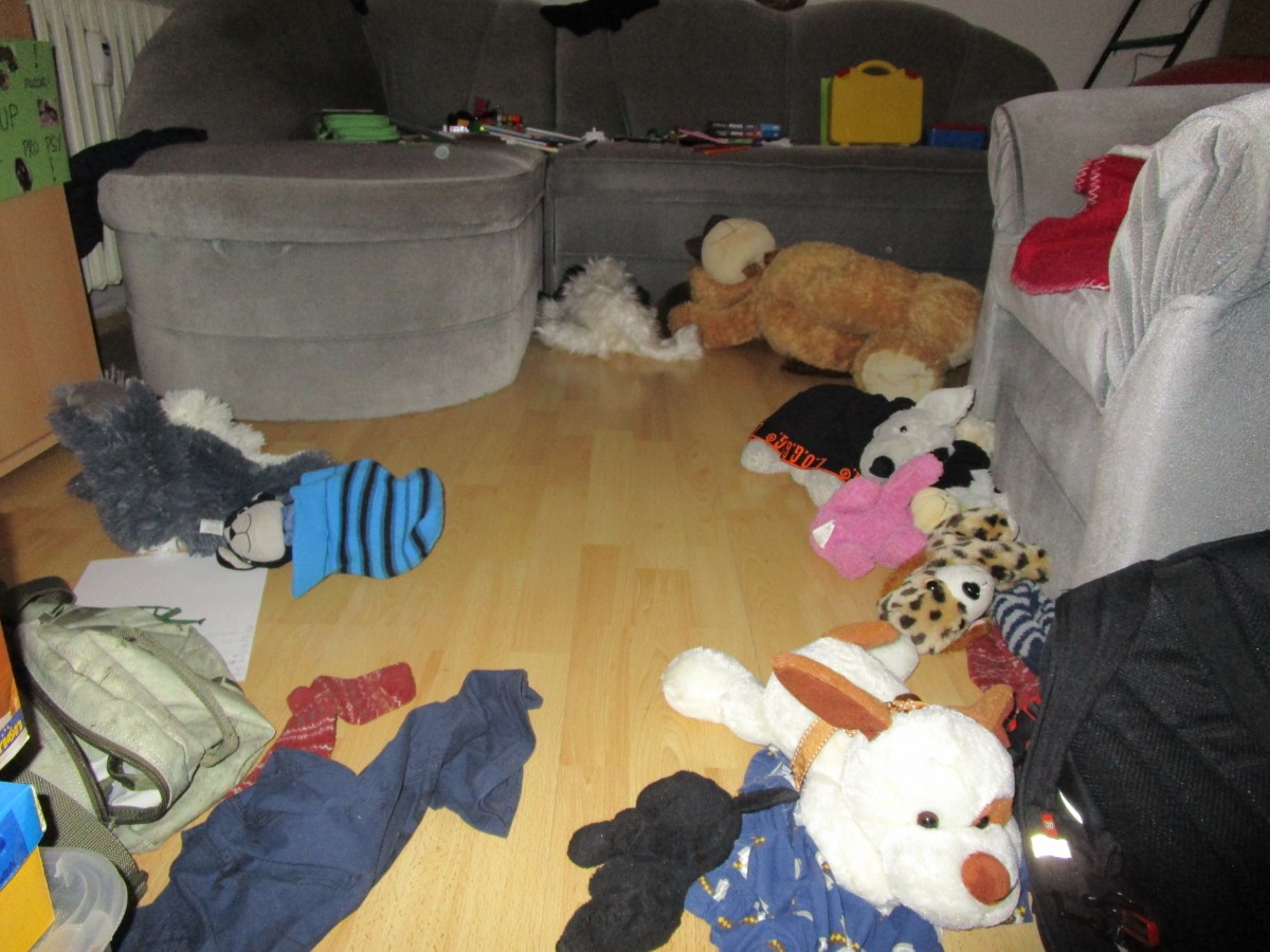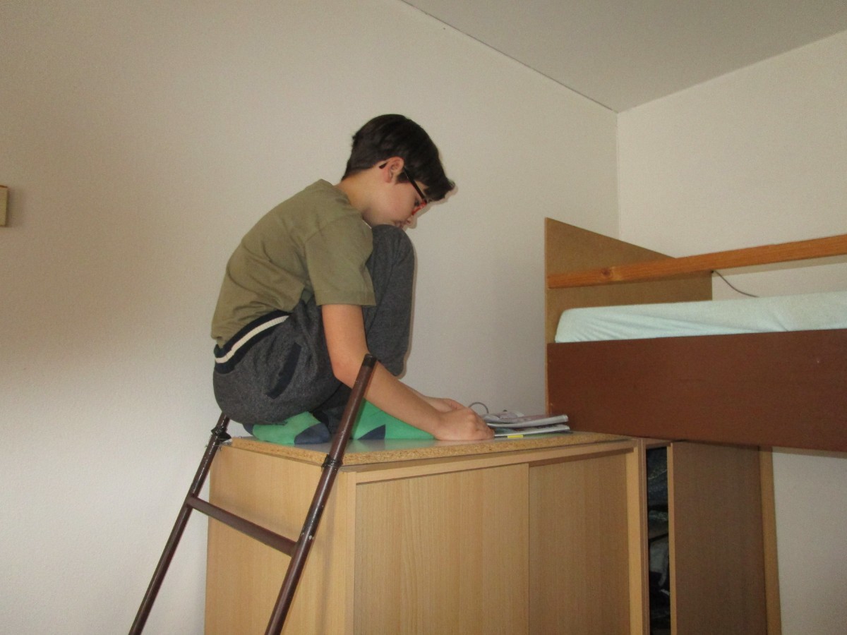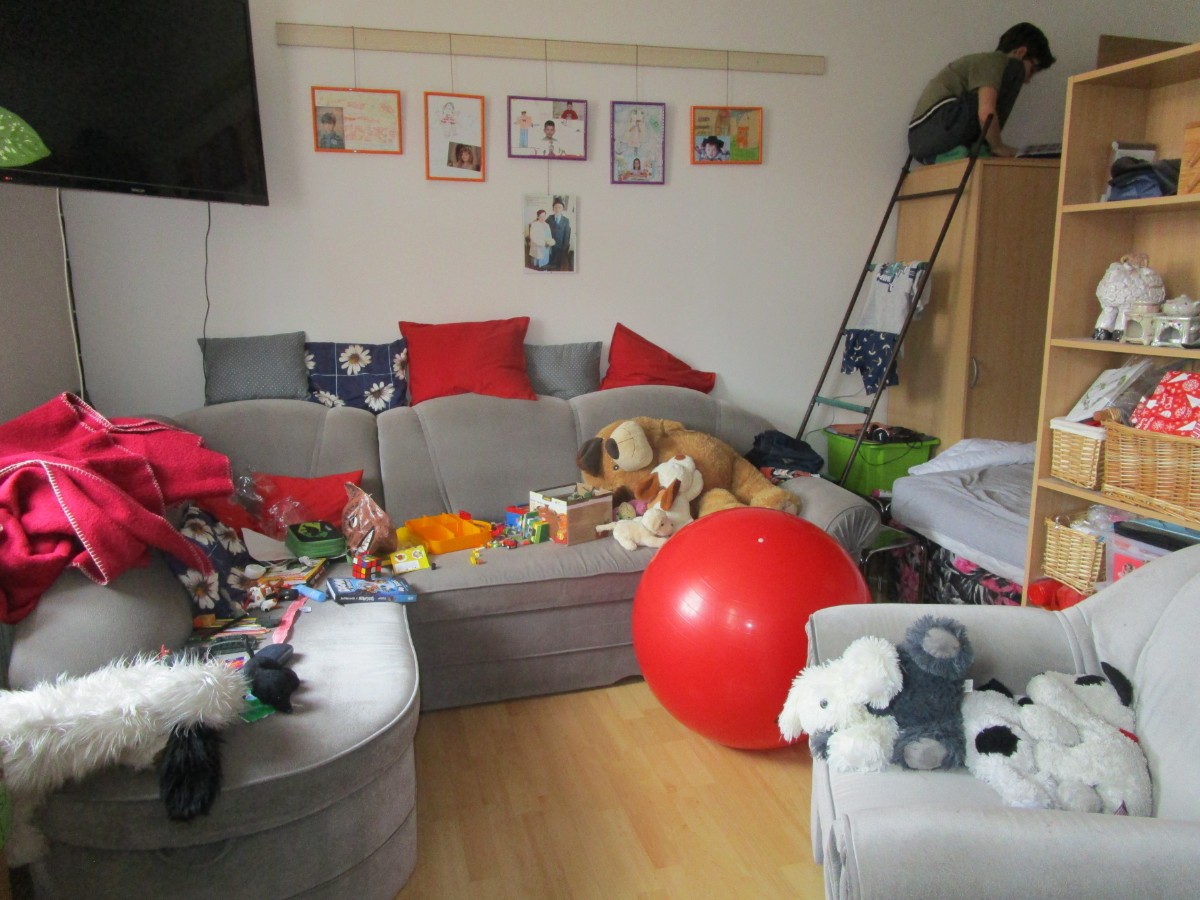 A kde je vlastně dítě? Chudinka si čte na skříni, protože opravdu není si kam sednout.