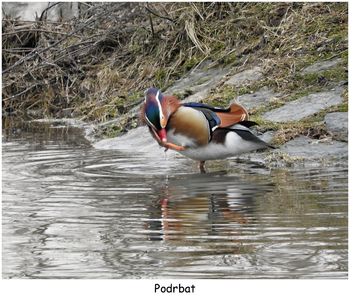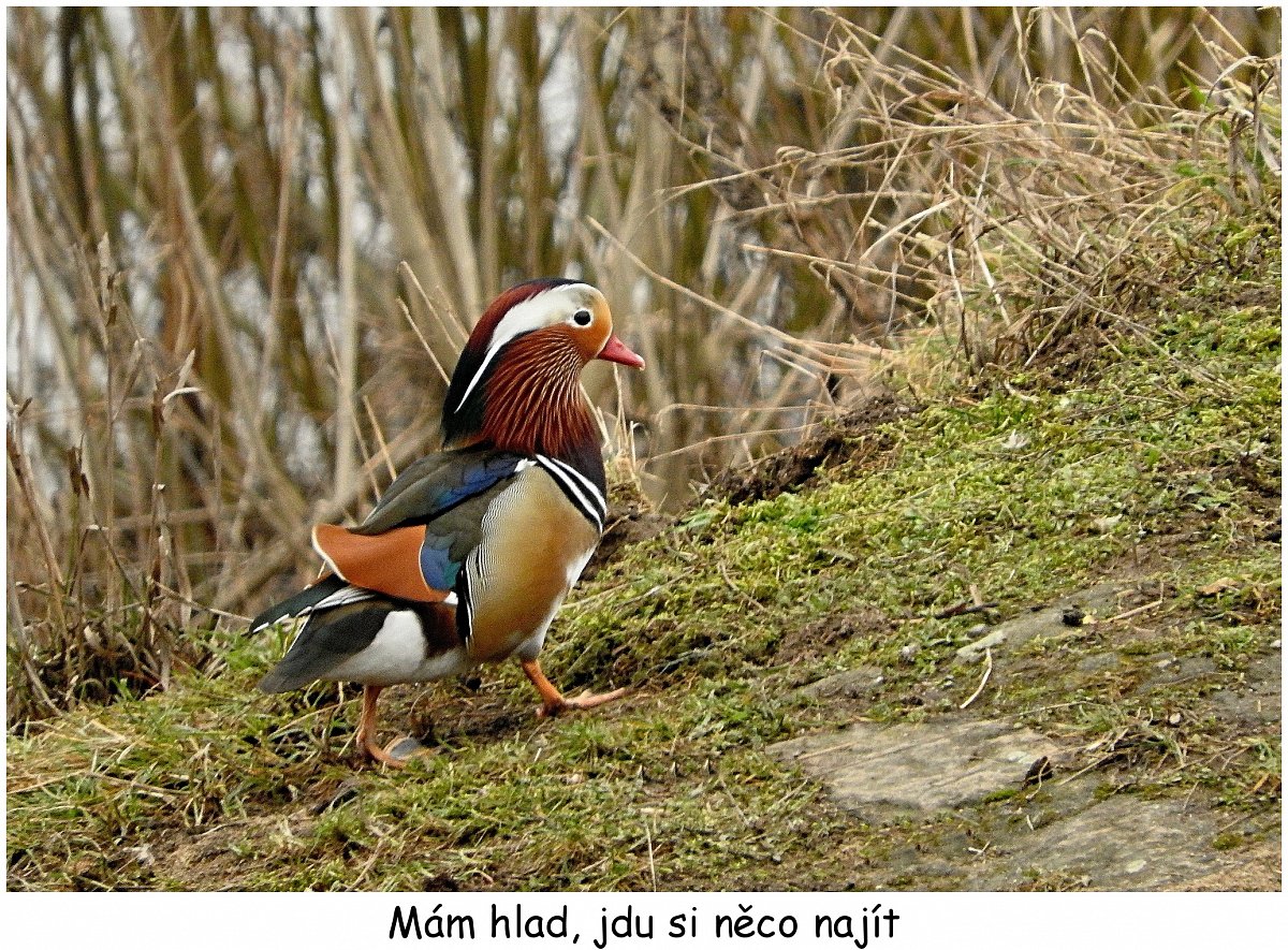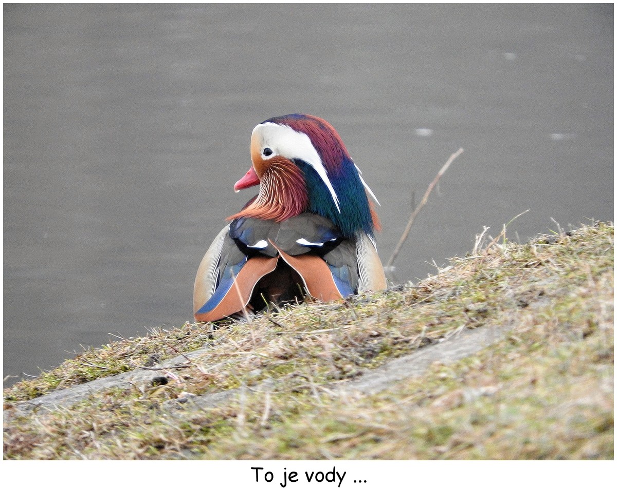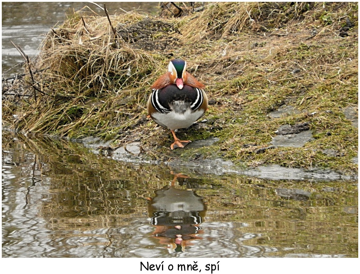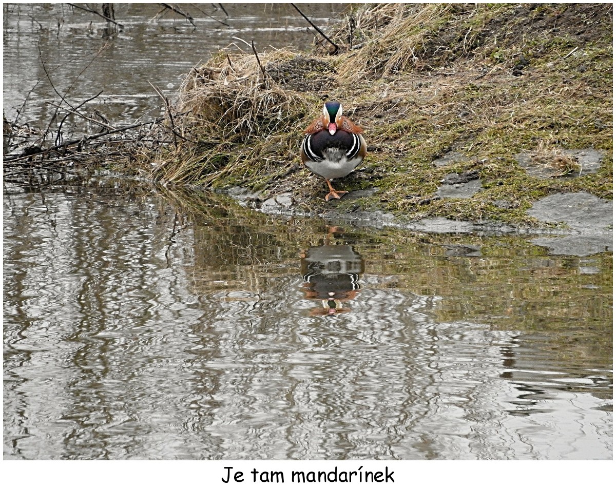 Došla jsem k takové malé zátoce, spíš prohlubni na břehu řeky. Běžně se tudy chodí suchou nohou, teď se však naplnila vodou z řeky. Dívala jsem se přes ni a chystala se jí obejít, když mě zaujala okem neidentifikovatelná hromádka. Zvětšila jsem si ji objektivem foťáku a užasla jsem. Seděl tam totiž hotový krasavec - sameček kachničky mandarínské. Už jsme ho na řece měli asi před třemi nebo čtyřmi lety, ale od té doby jsem ho neviděla. V našich krajích není domovinou, takže nejspíš frnkl z nějakého chovu.