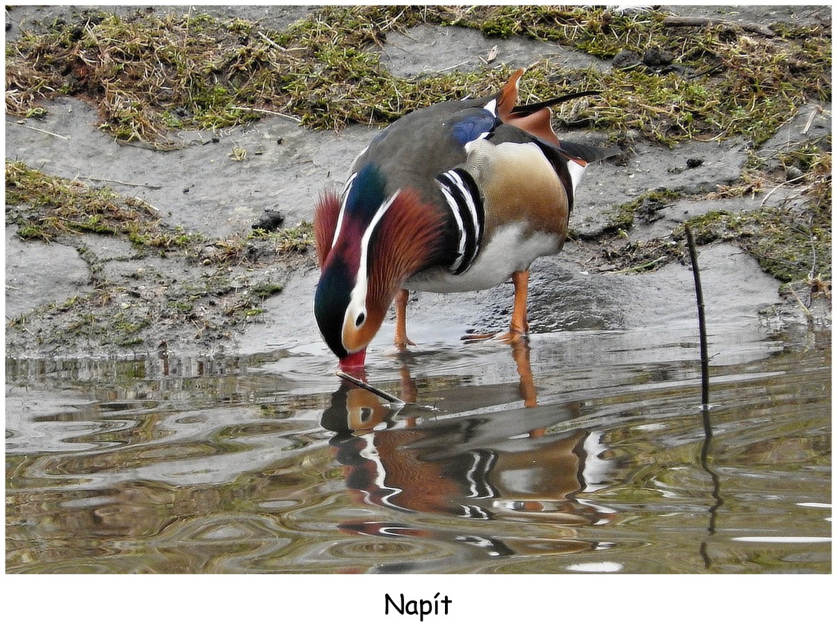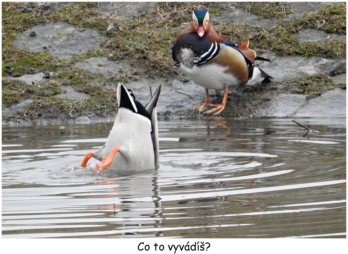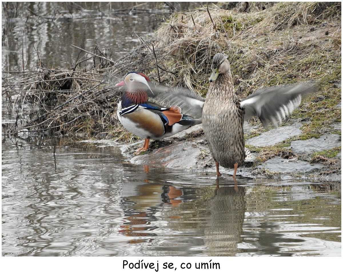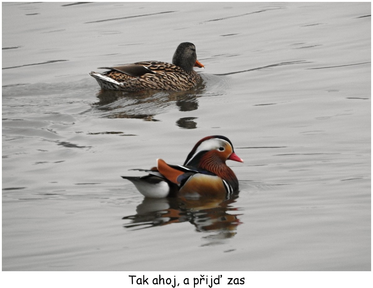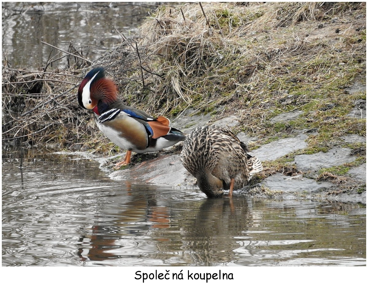 Došla jsem k takové malé zátoce, spíš prohlubni na břehu řeky. Běžně se tudy chodí suchou nohou, teď se však naplnila vodou z řeky. Dívala jsem se přes ni a chystala se jí obejít, když mě zaujala okem neidentifikovatelná hromádka. Zvětšila jsem si ji objektivem foťáku a užasla jsem. Seděl tam totiž hotový krasavec - sameček kachničky mandarínské. Už jsme ho na řece měli asi před třemi nebo čtyřmi lety, ale od té doby jsem ho neviděla. V našich krajích není domovinou, takže nejspíš frnkl z nějakého chovu.
