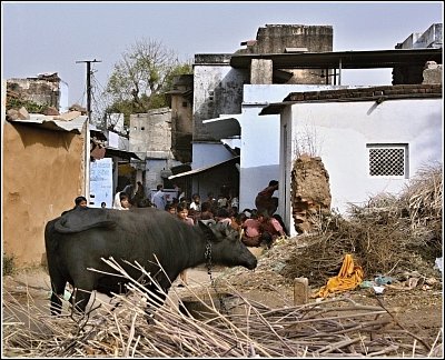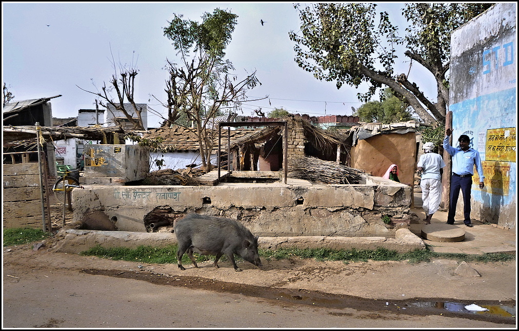 Mikrobus jsme nechali na kraji vesnice a vyrazili do ulic. Podle čuníka lze soudit, že zde žijí spíš hinduisté.