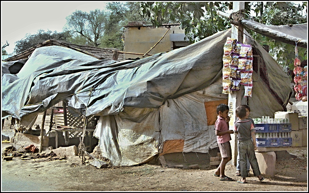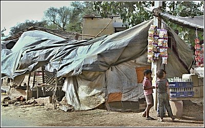 Krámek v Abaneri. Sáčky, na něž ti kluci koukají, obsahují velice chutné oříšky a stojí pár korun. Vyzkoušeno.