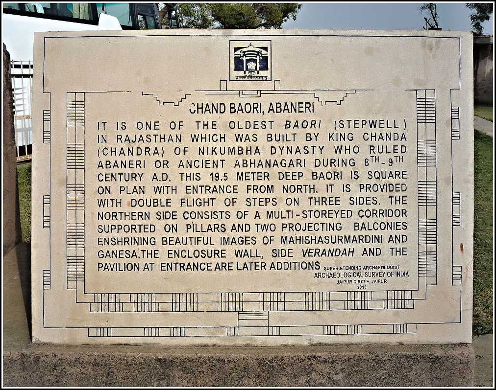 Ukázalo se, že nepřístupný chrám bohyně Haršat Mata není jedinou zdejší pamětihodností. Prokličkovali jsme vesnicí a stanuli před naučnou cedulí u vchodu do hinduistické památky prvního řádu – Čand Baori.