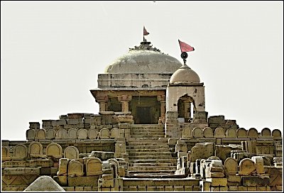 Nejprve jsme mysleli, že se máme seznámit s životem na indické vesnici a rozdat nějaké ty bakšiše, ale pak se před námi ukázal v celé své kráse chrám bohyně Haršat Mata. Haršat Mata je místní jméno bohyně štěstí a radosti. Chrám byl založen někdy v 8. století a funguje dodnes. V době naší návštěvy byl bohužel zavřený, takže jsme si nemohli prohlédnout jeho údajně zajímavou výzdobu.