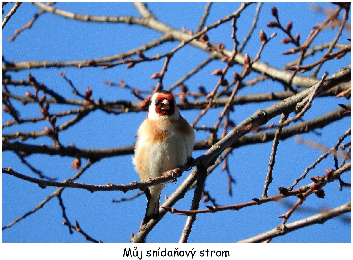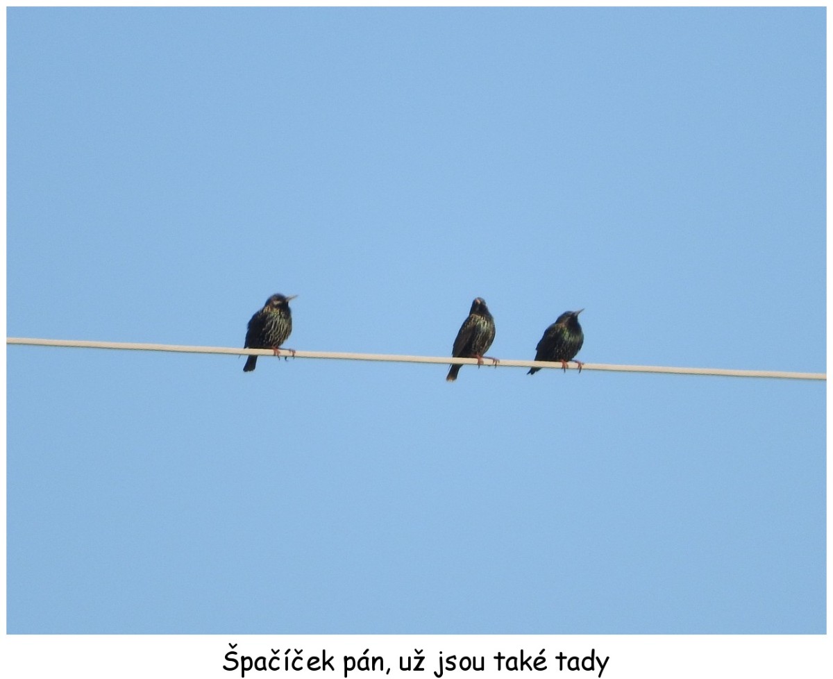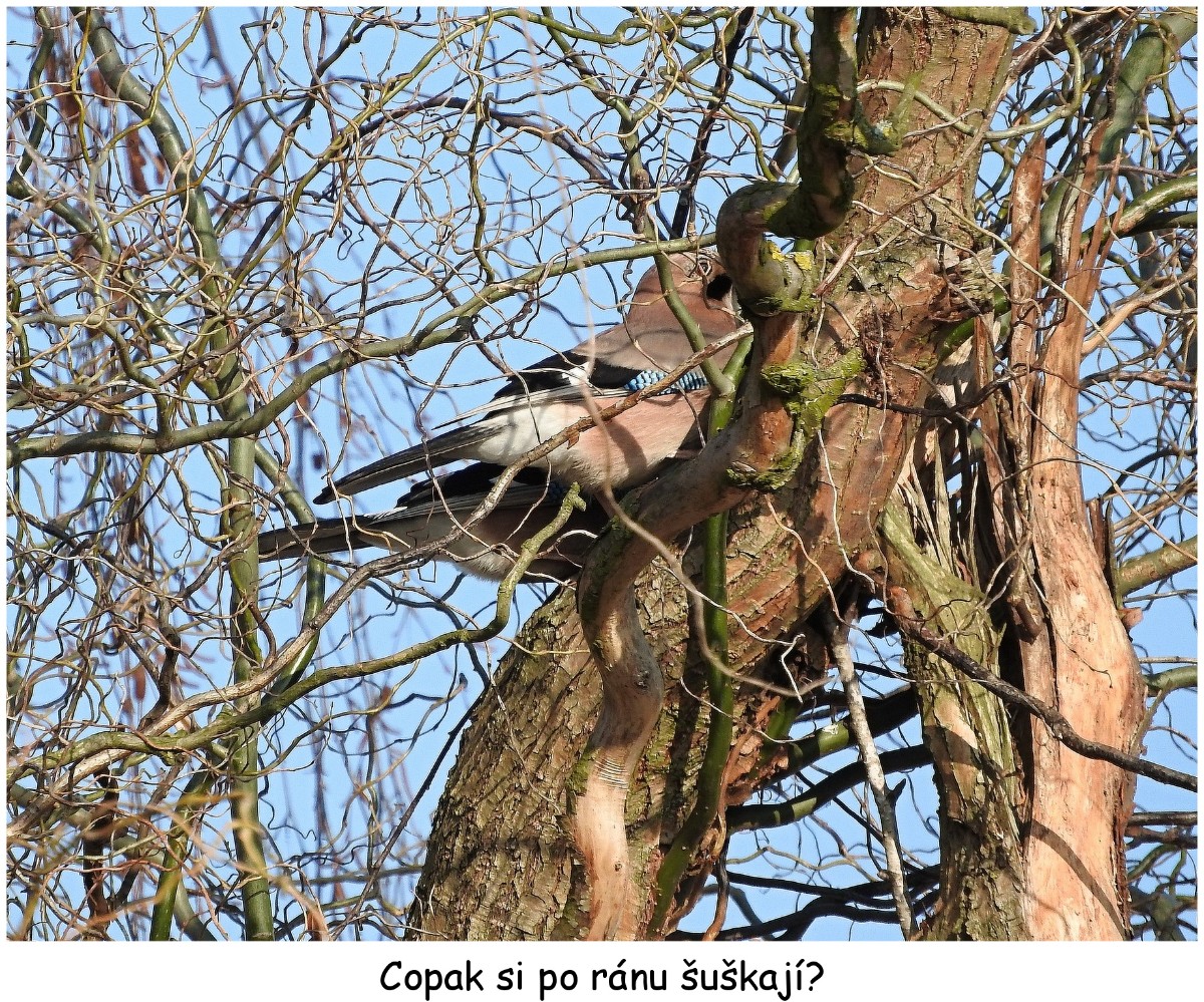 Teď tedy máme začátek března a příroda se pomalu probouzí. Sluníčko se snaží a brzy vyžene šedivou námrazu i ze zatím stinných koutů. Vrabčáci si natřásají peří před svými obýváky v okapu u garáží, straky začaly s jarním úklidem ve svém hnízdě, holubi hřivnáči se vrátili ještě dříve než špačci, hrdlička pospává na drátě, mezi větvičkami se proplétají stehlíci a loví si svou snídani, sojky si šuškají o lásce, zajíce ještě trochu zebou nožky a kavky se vystavují jako modelky na anténě.