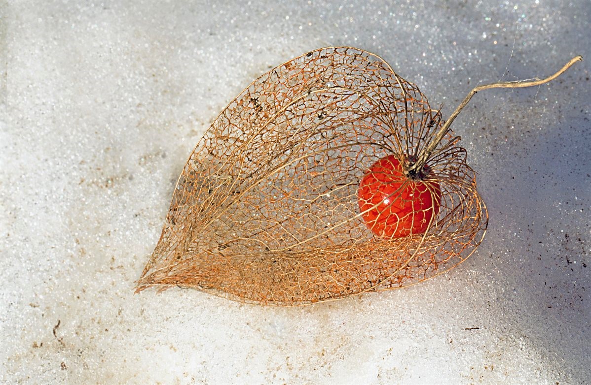 V lednu mě okouzlil Drahokam. Jasně červená třešnička zakomponovaná v přírodním filigránu. Neskutečná proměna mochyně, toho oranžového lampionku, který od podzimu zůstal ležet na sněhu, aby svou krásou přilákal Aničku Čípovou.