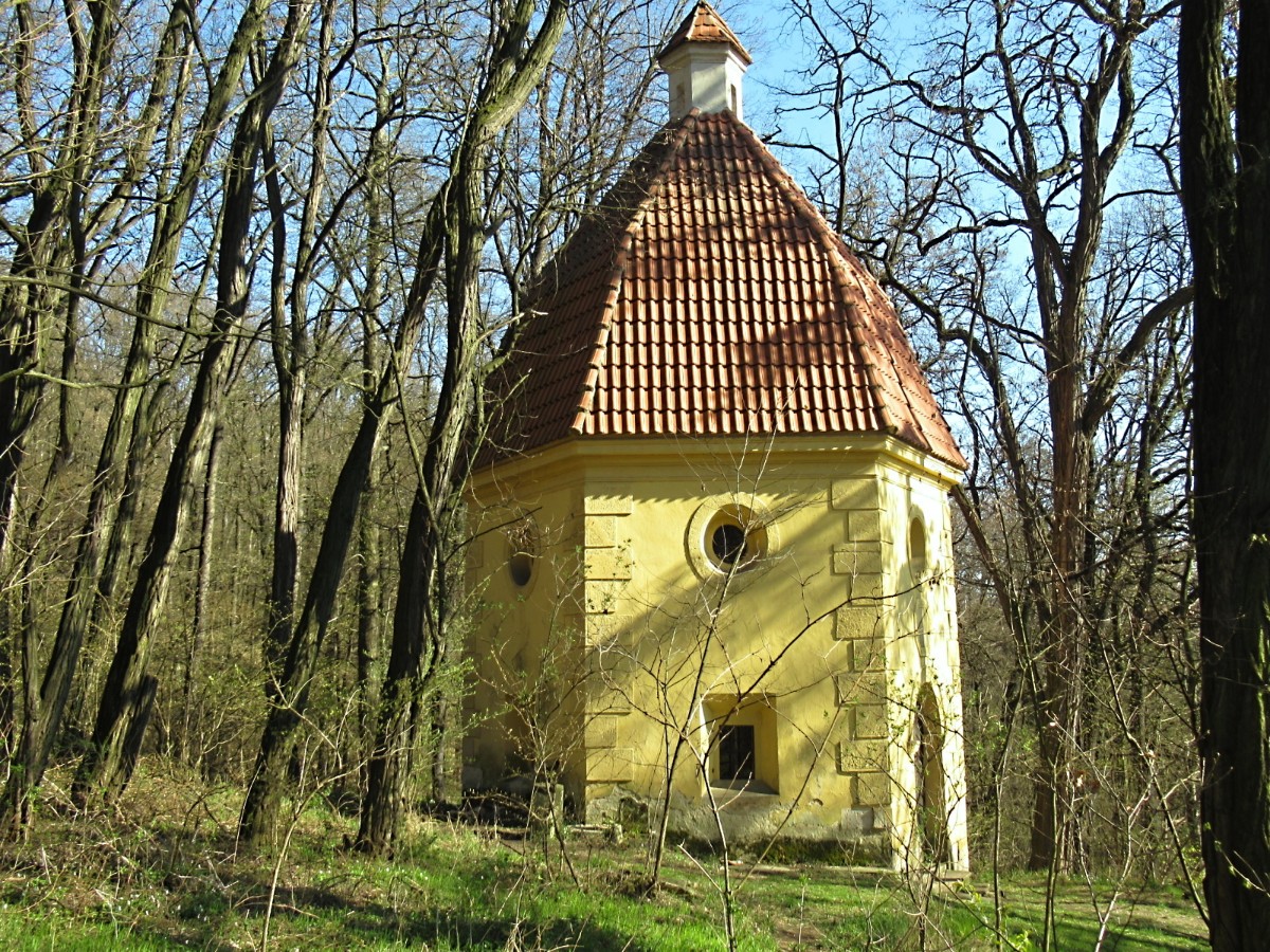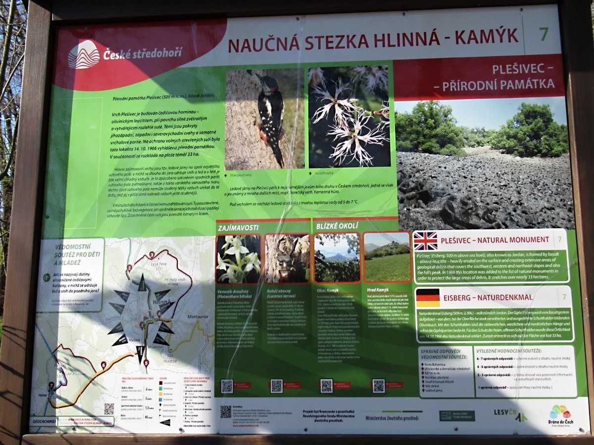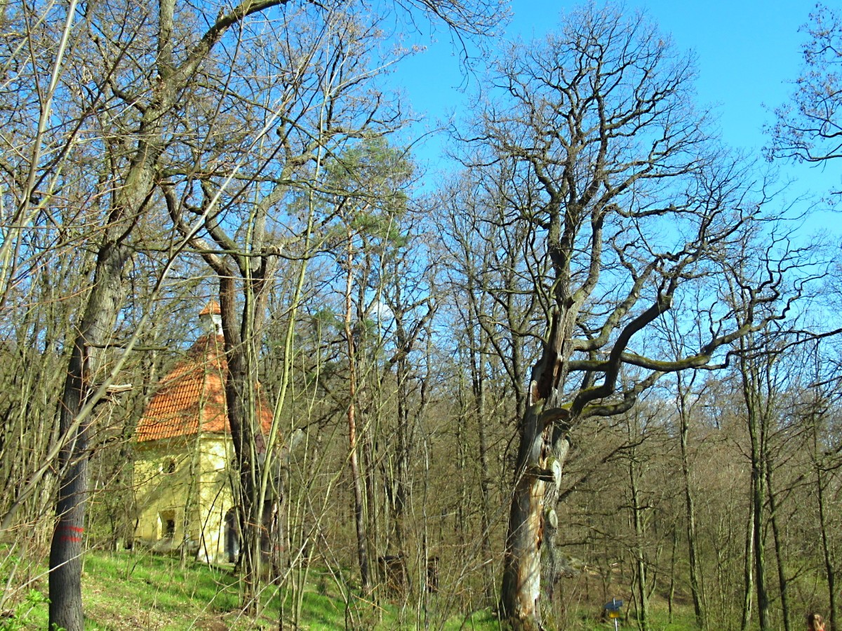 Vyrazili jsme tedy přes louky do lesa, který se nachází na vrchu Plešivec, ten tvoří čedičový kužel vulkanického původu, nachází se 5 km od Litoměřic, Tlučeň a Hlinná jsou nejbližší vesnice. V lese se nachází kaplička sv. Jana Křtitele z r. 1660, ležící 510 m n. m. Od r. 1966 je okolí kapličky přírodní památkou. Od kapličky je krásný výhled, tedy pokud je úplné jasno, na vrchy Českého středohoří. Bližší info najdete na netu.