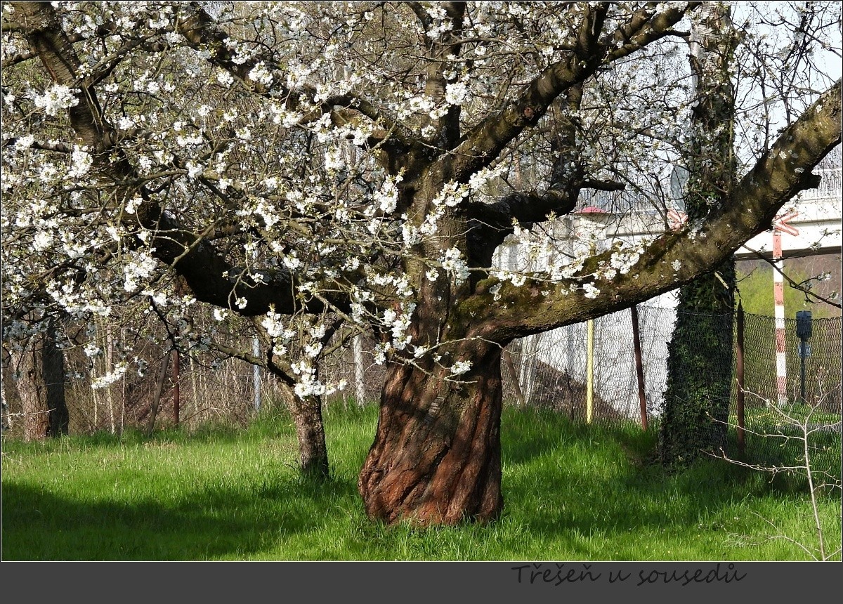 Cože, vy mi nevěříte? A dobře děláte. Třešeň v zahradě sousedi opravdu mají, ale soused pod ní nesedává. Je již pár let po smrti, a jestli pěje písně, tak jsou to písně z andělského kůru. Byl to moc šikovný a ochotný klempíř, nevím, jestli uměl zpívat, ale zato jeho ruce mu měli pozlatit. A to mi věřte!