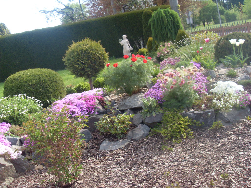 Na úvodní fotografii ukazuji nádhernou skalku z letošního krásného úterního rána 11. května.  Vím dobře co dá práce ji v tak hezkém stavu udržovat. Bohužel není moje. Dříve jsem mívala i dvě skalky, na jedné jsem měla dokonce i růžová srdíčka, která jsem dostala darem od jedné listonošky.